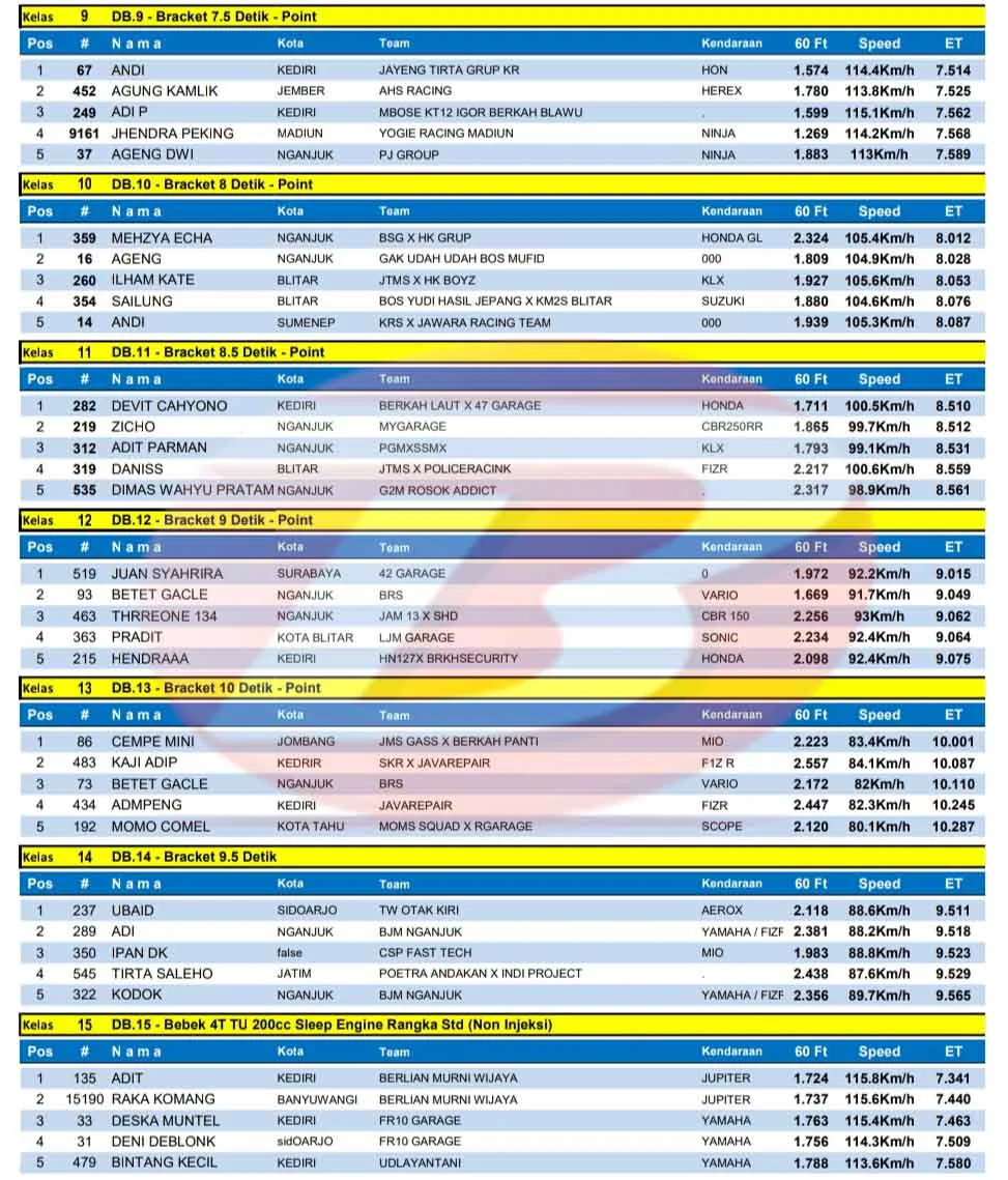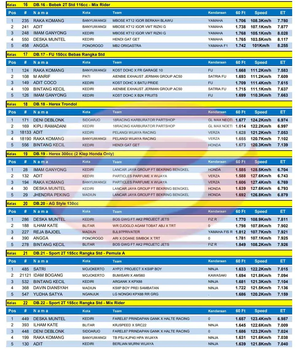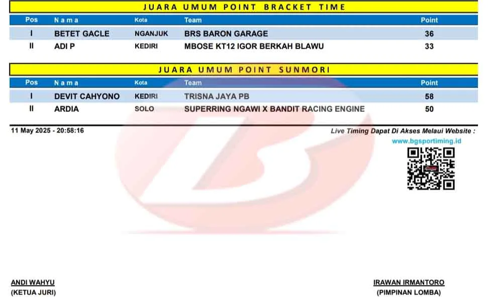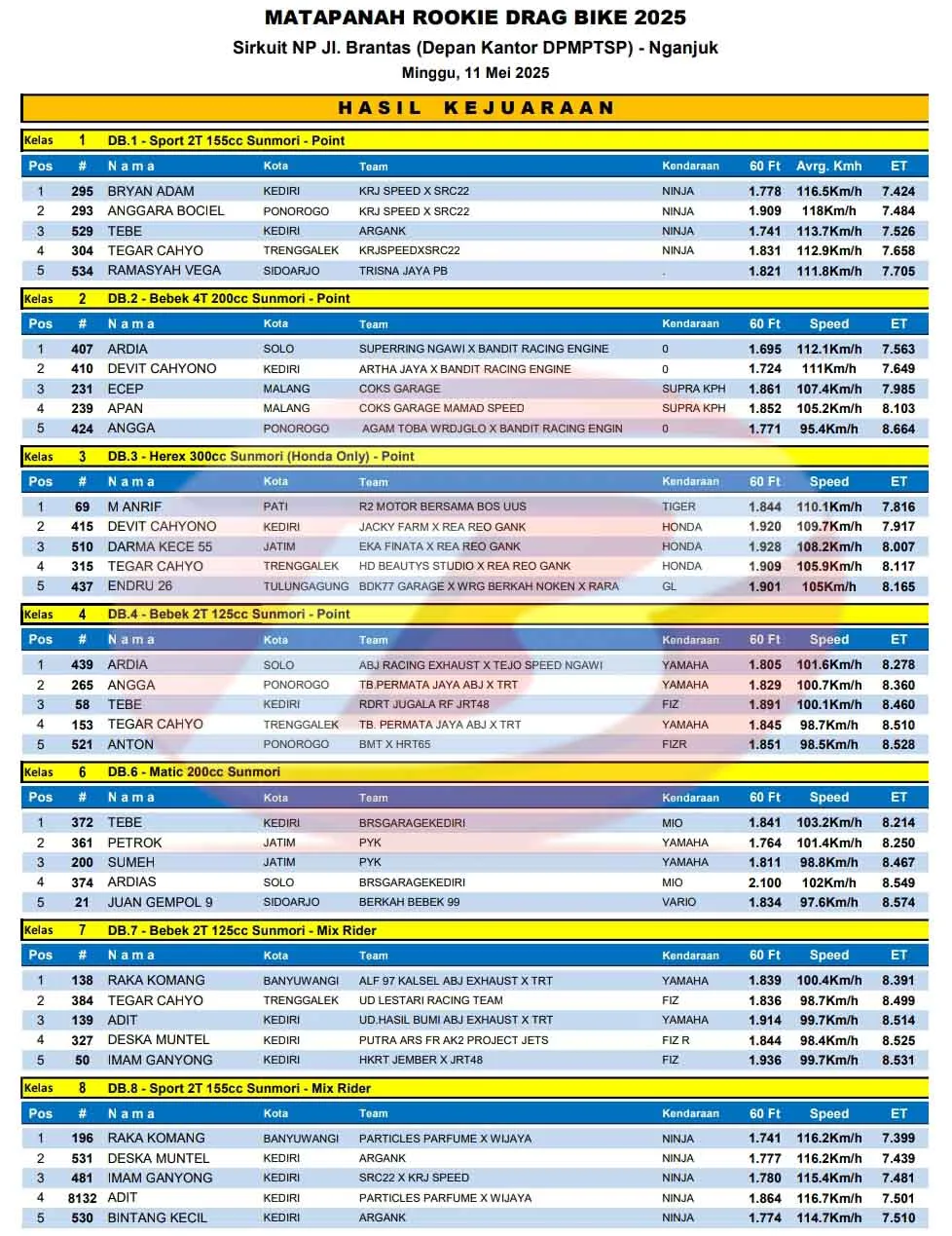 BalapMotor.Net – Berikut merupakan hasil kejuaraan balap lurus Matapanah Rookie Drag Bike 2025 yang berlangsung di sirkuit NP. Jln. Brantas, Nganjuk, Jawa Timur pada Minggu 11 Mei 2025. (**)