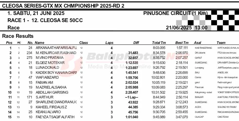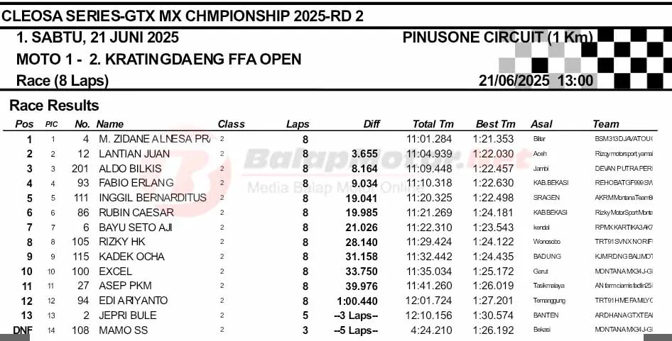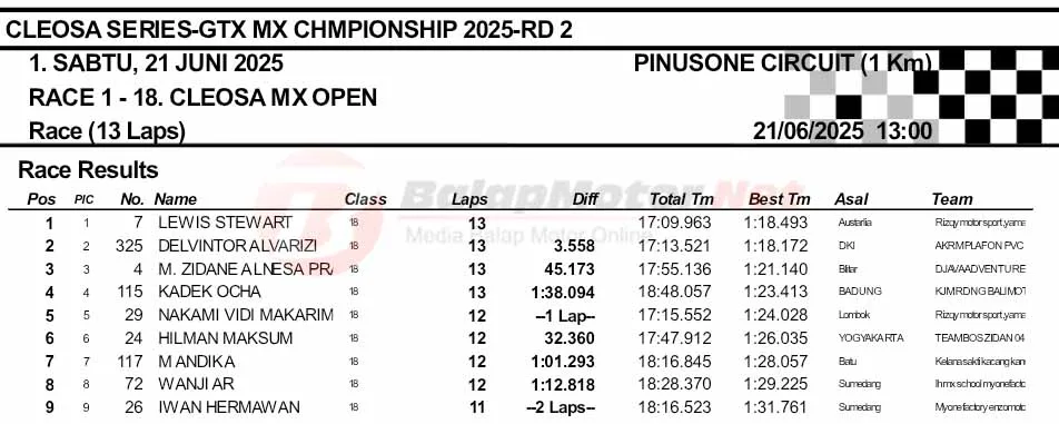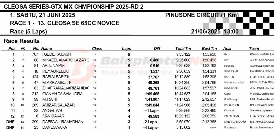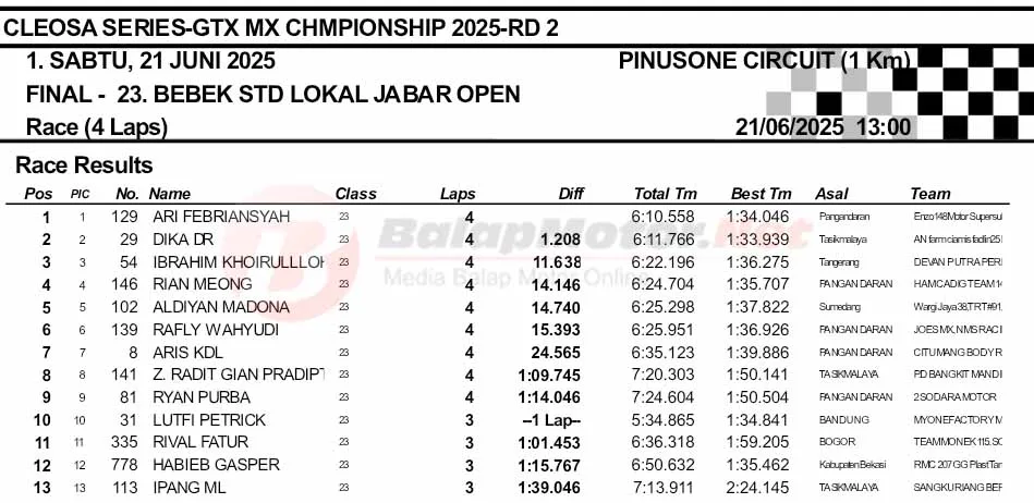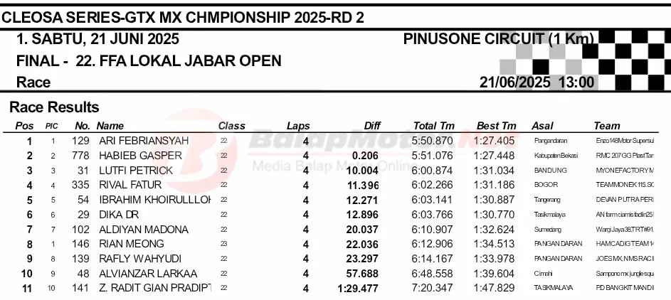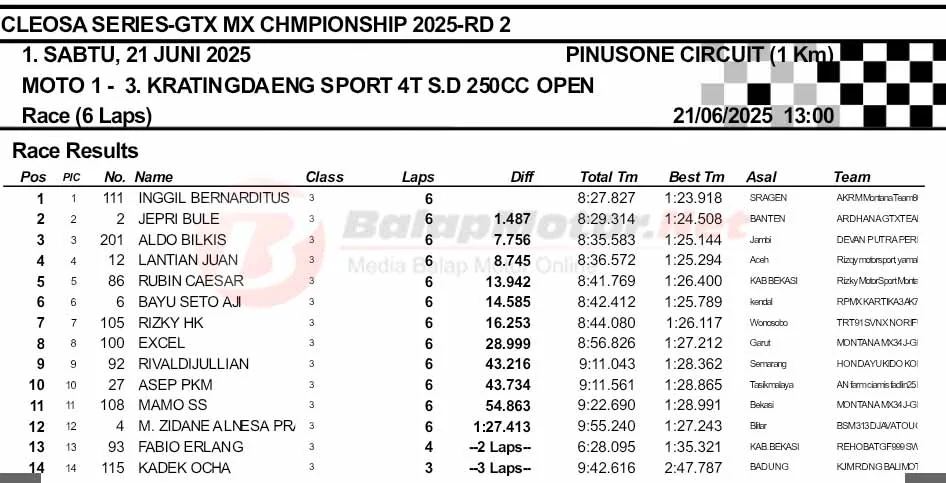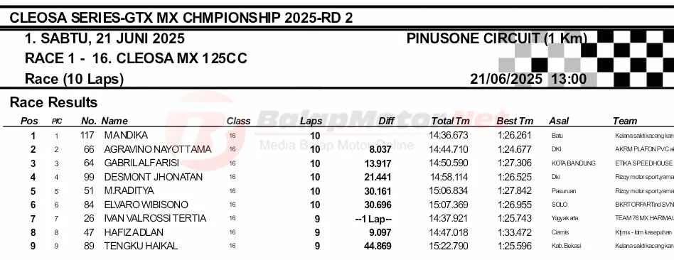 BalapMotor.Net – Berikut merupakan hasil final dan Moto1 Cleosa Series Grasstrack & Motocross Championship putaran kedua yang berlangsung di sirkuit Pinusone, Batukaras, Pangandaran, Jawa Barat pada Sabtu 21 Juni 2025. (**)
