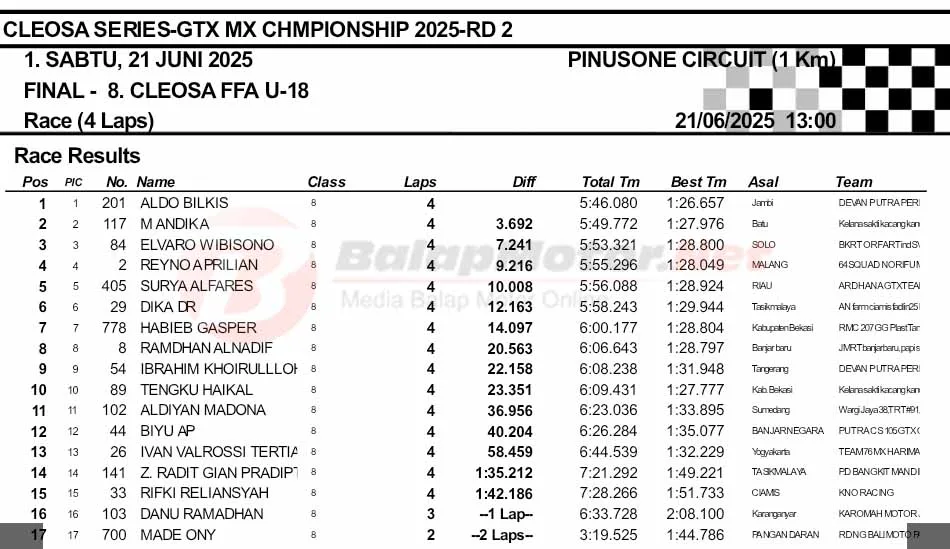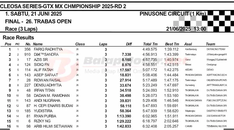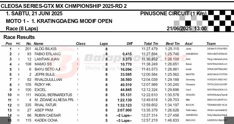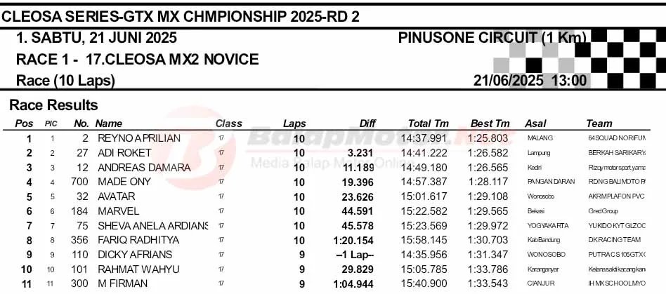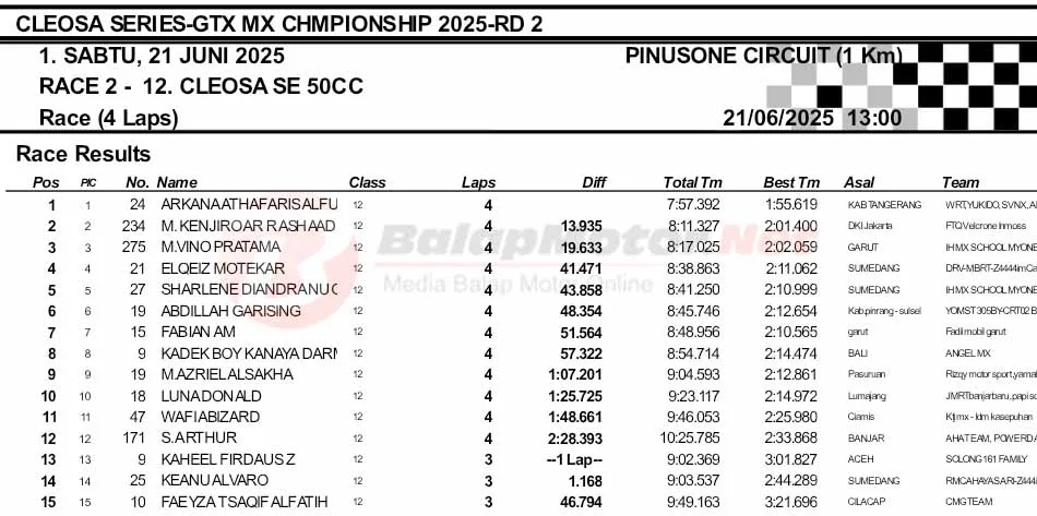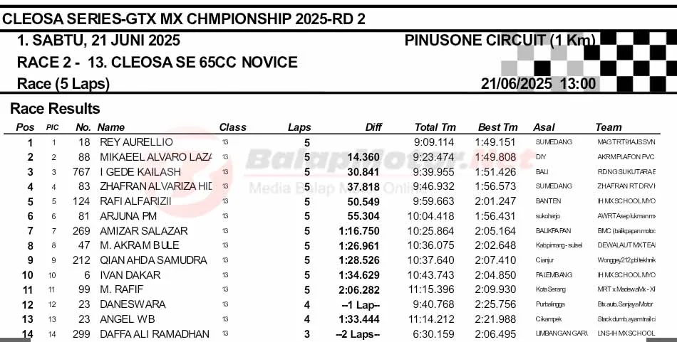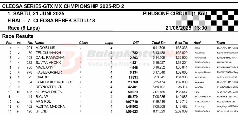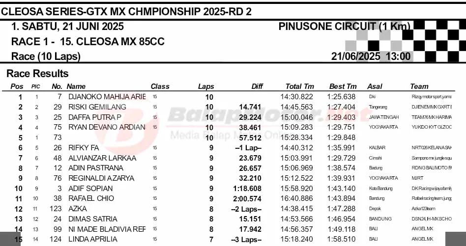 BalapMotor.Net – Berikut merupakan hasil final dan Moto1 Cleosa Series Grasstrack & Motocross Championship putaran kedua yang berlangsung di sirkuit Pinusone, Batukaras, Pangandaran, Jawa Barat pada Sabtu 21 Juni 2025. (**)