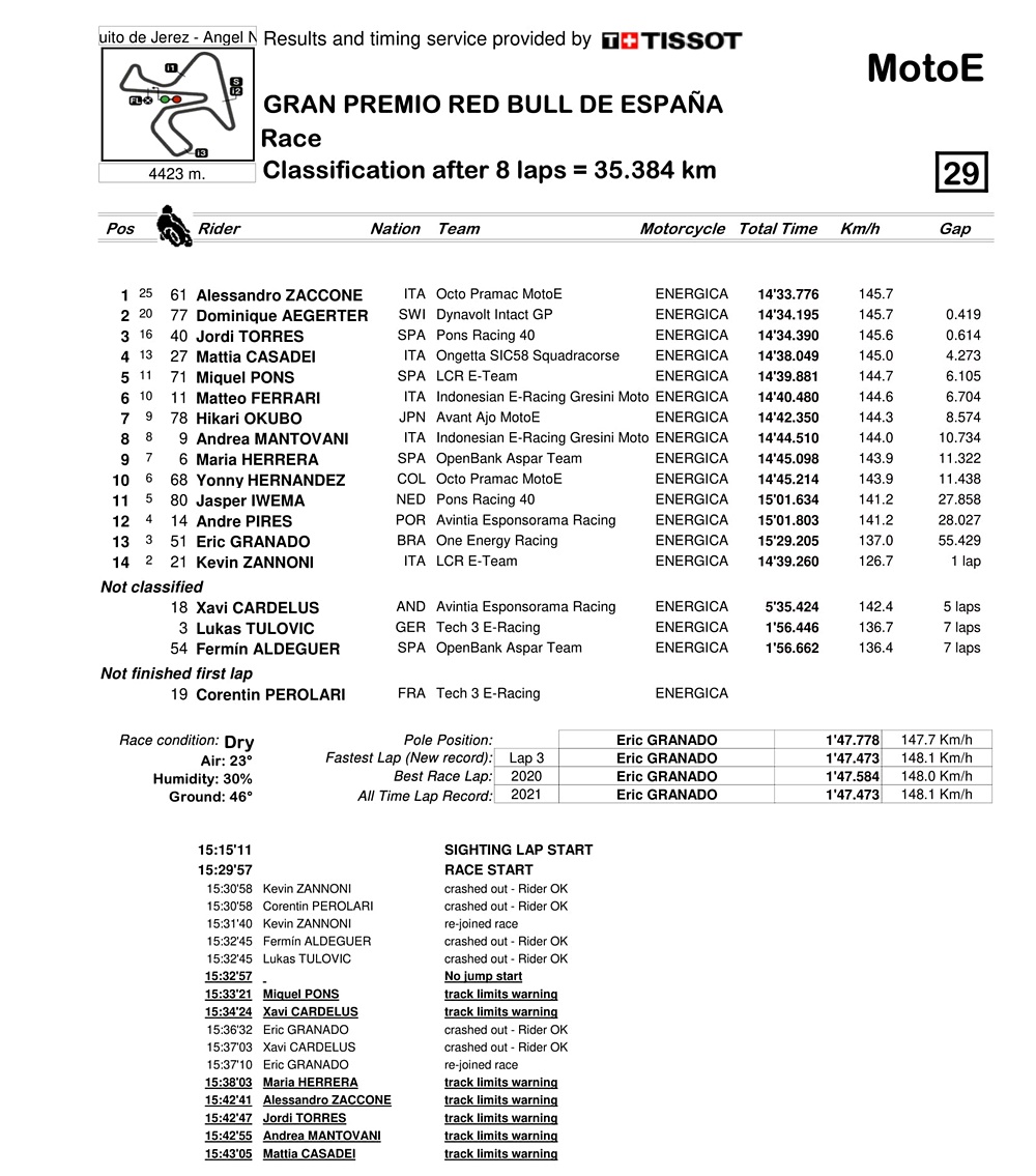 Sayang pada race justru harus terjatuh. Dari catatan lap time pun masih Eric Granado yang paling cepat dari semua pembalap MotoE. Hasil akhir pembalap asal Brazi itu harus puas finis di posisi ke-13.