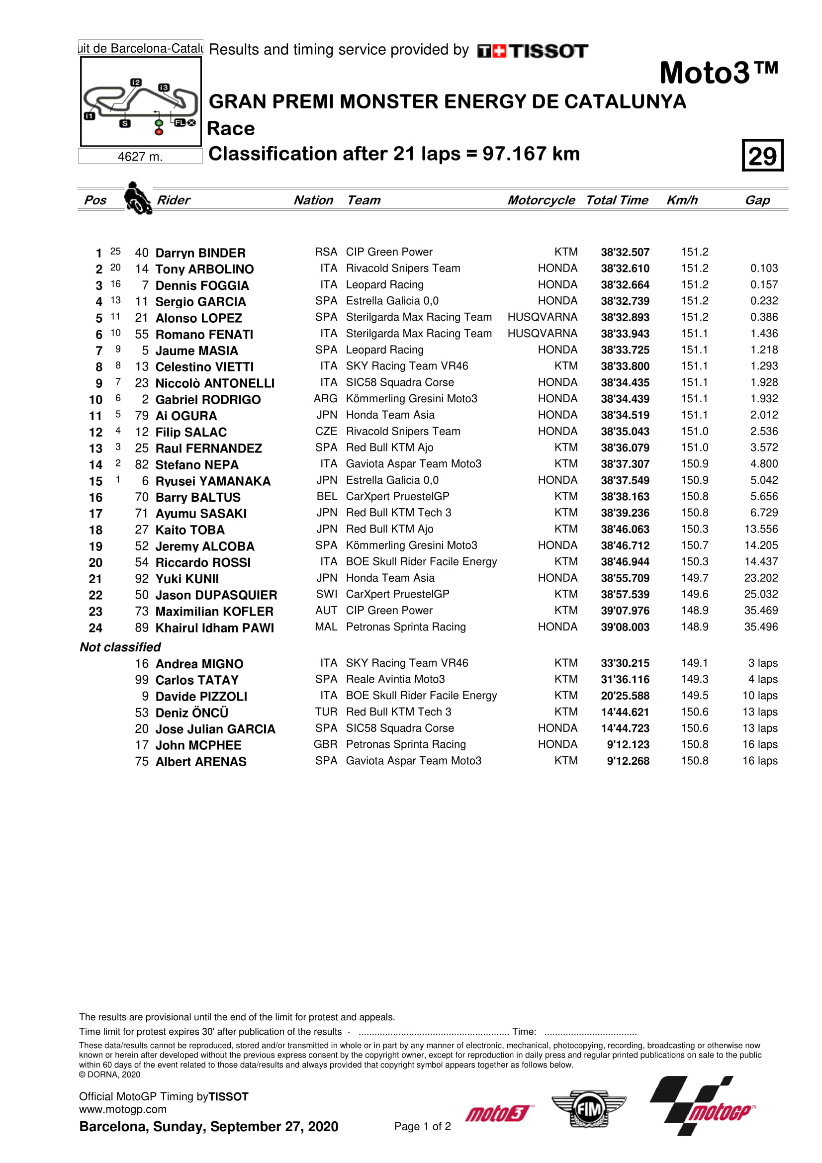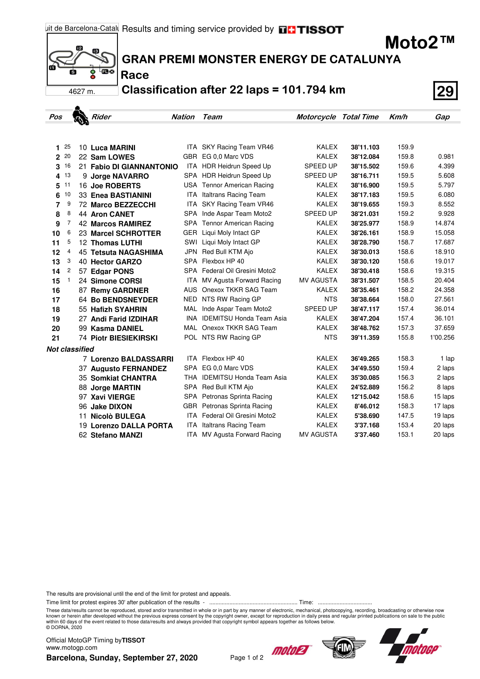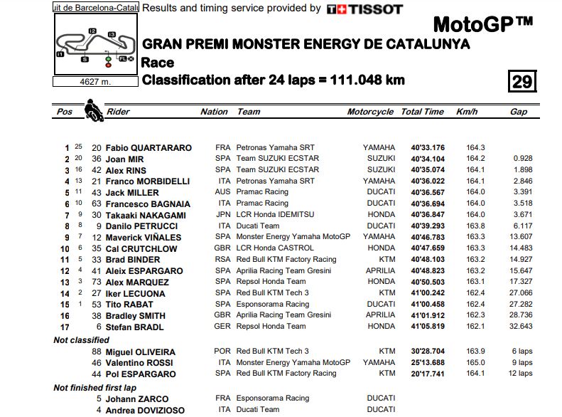 BalapMotor.Net – Berikut merupakan hasil race untuk semua kelas gelaran MotoGP Catalunya 2020 yang berlangsung di sirkuit de Barcelona Catalunya, Spanyol pada hari minggu 27 September 2020.