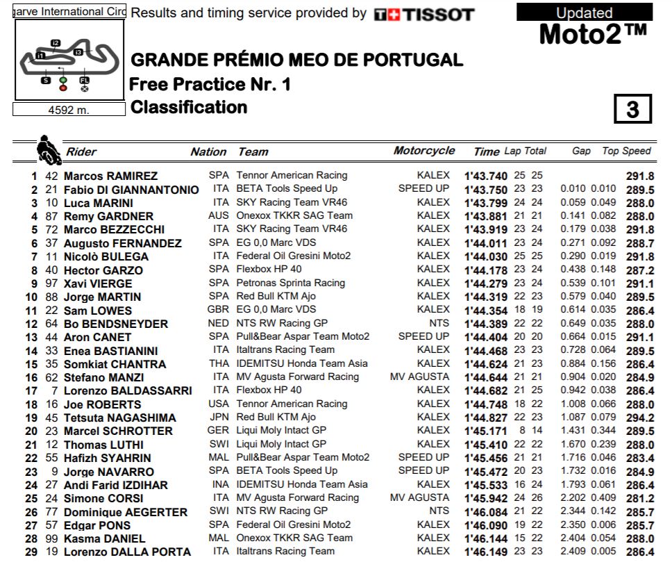 BalapMotor.Net – Berikut merupakan hasil dari gelaran MotoGP Portugal 2020 untuk sesi hari pertama (FP1 dan FP2) pada semua kelas (20/11).