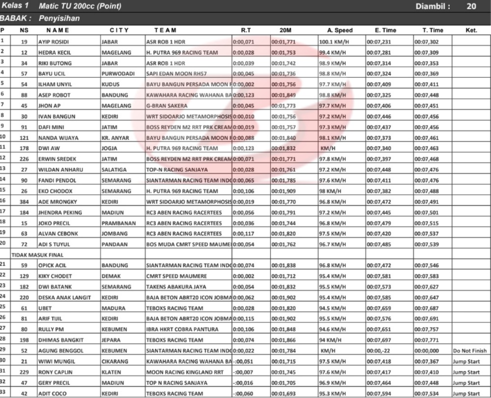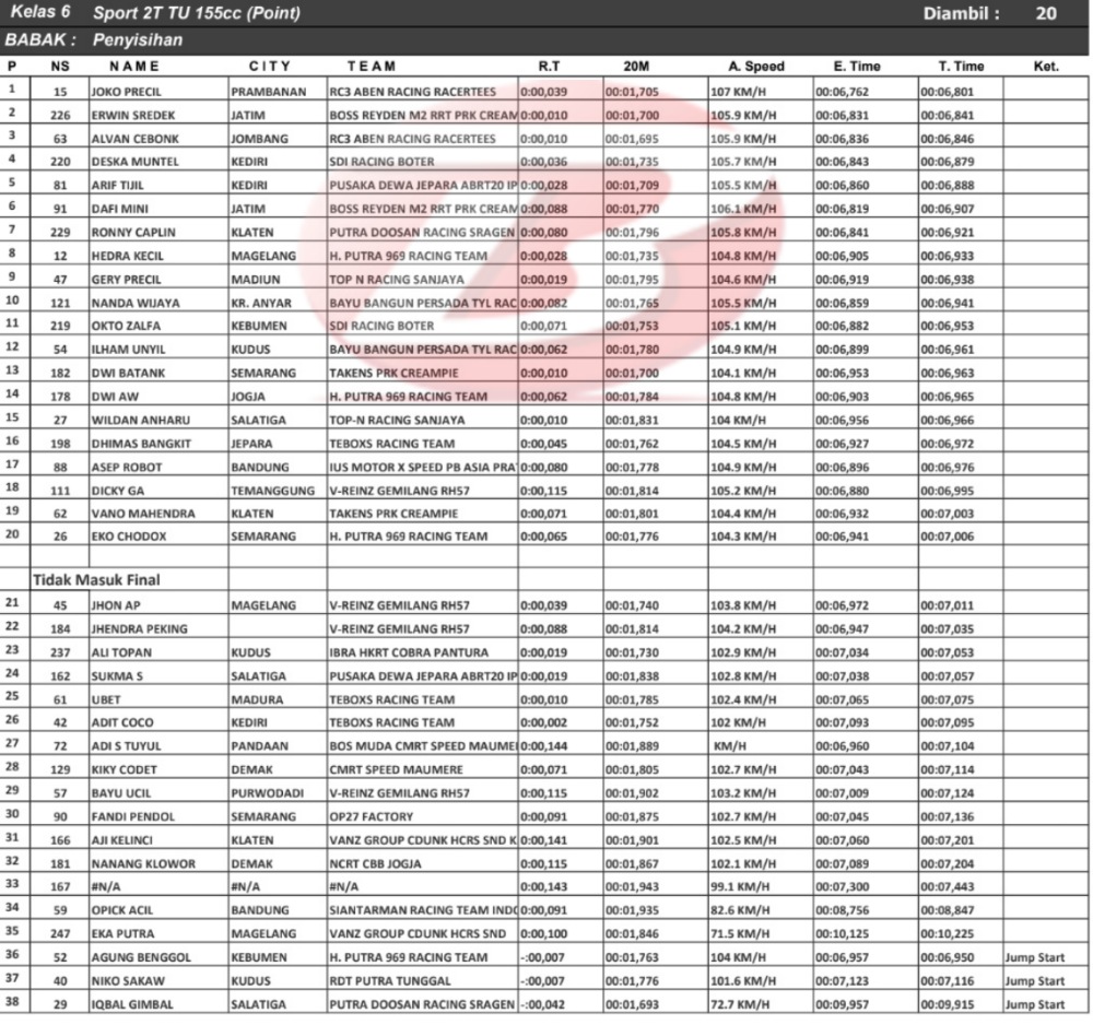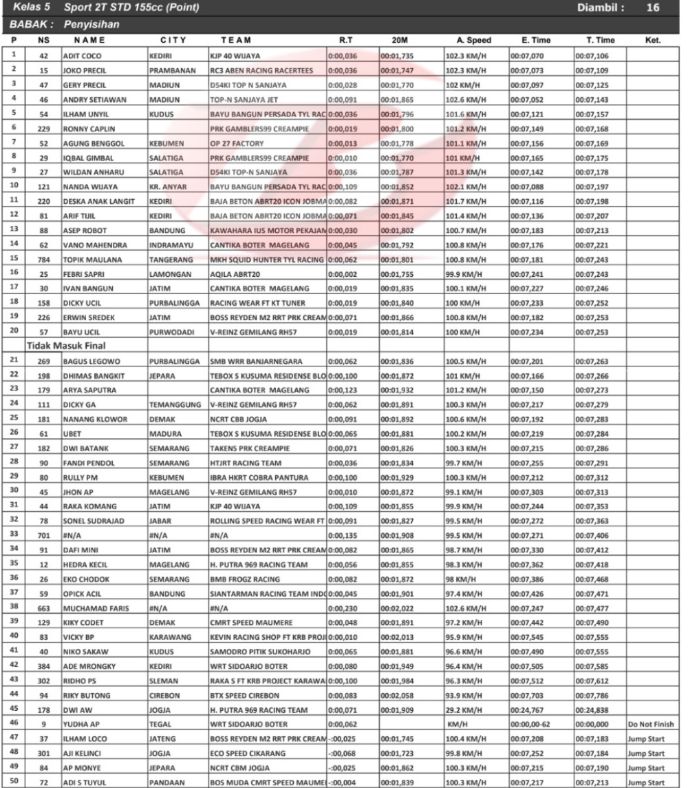 Hasil Penyisihan Gadhuro Drag Bike Series 2020 (Tegal)Penulis Yugo Aol - 16/08/2020 BalapMotor.Net – Berikut kami paparkan hasil lengkap babak penyisihan kelas poin (open) kejuaraan Gadhuro Drag Bike Series 2020 putaran kedua yang berlangsung di sirkuit NP. Jalingkut, Tegal – Jateng pada Sabtu 15 Agustus 2020.