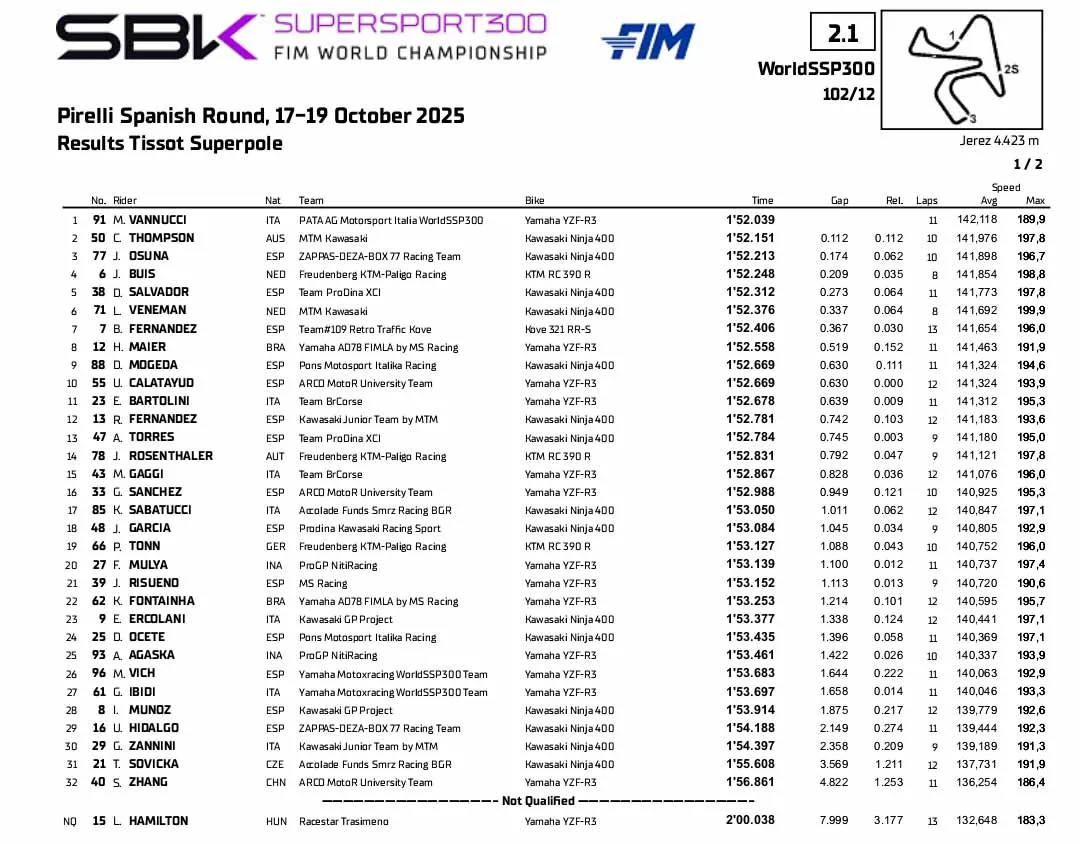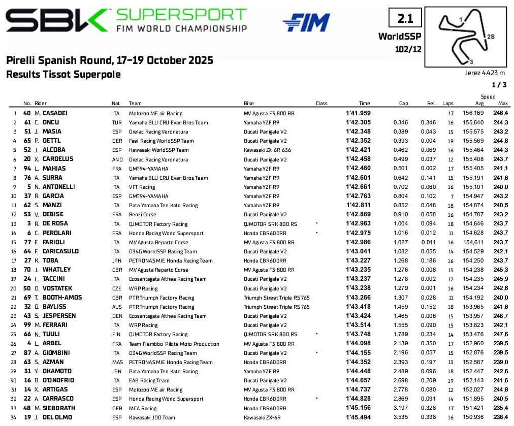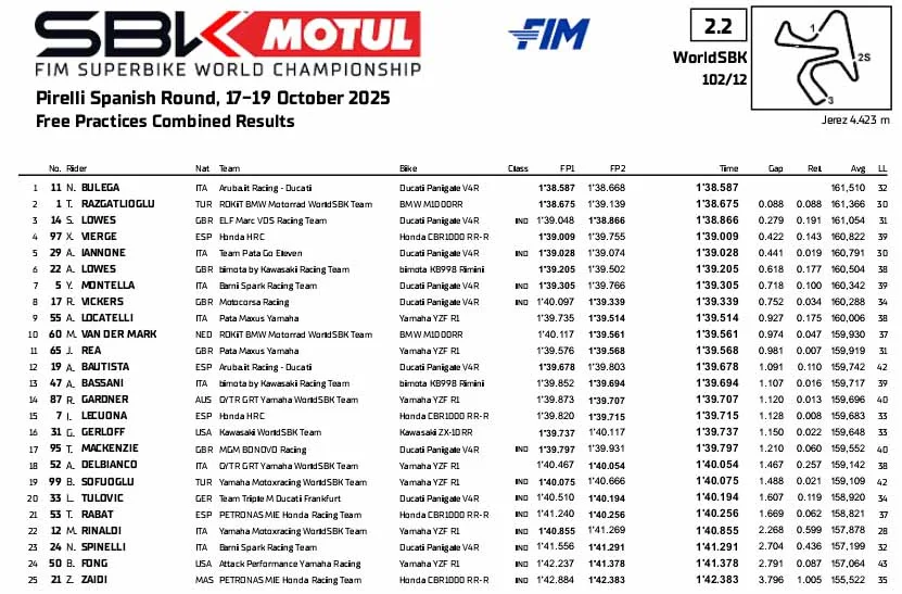 BalapMotor.Net – Berikut merupakan hasil sesi latihan bebas dan Superpole Kejuaraan Dunia Superbike, Supersport dan Supersport 300 yang berlangsung di sirkuit Jerez, Spanyol pada Jumat 17 Oktober 2025. (**)