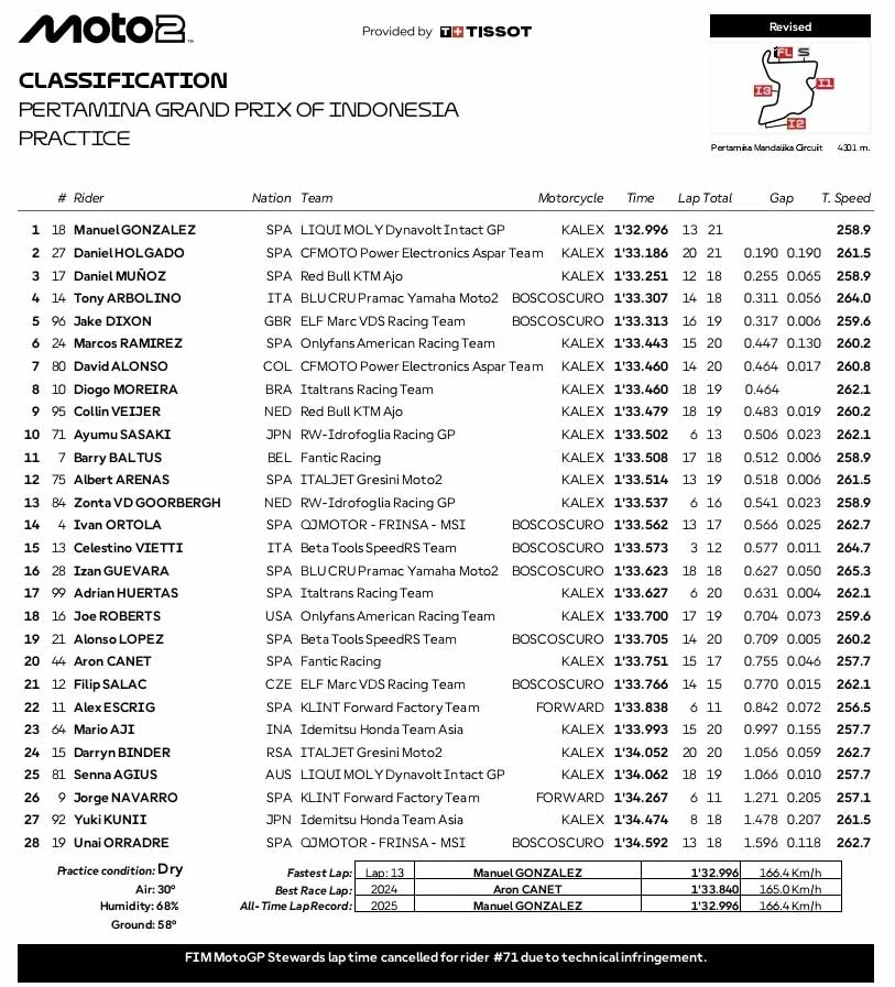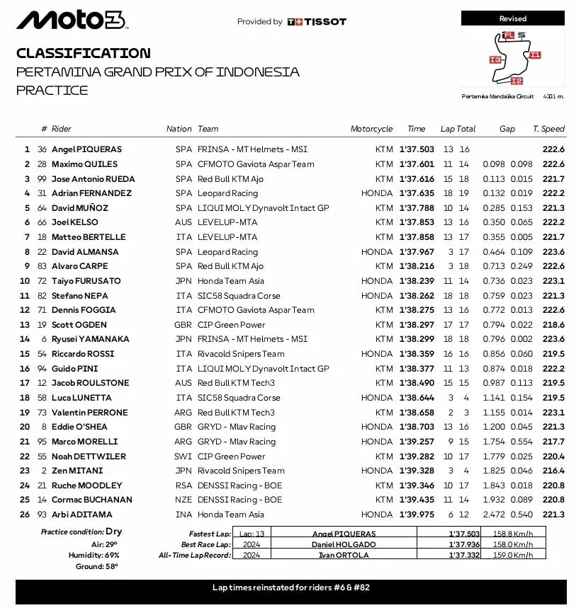 BalapMotor.Net – Berikut merupakan hasil sesi latihan bebas Kejuaraan Dunia MotoGP, Moto2 dan Moto3 yang berlangsung di sirkuit Pertamina Mandalika, Lombok, NTB pada Jumat 3 Oktober 2025. (**)