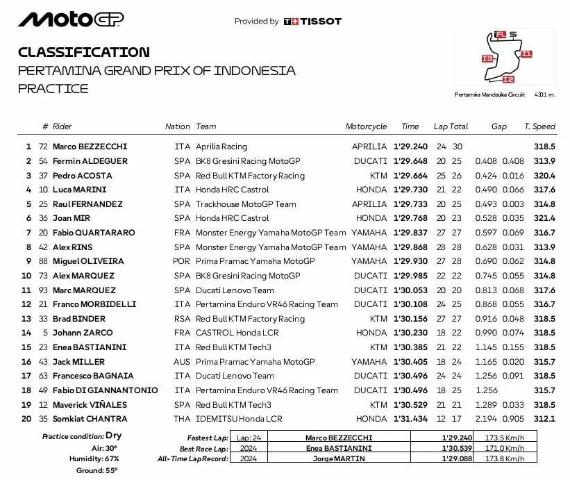 Hasil Practice MotoGP, Moto2 dan Moto3 Mandalika 2025