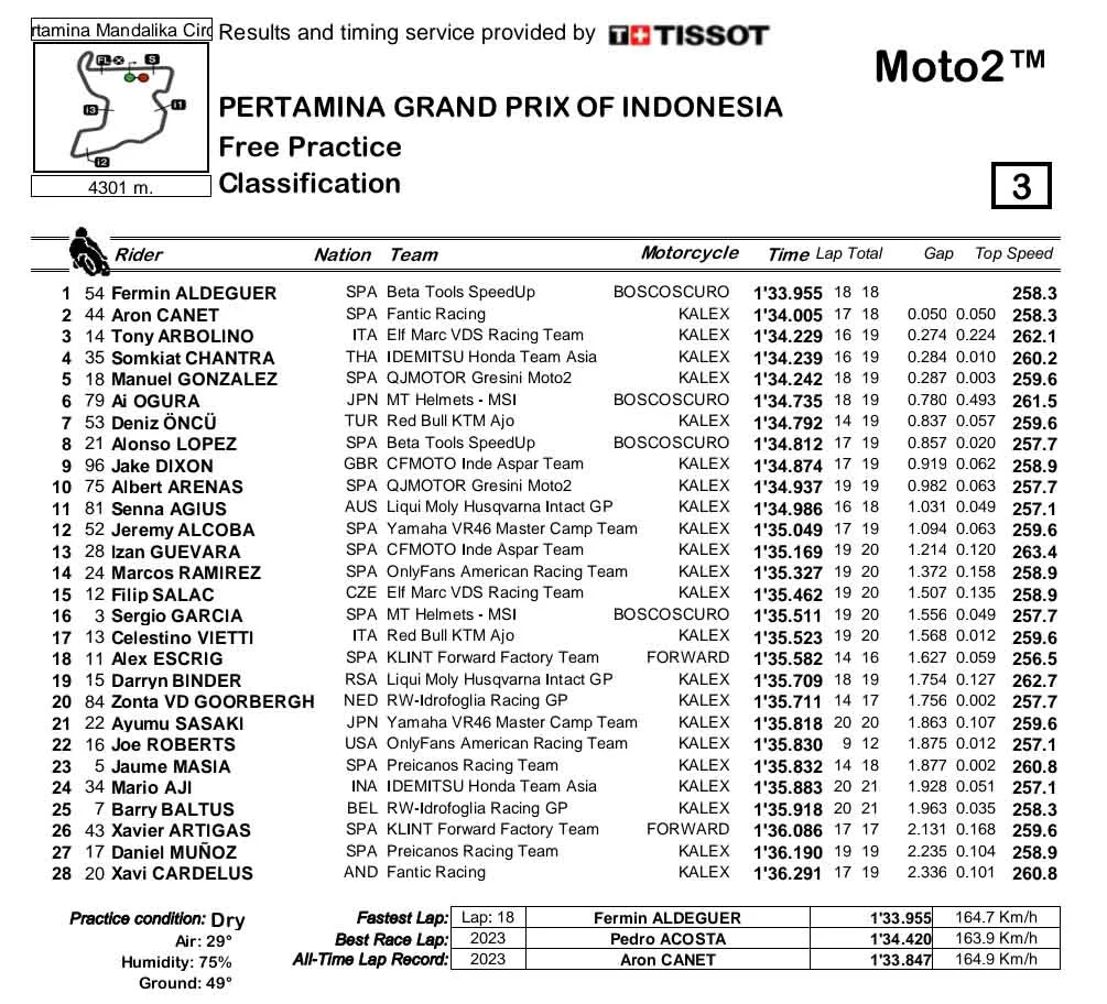 Sementara di kategori Moto2, Fermin Aldeguer dari Spanyol jadi yang teratas. Sedangkan pembalap Indonesia Mario Suryo Aji masih belum berbicara banyak dan hanya menempati posisi ke-24.