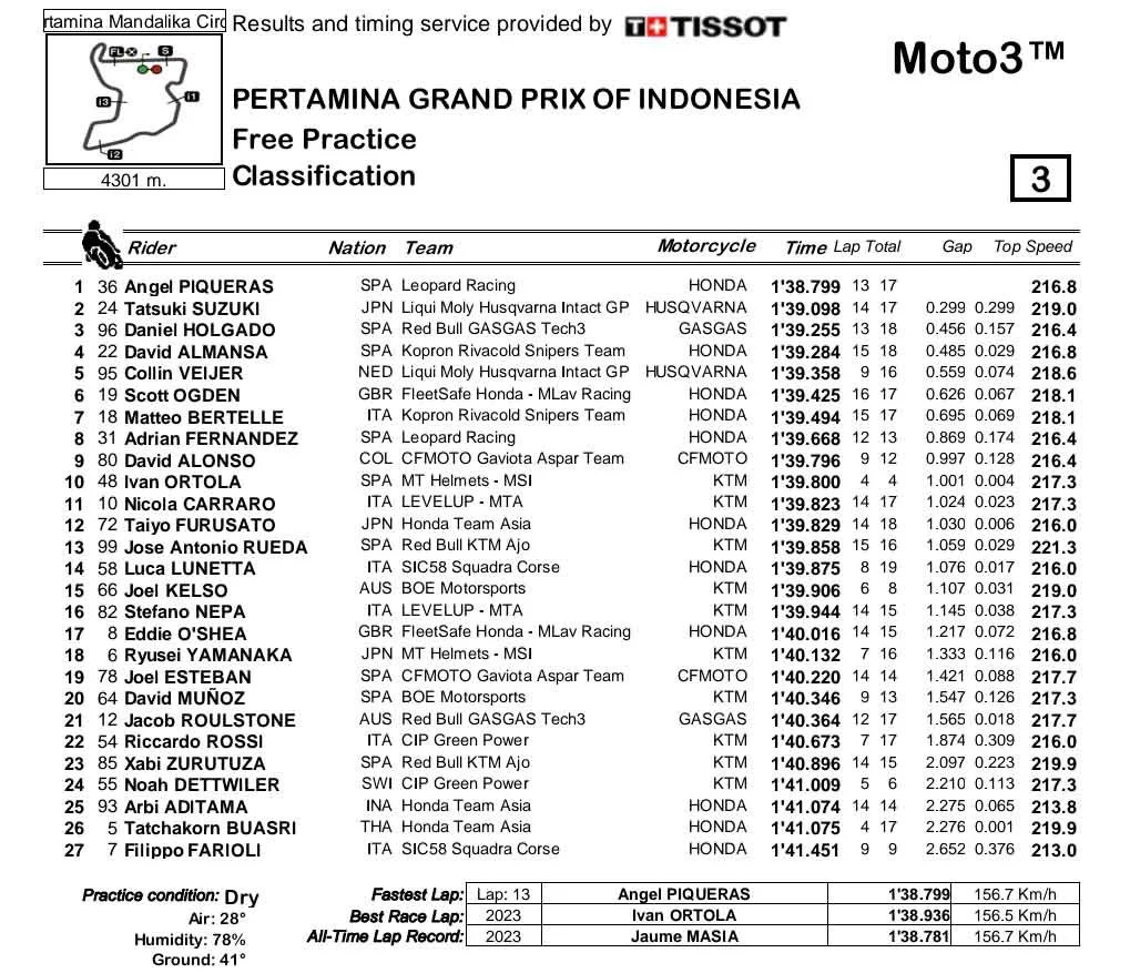 Di kategori Moto3, pembalap asal Spanyol kembali menjadi yang tercepat. Kali ini diraih oleh Angel Piqueras. Pembalap wildcard Indonesia, Fadillah Arbi Aditama sementara berada di posisi ke-25. (***)