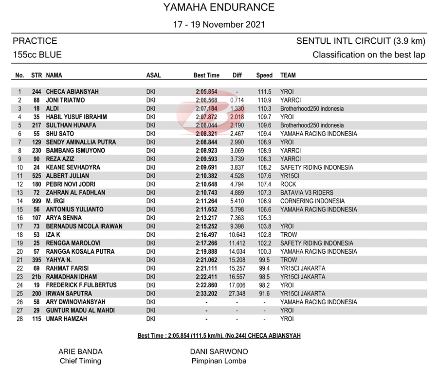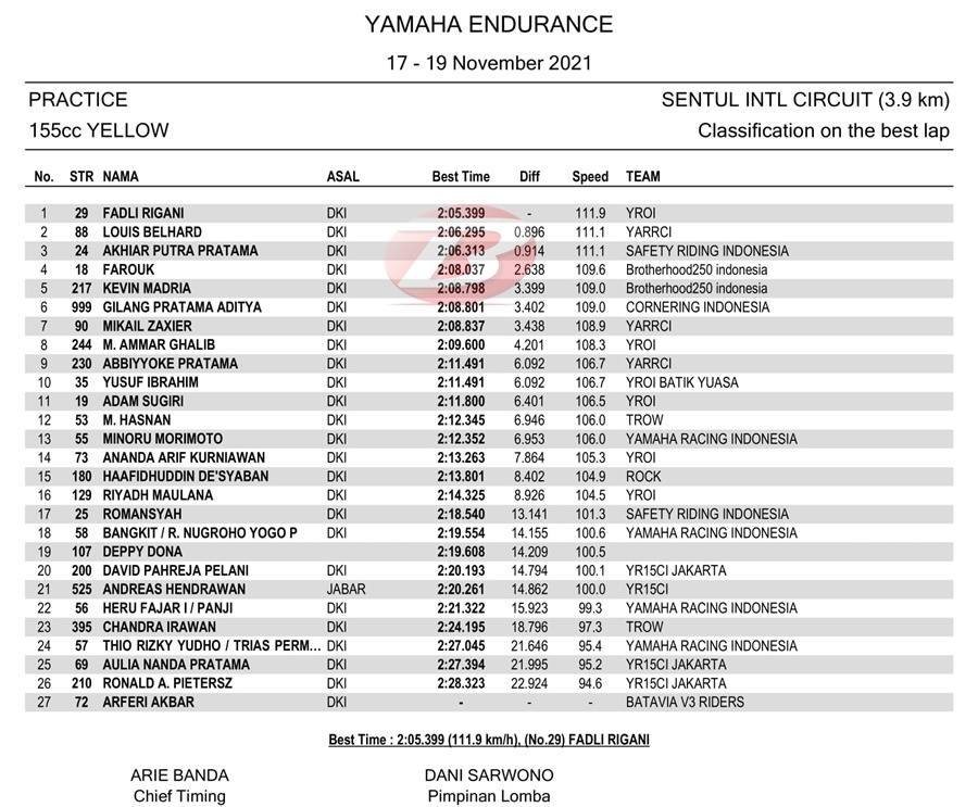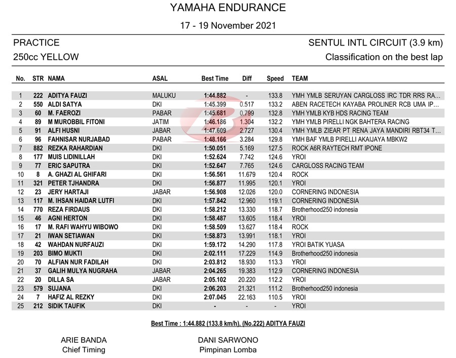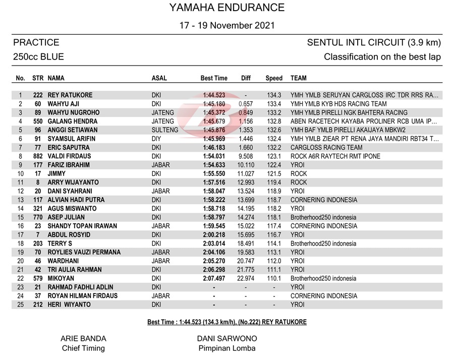 BalapMotor.Net – Perhelatan Yamaha Endurance Festival 2021 yang berlangsung di sirkuit Sentul, Bogor telah menyelesaikan latihan resmi pertama pada Sabtu pagi (18 Desember).