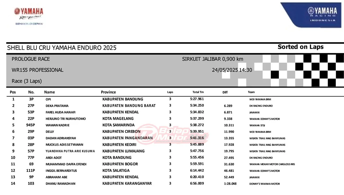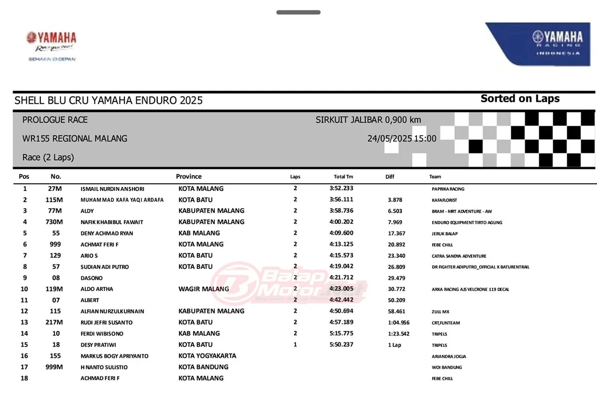 BalapMotor.Net – Berikut merupakan hasil Prologue Race hari Sabtu (24/5) dari gelaran seri 1 Shell BLU CRU Yamaha Enduro Challenge 2025 yang berlangsung di sirkuit Jalibar Oro Oro Ombo, Kota Batu, Jawa Timur.