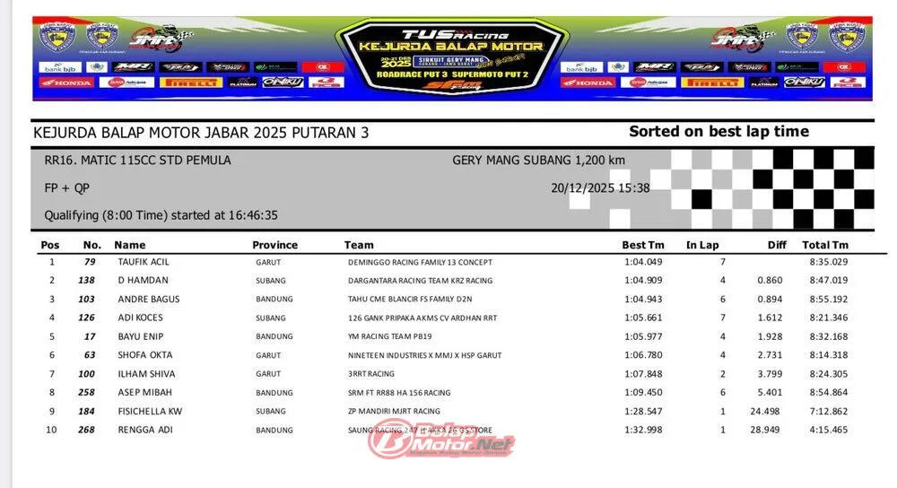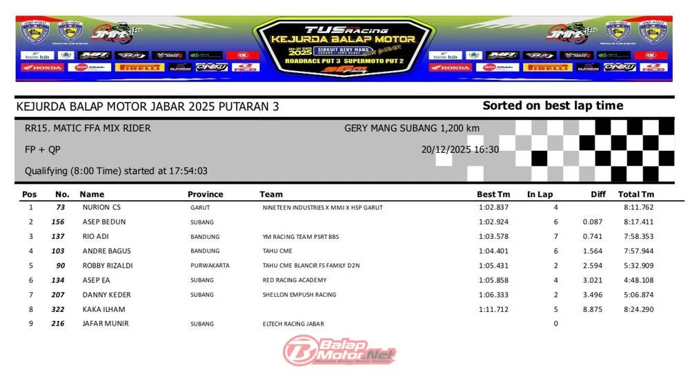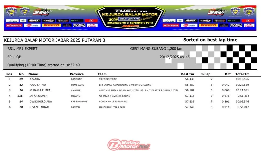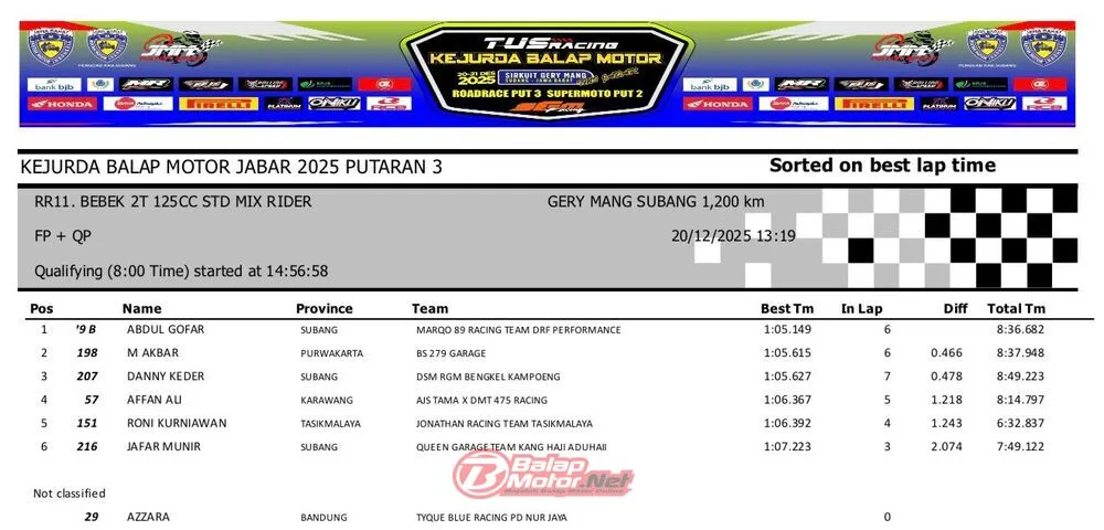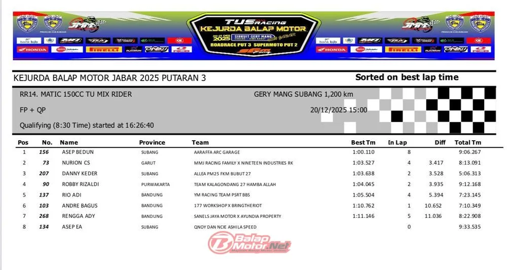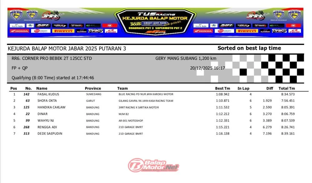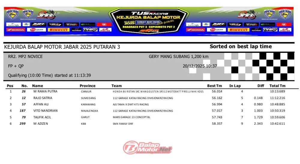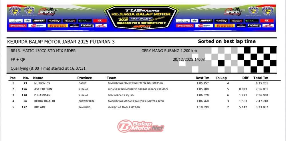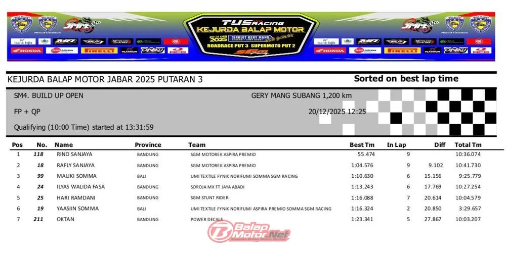 BalapMotor.Net – Berikut merupakan hasil QTT dan race 1 dari gelaran ronde final TUS Racing Kejurda Balap Motor Jawa Barat 2025 di sirkuit Gery Mang, Subang pada hari Sabtu 20 Desember 2025. (**)