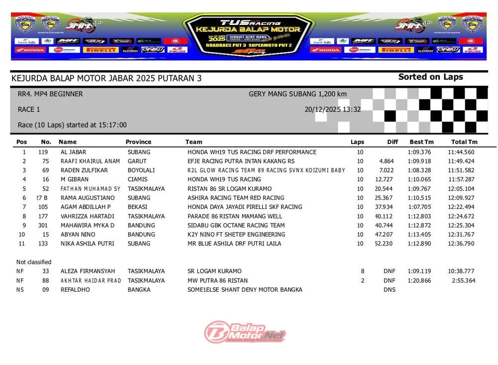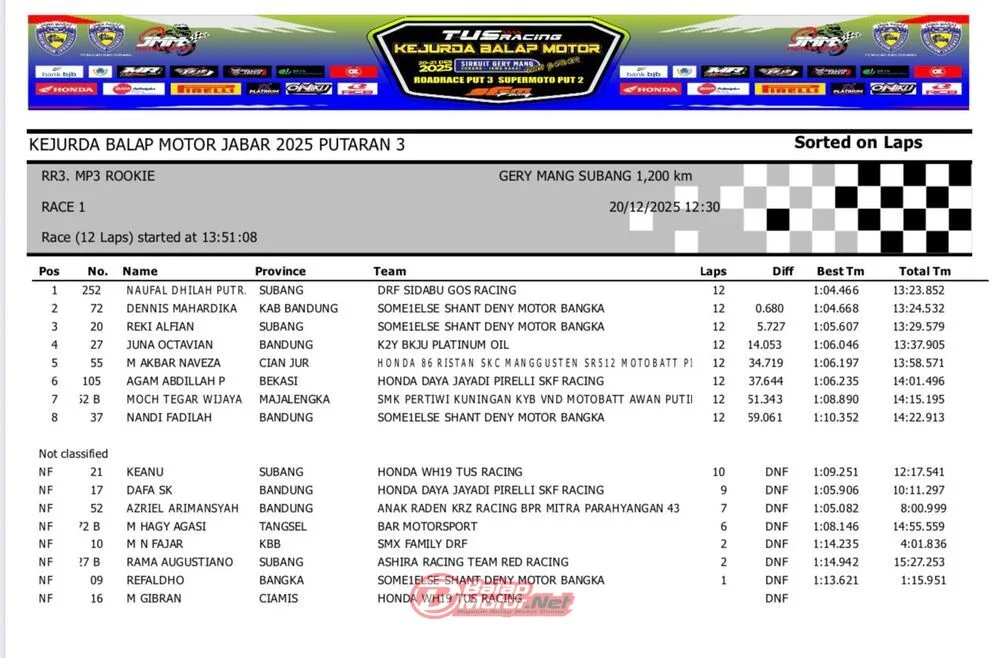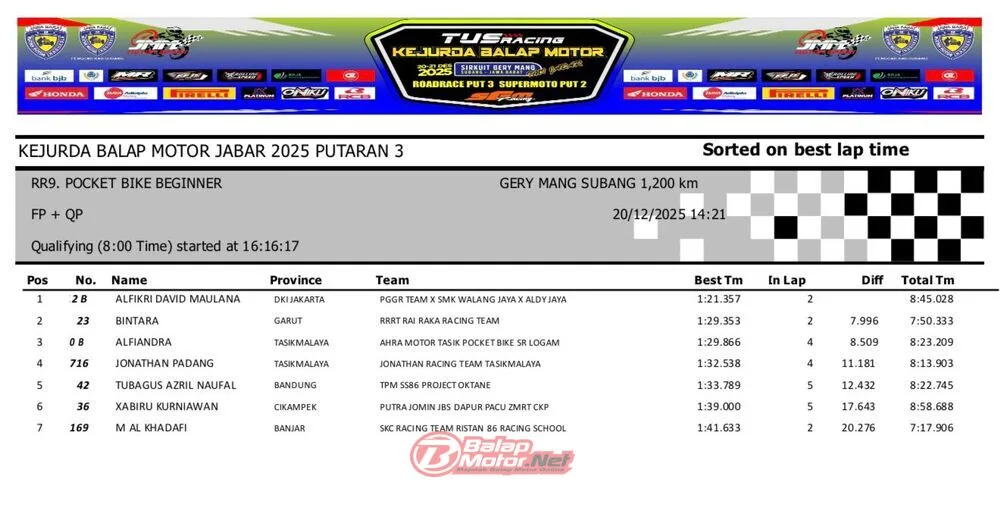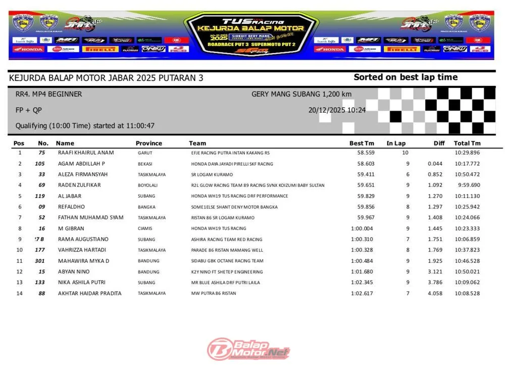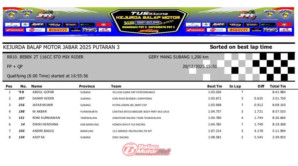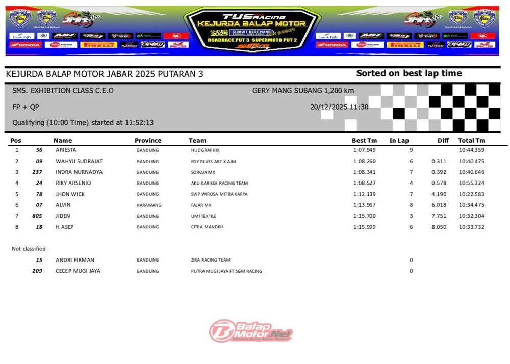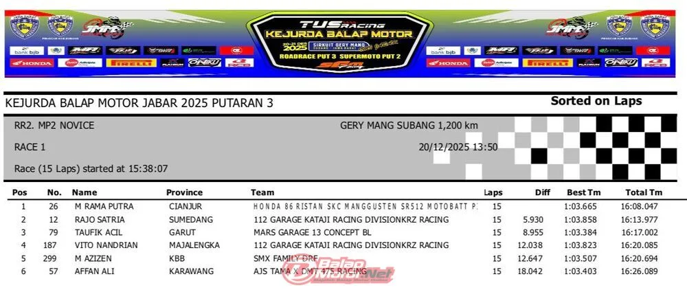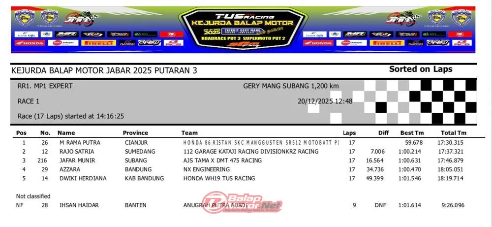BalapMotor.Net – Berikut merupakan hasil QTT dan race 1 dari gelaran ronde final TUS Racing Kejurda Balap Motor Jawa Barat 2025 di sirkuit Gery Mang, Subang pada hari Sabtu 20 Desember 2025. (**)