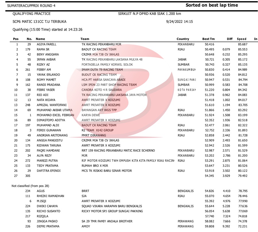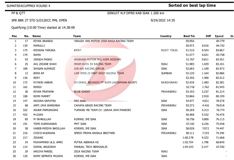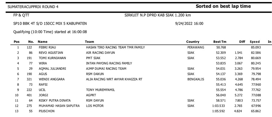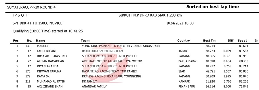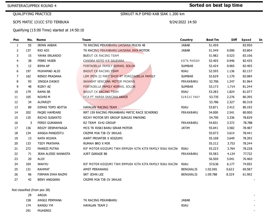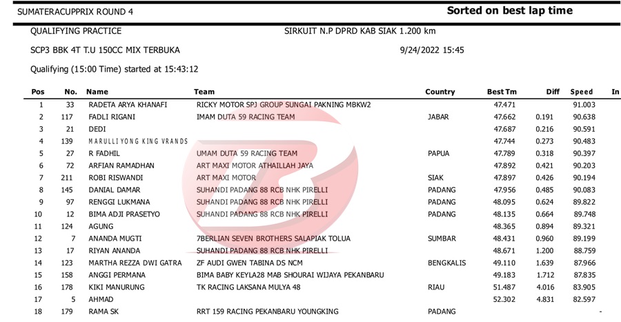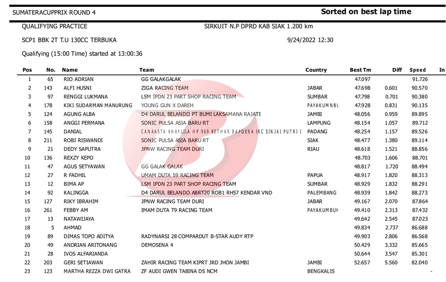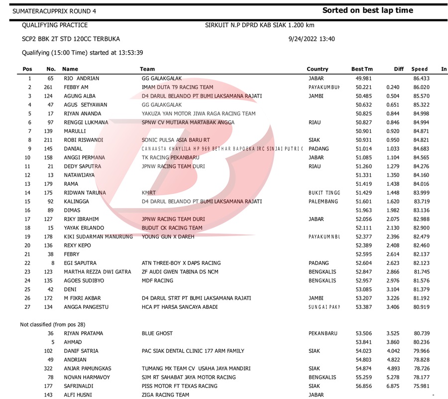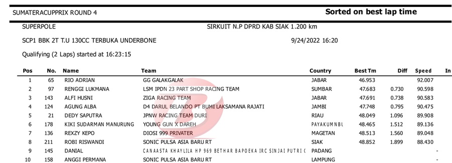 BalapMotor.Net – Berikut kami paparkan hasil kualifikasi dan superpole kejuaraan Sumatera Cup Prix (SCP) putaran 4 yang berlangsung di sirkuit DPRD Kab. Siak pada Sabtu 24 September 2022. | Halim