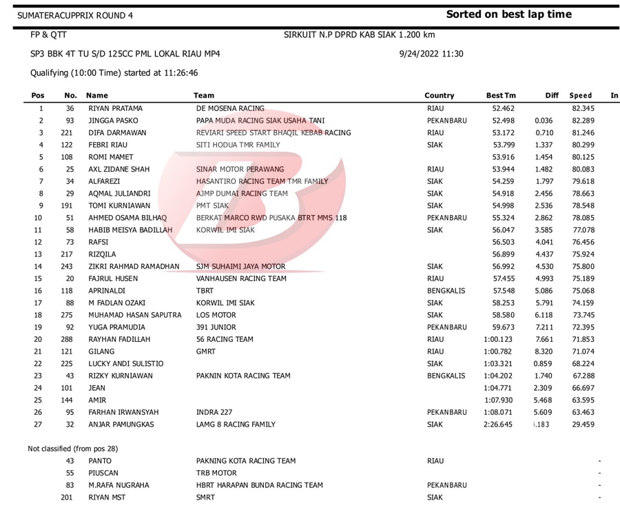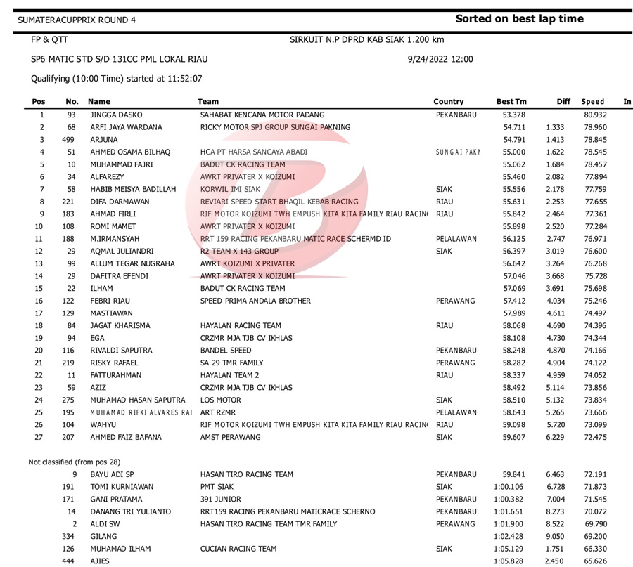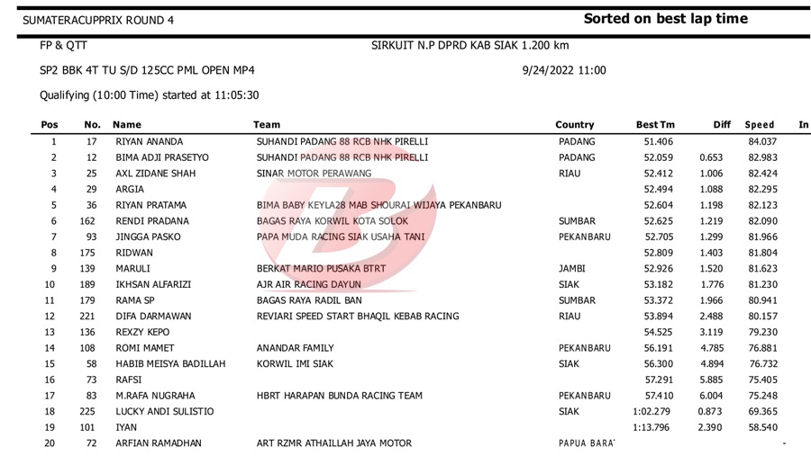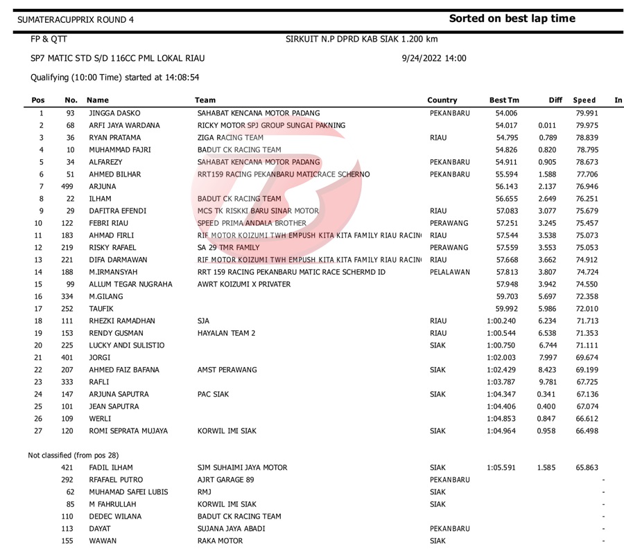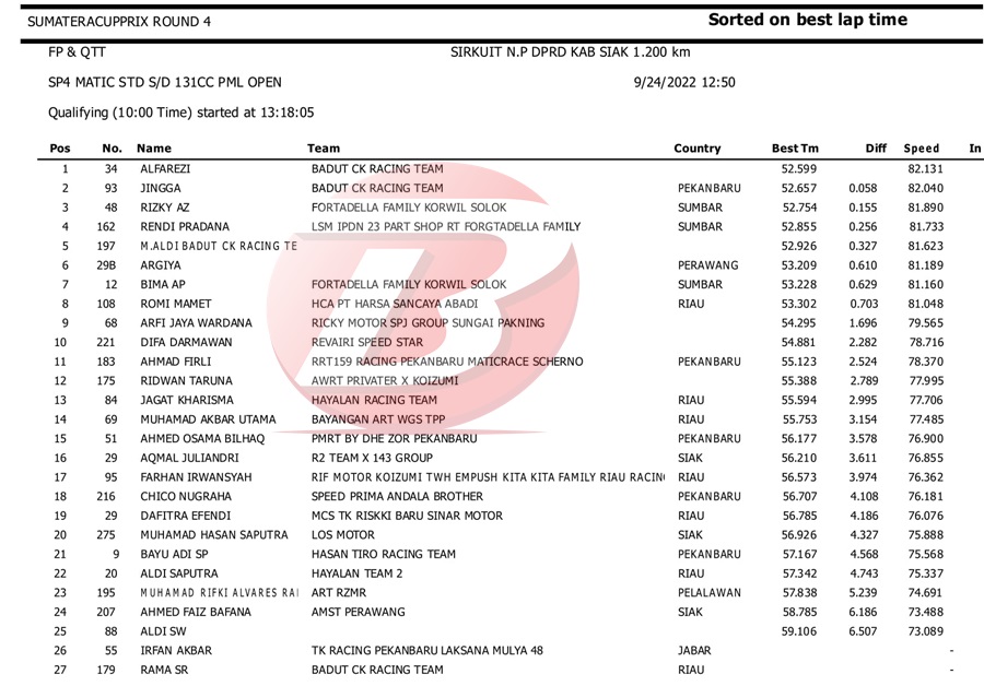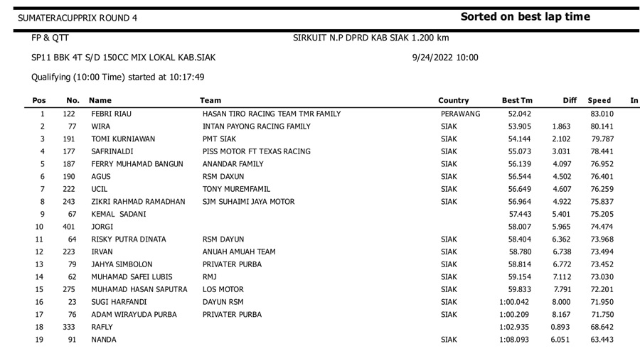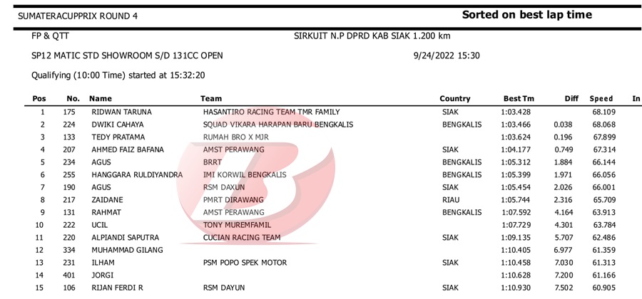 BalapMotor.Net – Berikut kami paparkan hasil kualifikasi dan superpole kejuaraan Sumatera Cup Prix (SCP) putaran 4 yang berlangsung di sirkuit DPRD Kab. Siak pada Sabtu 24 September 2022. | Halim