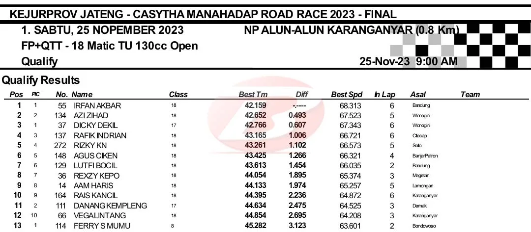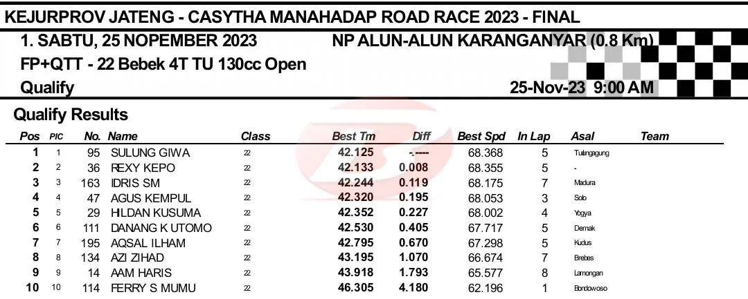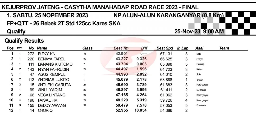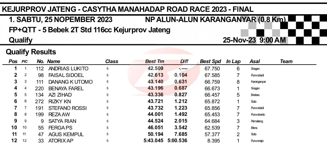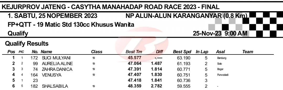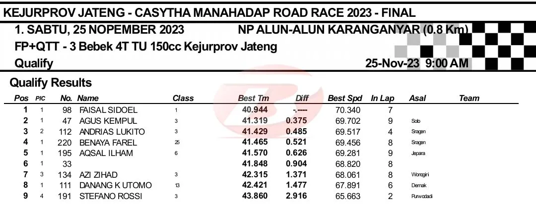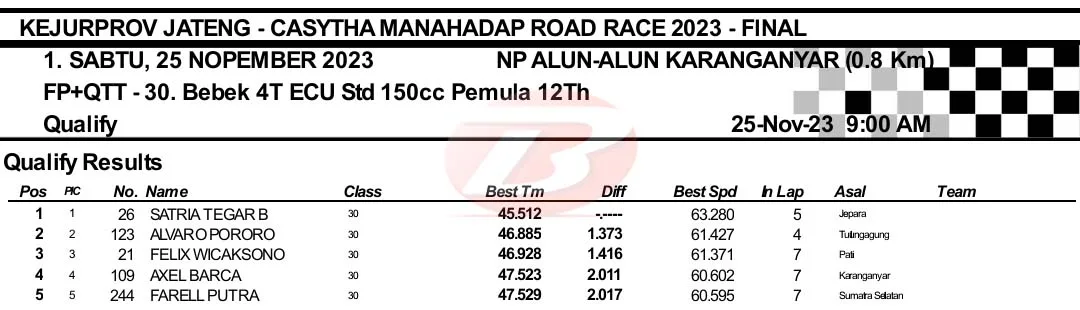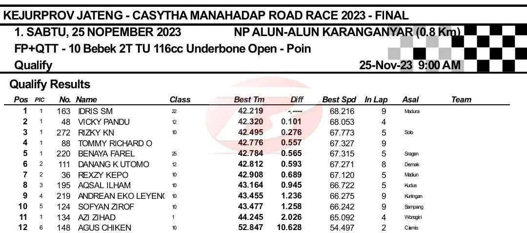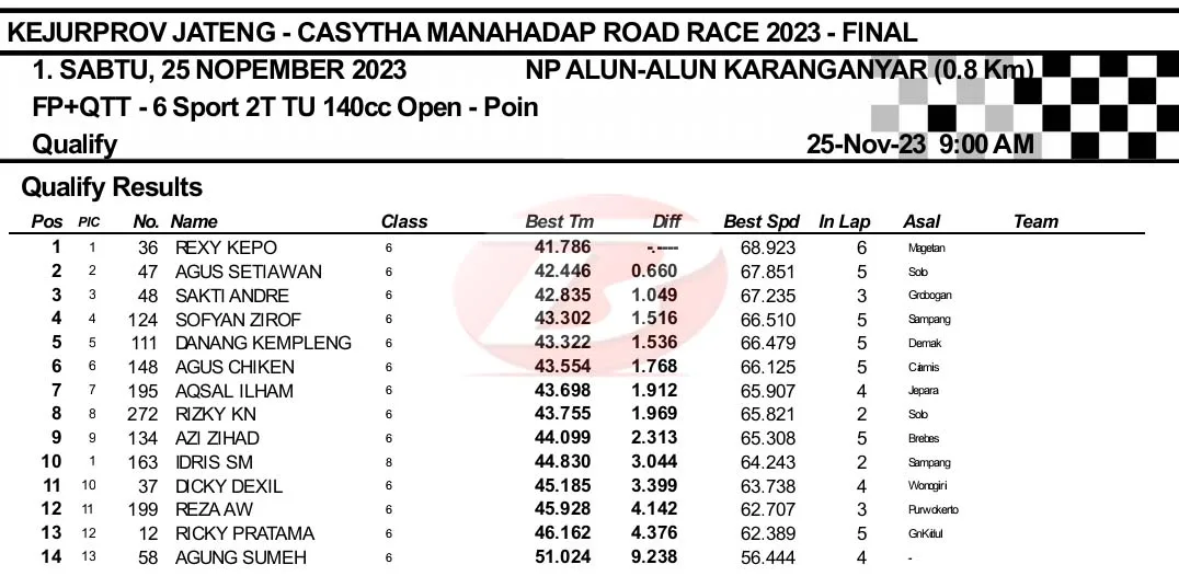 BalapMotor.Net – Berikut merupakan hasil kualifikasi Grand Final Kejurprov Jateng Casytha Manahadap Road race 2023 yang berlangsung di sirkuit NP. Alun-alun Karanganyar, Jawa Tengah pada 25 November 2023. (***)