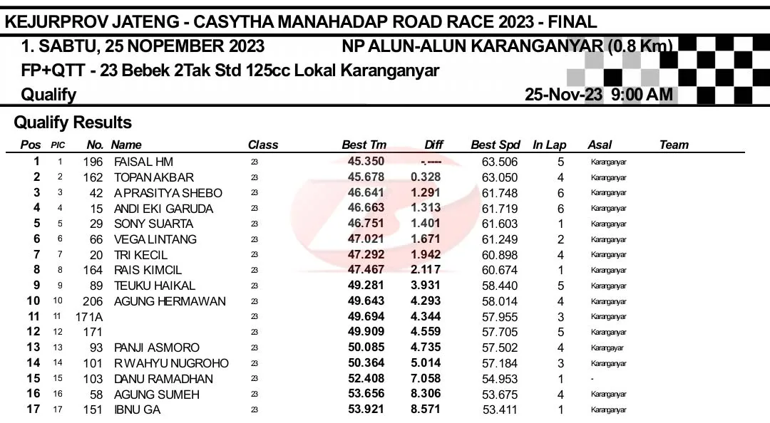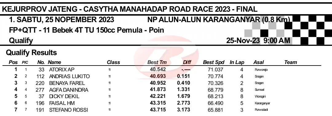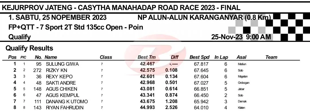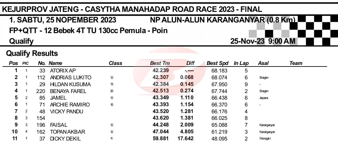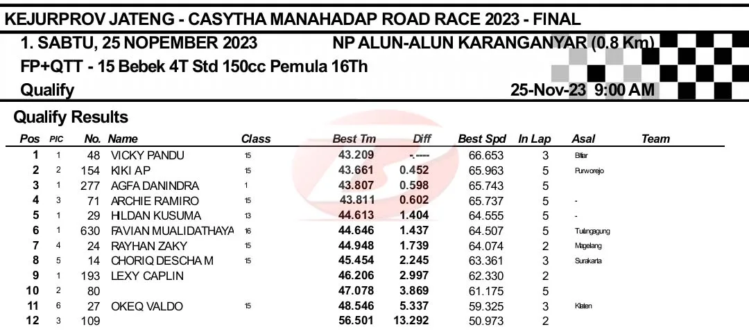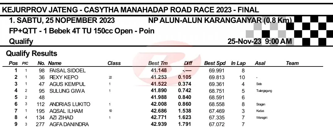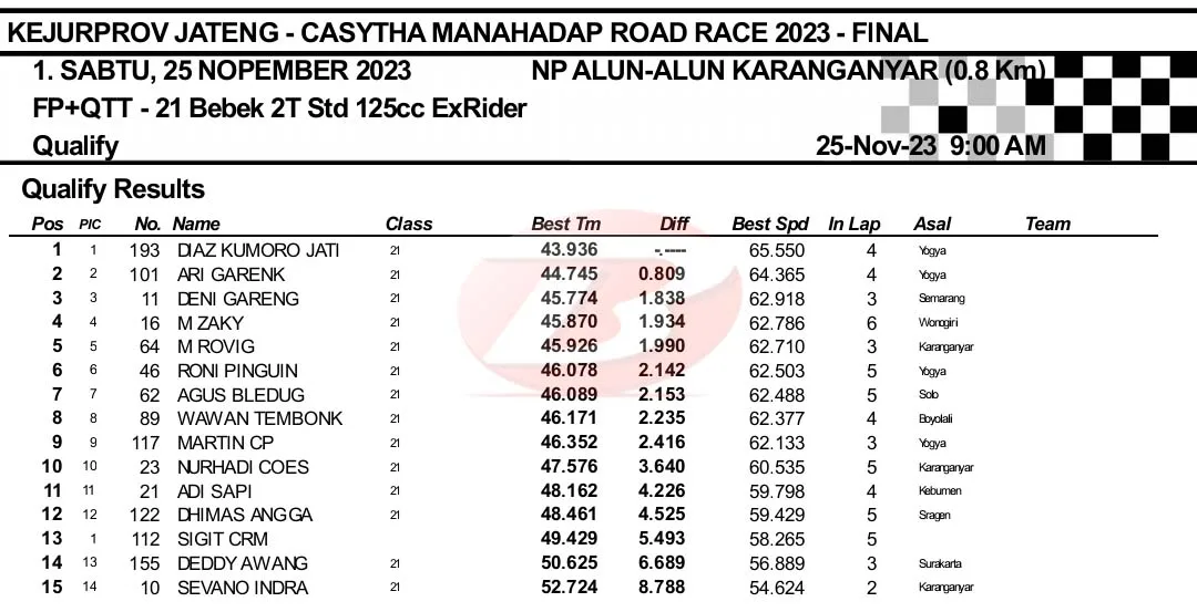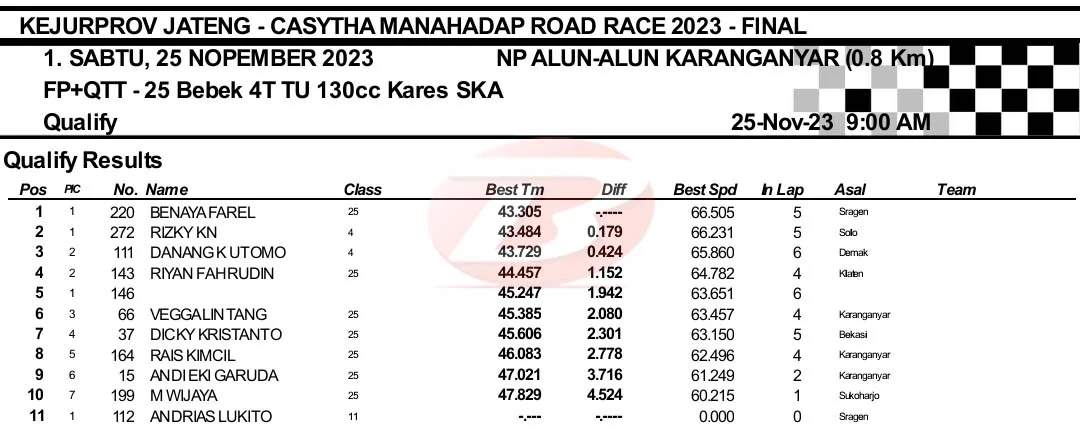 BalapMotor.Net – Berikut merupakan hasil kualifikasi Grand Final Kejurprov Jateng Casytha Manahadap Road race 2023 yang berlangsung di sirkuit NP. Alun-alun Karanganyar, Jawa Tengah pada 25 November 2023. (***)