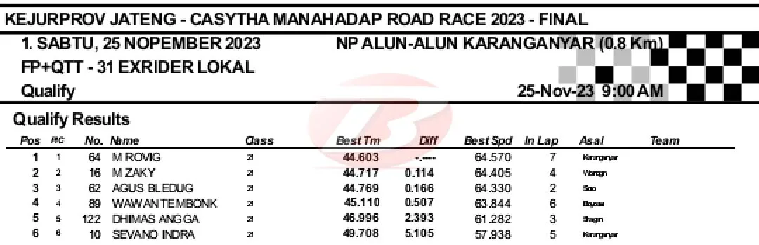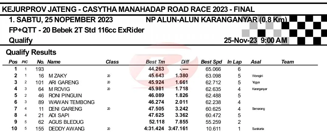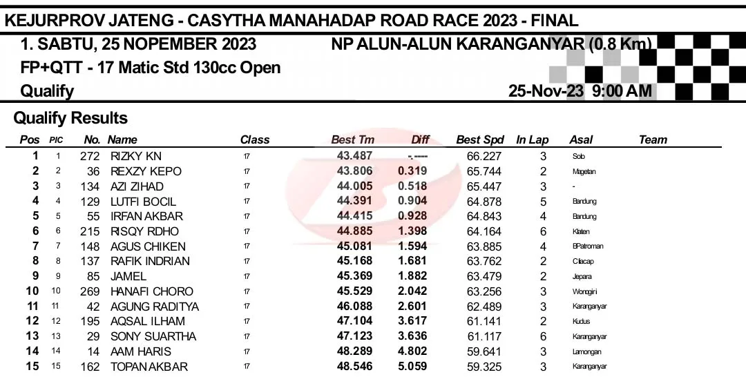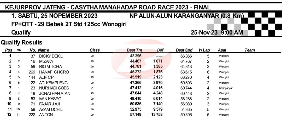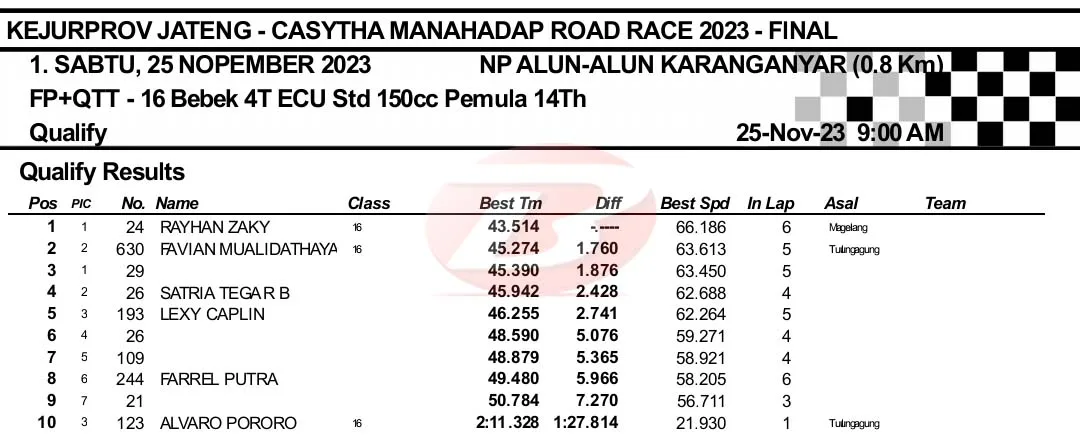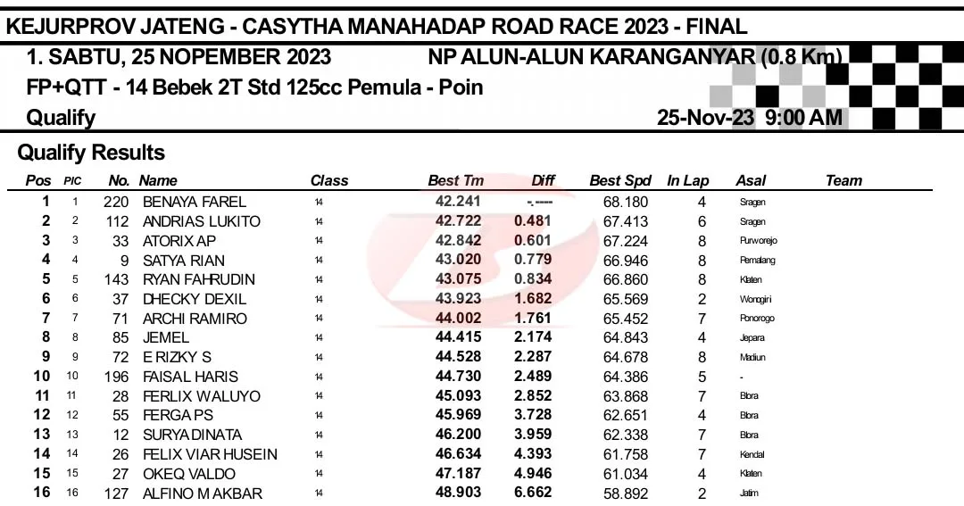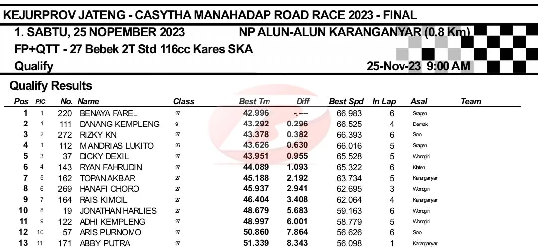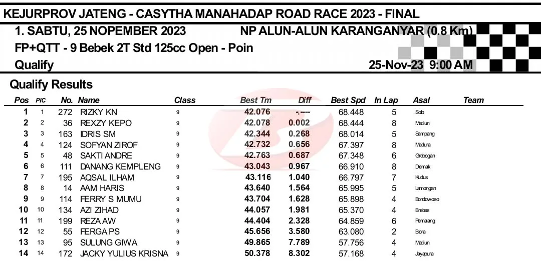 BalapMotor.Net – Berikut merupakan hasil kualifikasi Grand Final Kejurprov Jateng Casytha Manahadap Road race 2023 yang berlangsung di sirkuit NP. Alun-alun Karanganyar, Jawa Tengah pada 25 November 2023. (***)