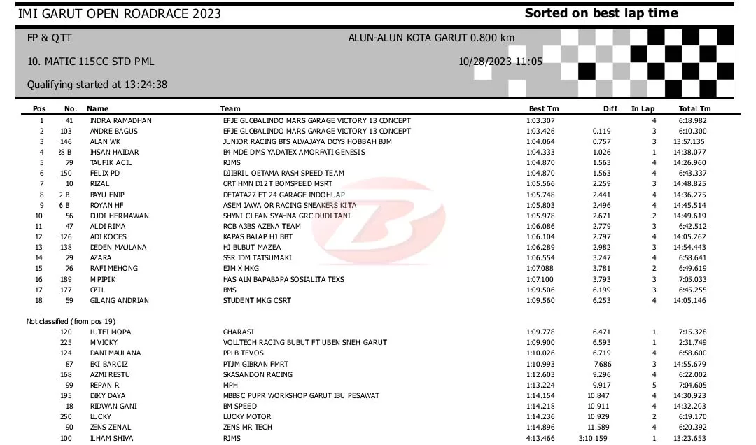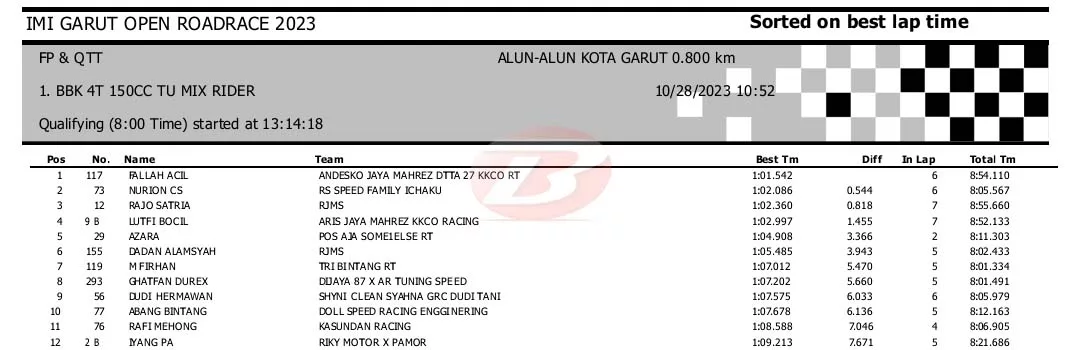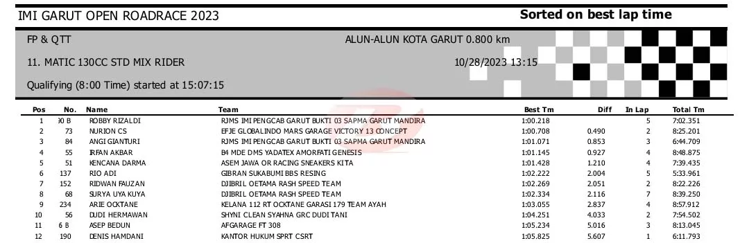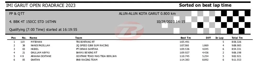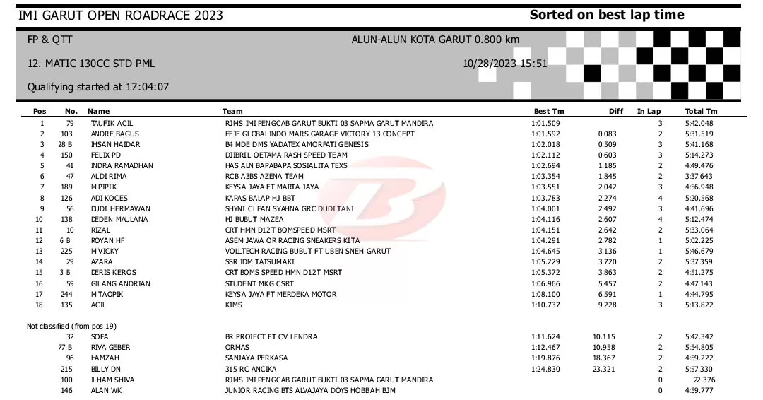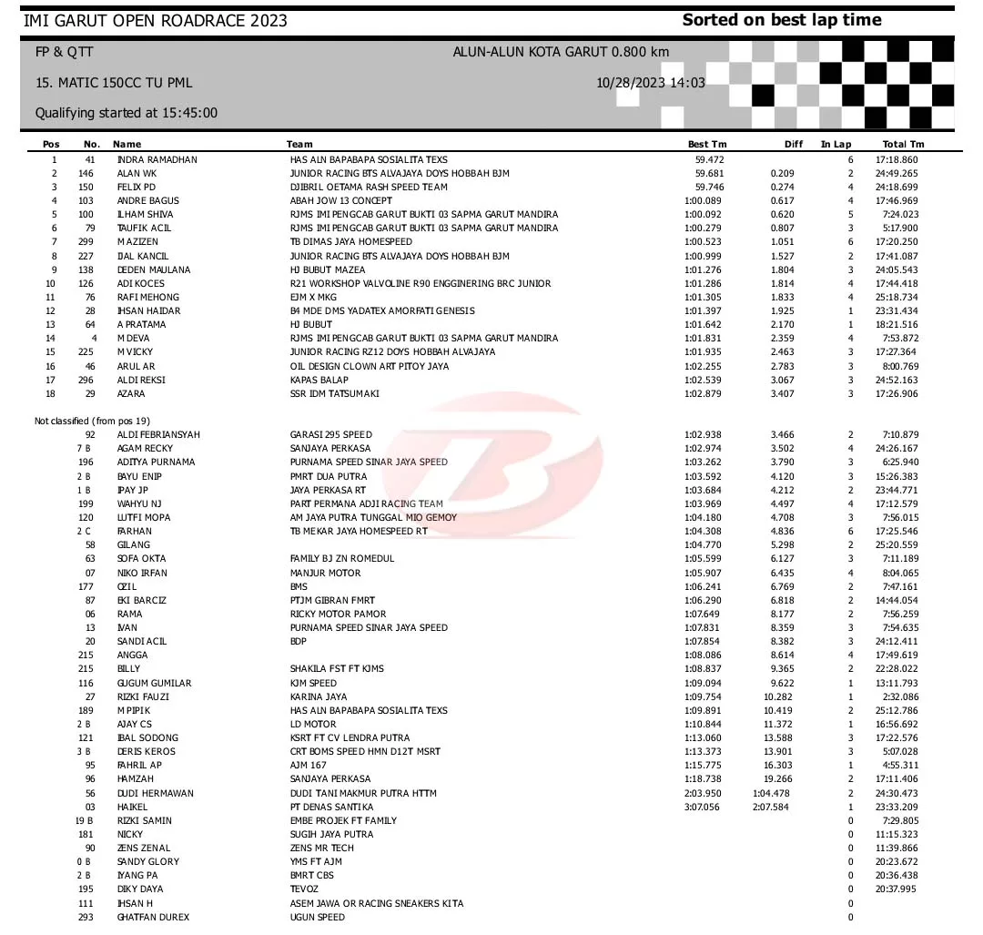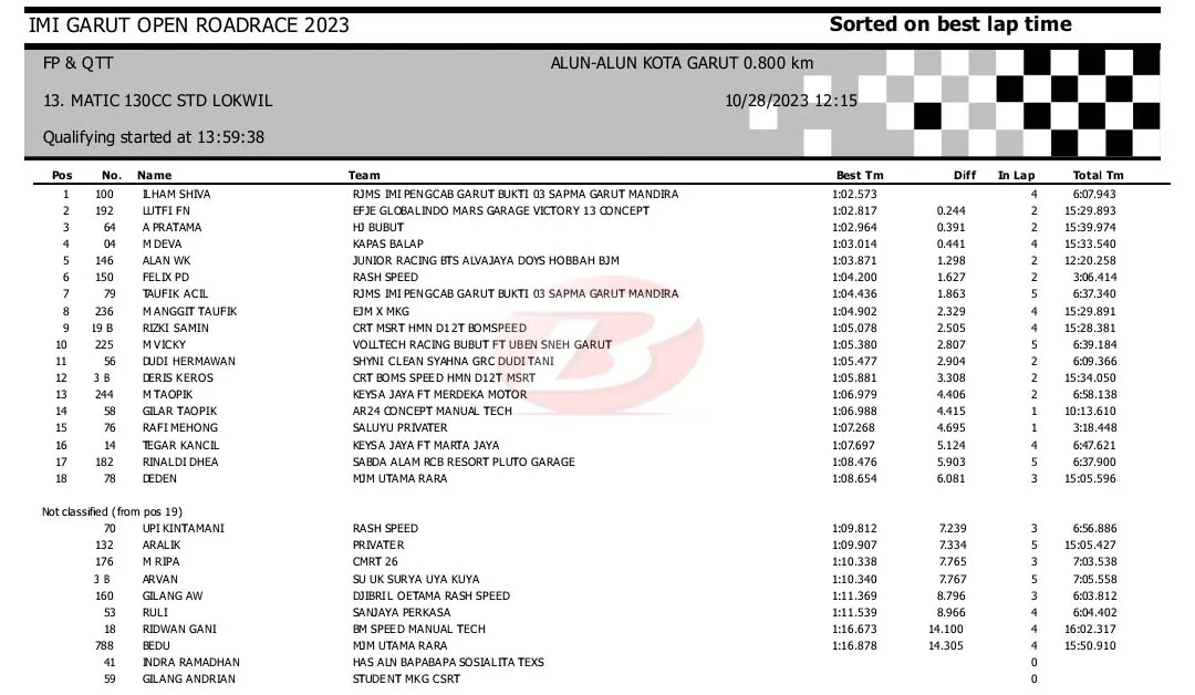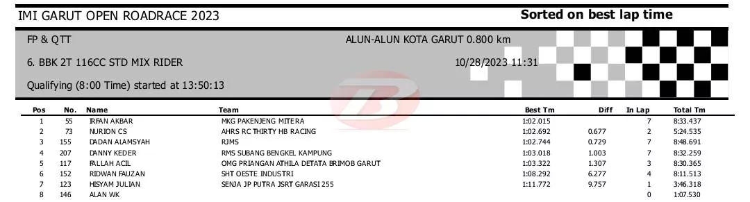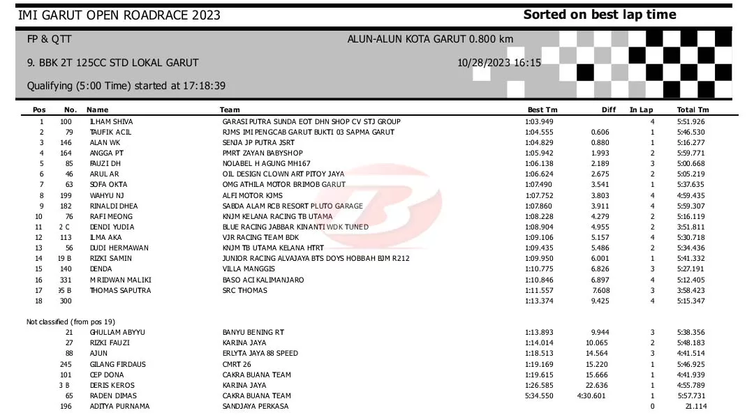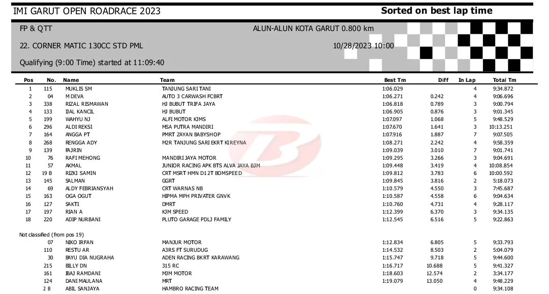 BalapMotor.Net – Berikut merupakan hasil kualifikasi kejuaraan balap motor bertajuk IMI Garut Open Road Race 2023 yang berlangsung di sirkuit Alun-alun Kota Garut pada Sabtu 28 Oktober 2023. (***)