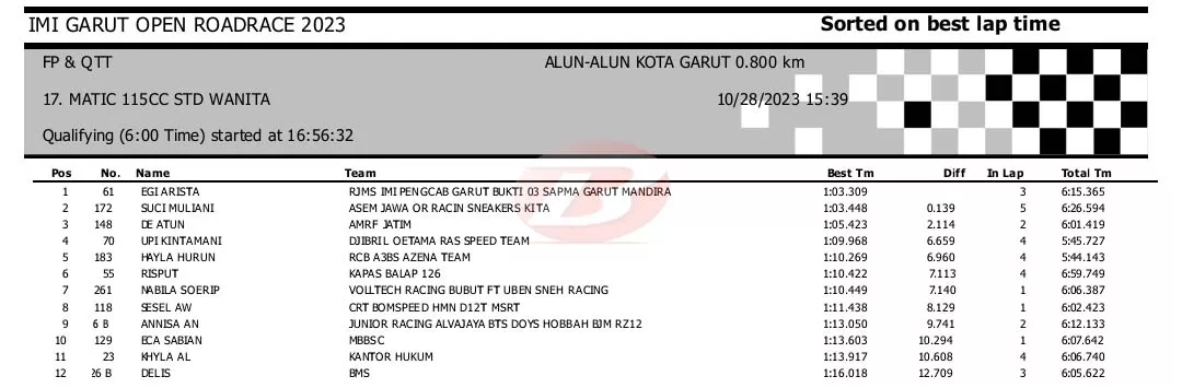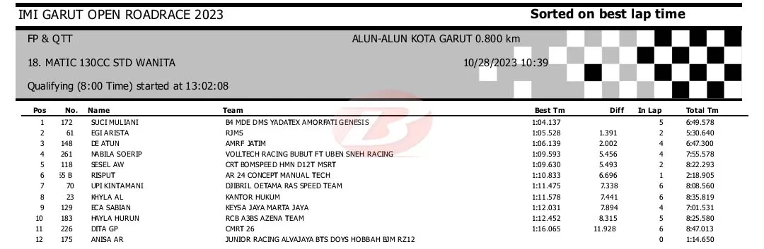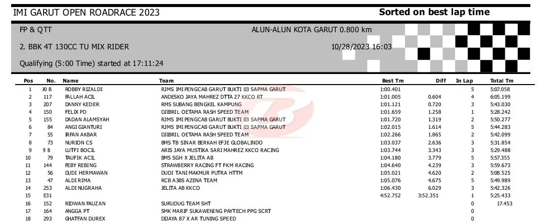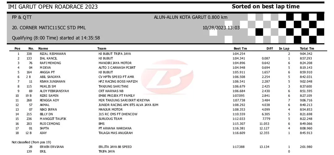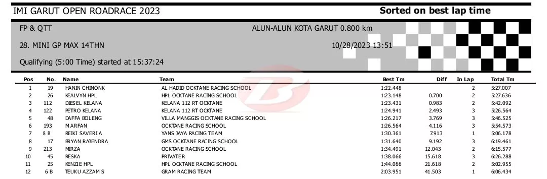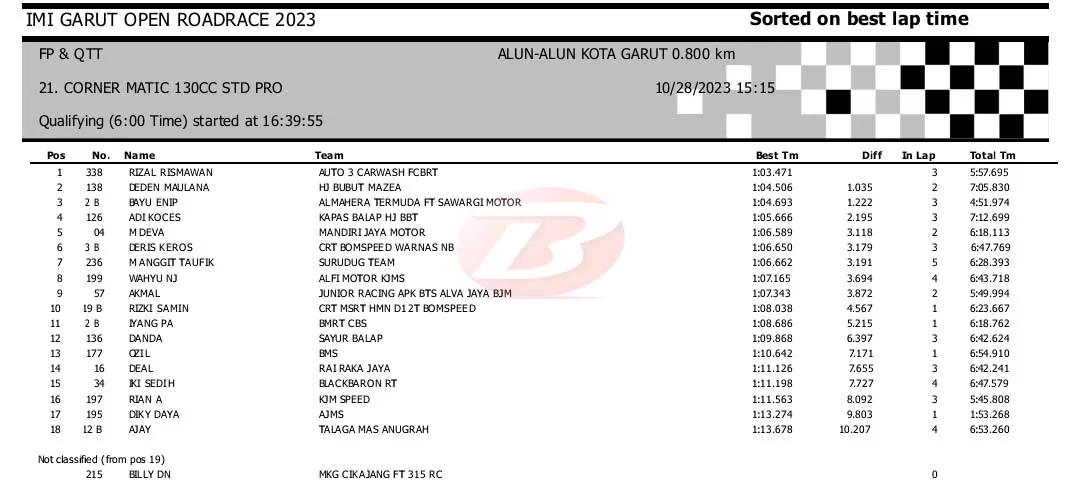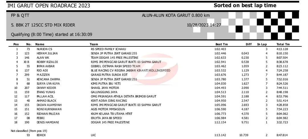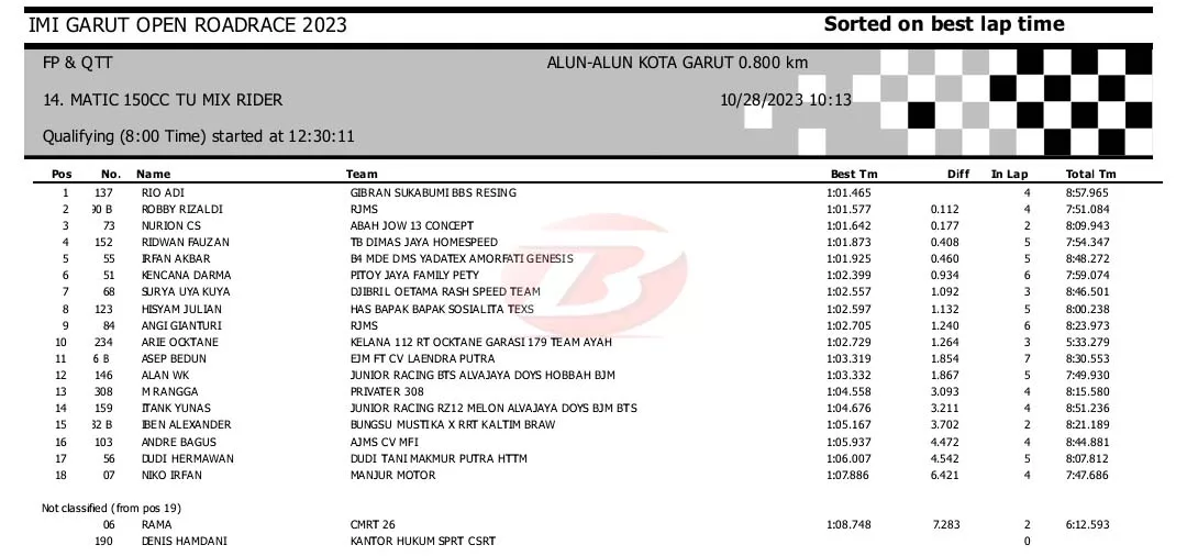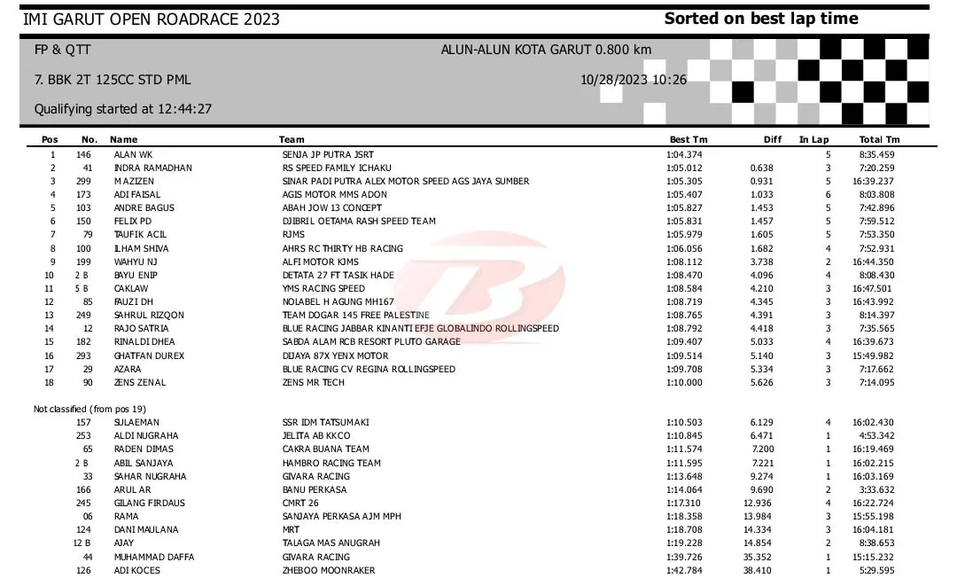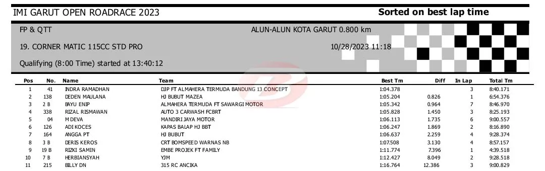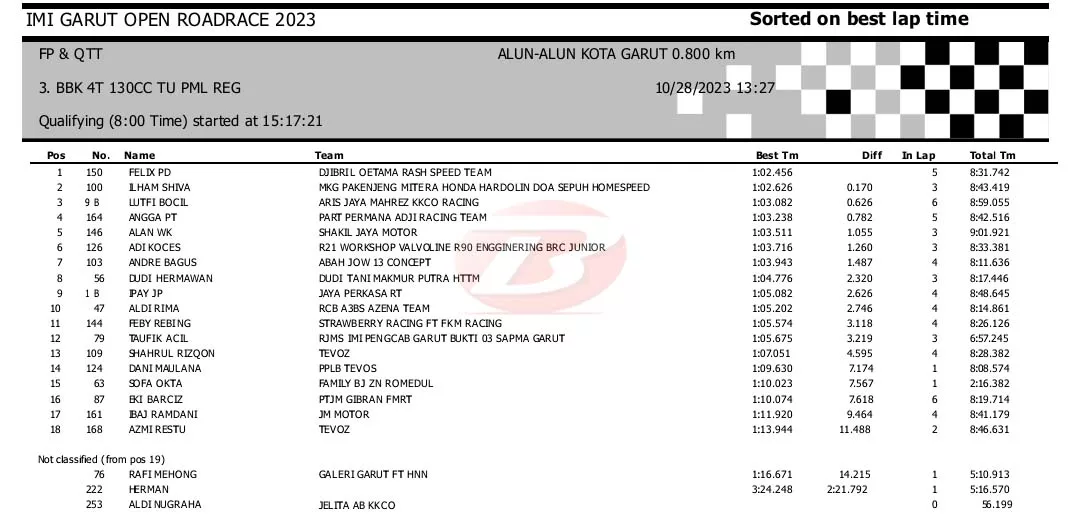 BalapMotor.Net – Berikut merupakan hasil kualifikasi kejuaraan balap motor bertajuk IMI Garut Open Road Race 2023 yang berlangsung di sirkuit Alun-alun Kota Garut pada Sabtu 28 Oktober 2023. (***)