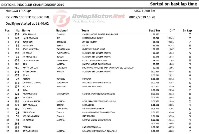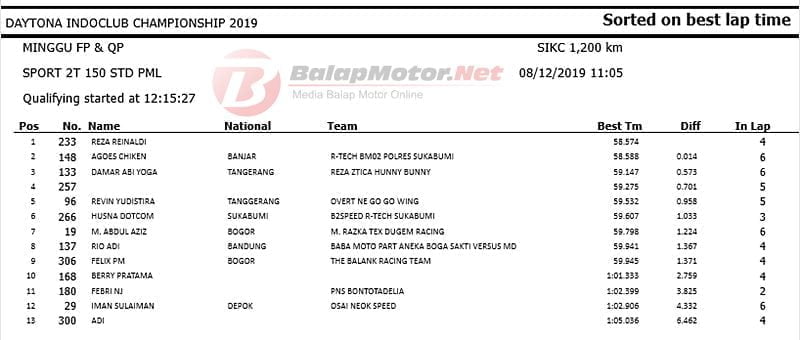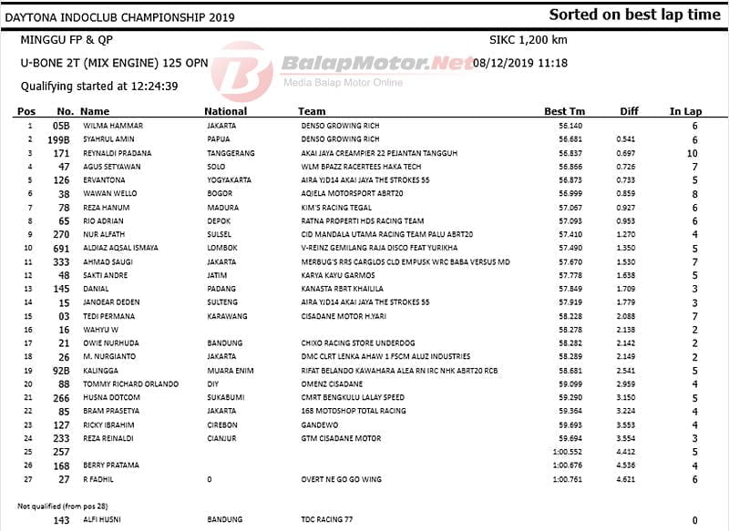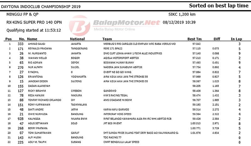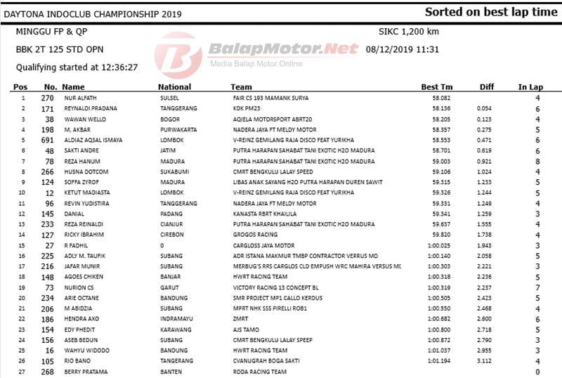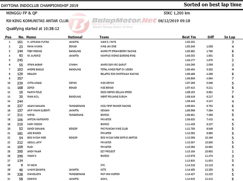 BalapMotor.Net – Berikut kami paparkan hasil QTT Putaran final Daytona Indoclub Championship 2019 yang berlangsung di sirkuit Sentul Karting, Bogor, Jawa Barat pada 8 Desember 2019. | Yugo
