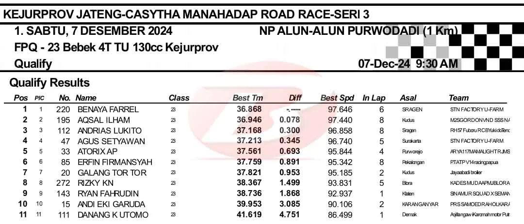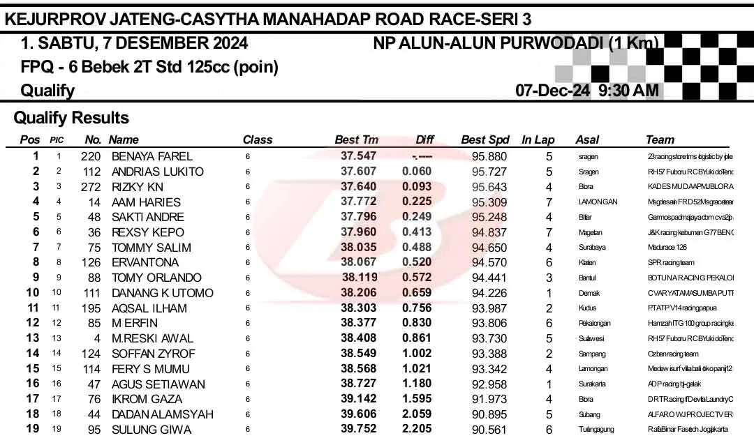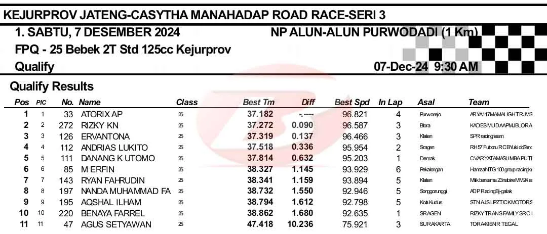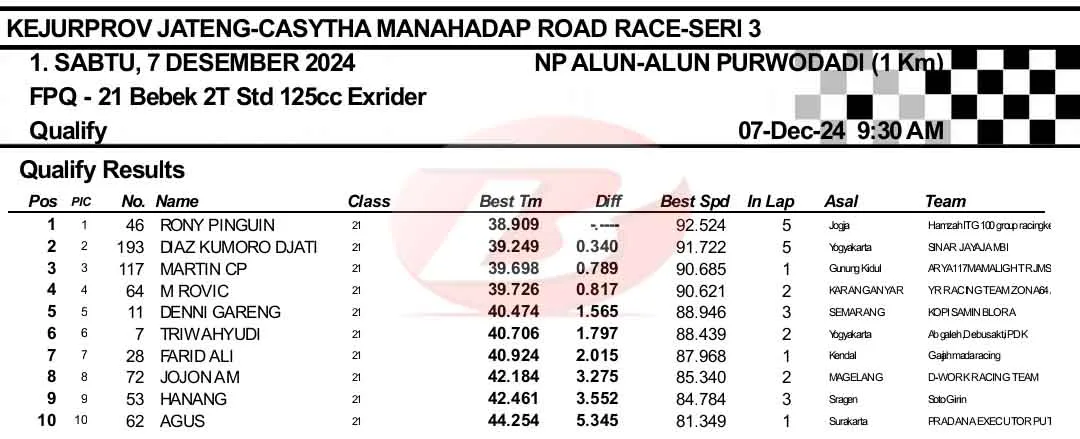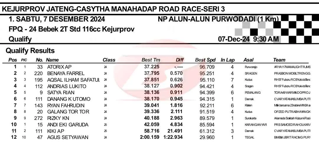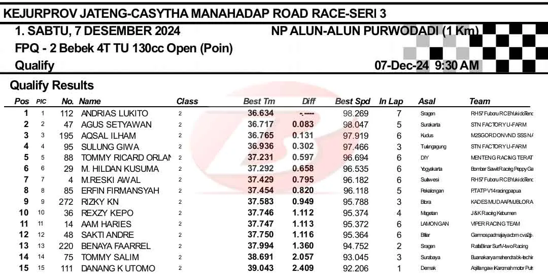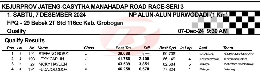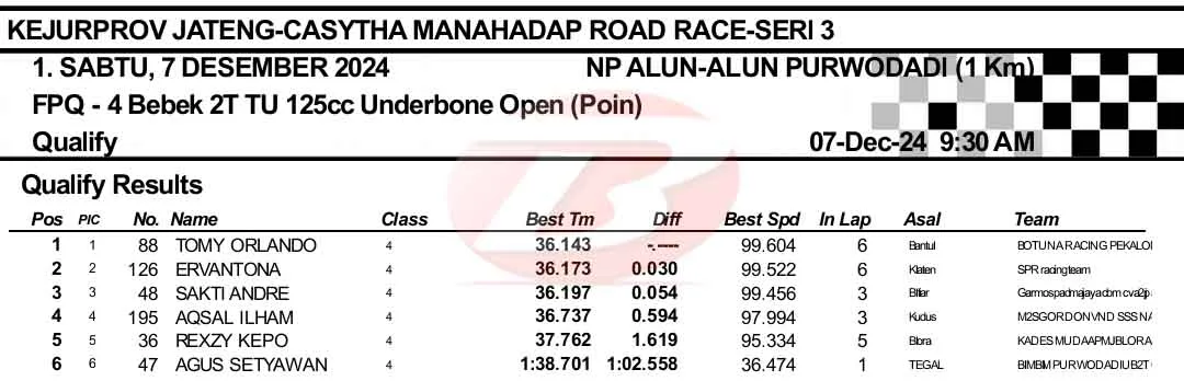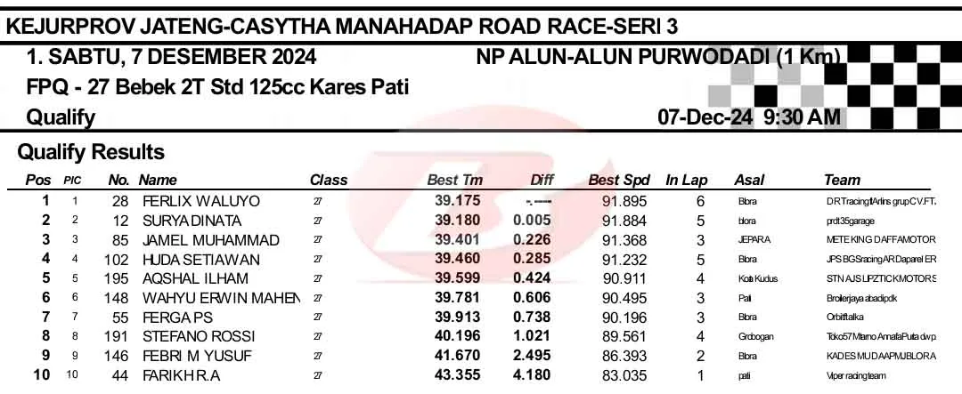 BalapMotor.Net – Berikut merupakan hasil sesi kualifikasi Kejurprov Jateng Casytha Manahadap Road Race Championship 2024 putaran ketiga yang berlangsung di sirkuit NP. Alun-alun Purwodadi, Jawa Tengah pada Sabtu 7 Desember 2024. (***)