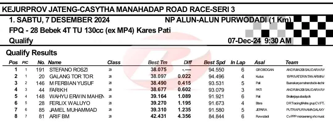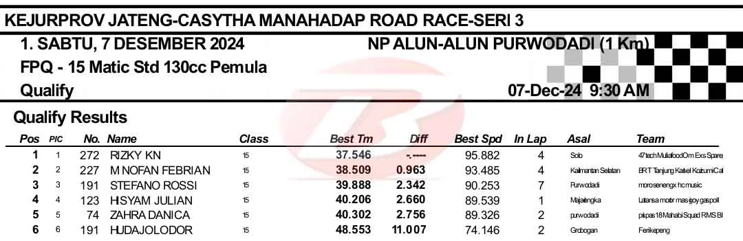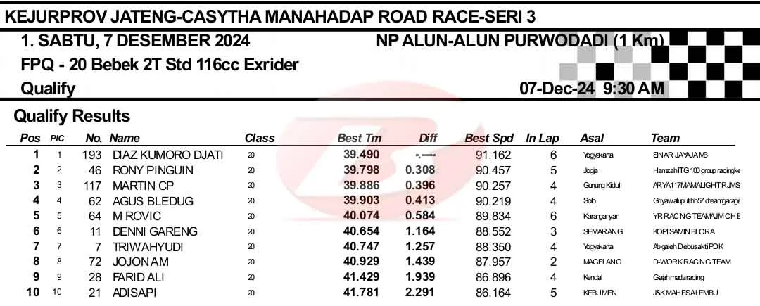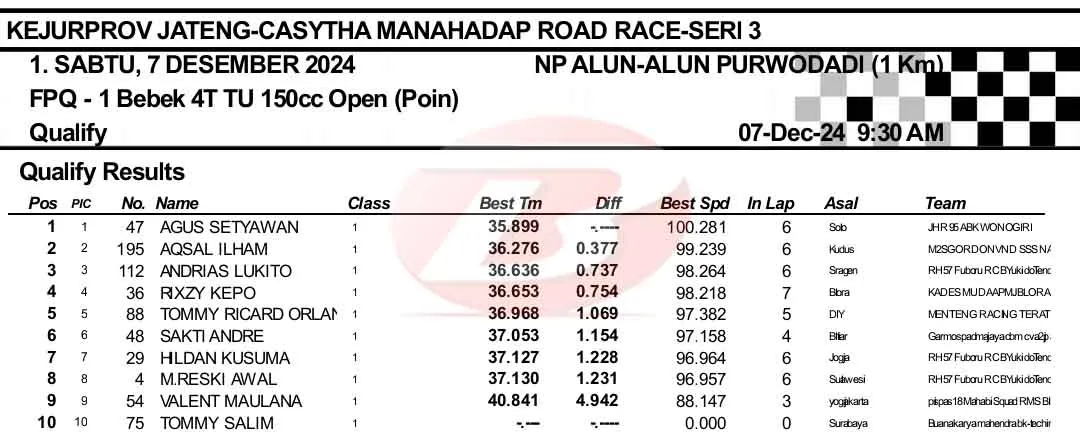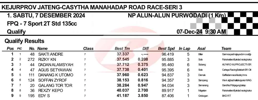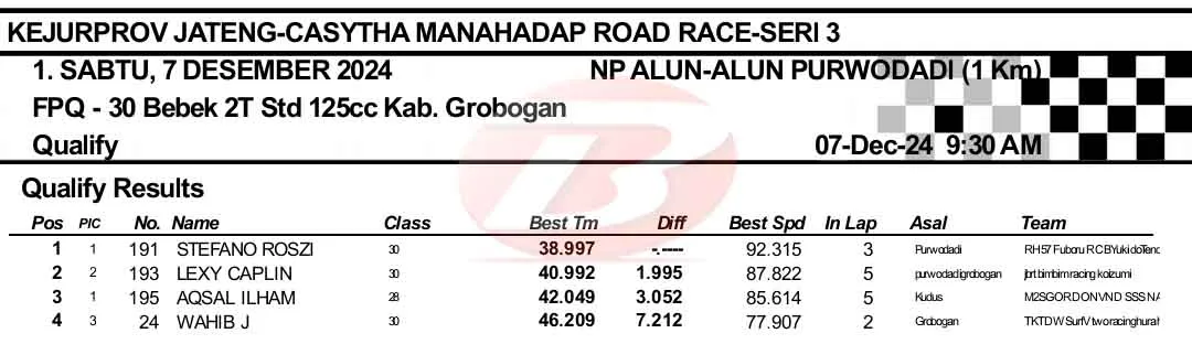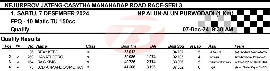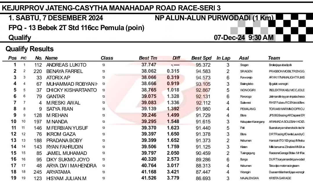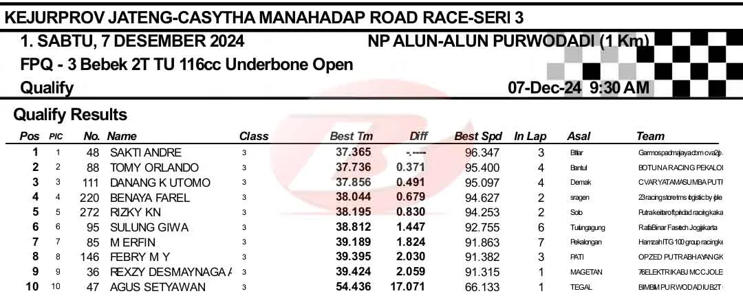 BalapMotor.Net – Berikut merupakan hasil sesi kualifikasi Kejurprov Jateng Casytha Manahadap Road Race Championship 2024 putaran ketiga yang berlangsung di sirkuit NP. Alun-alun Purwodadi, Jawa Tengah pada Sabtu 7 Desember 2024. (***)