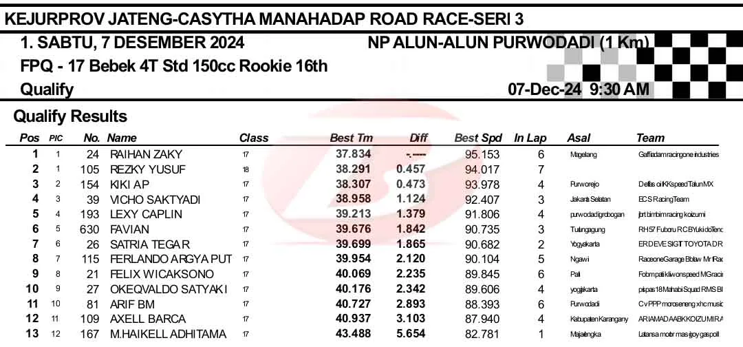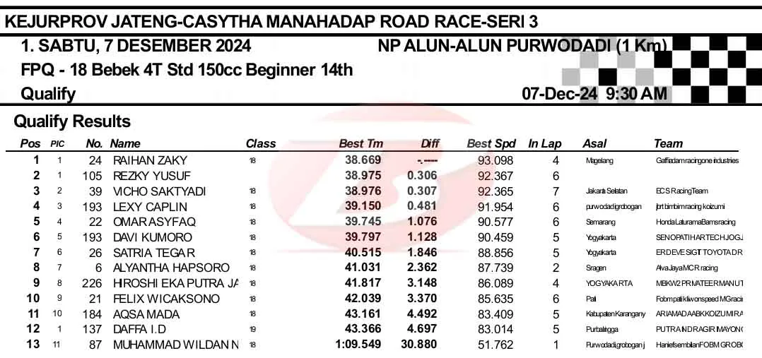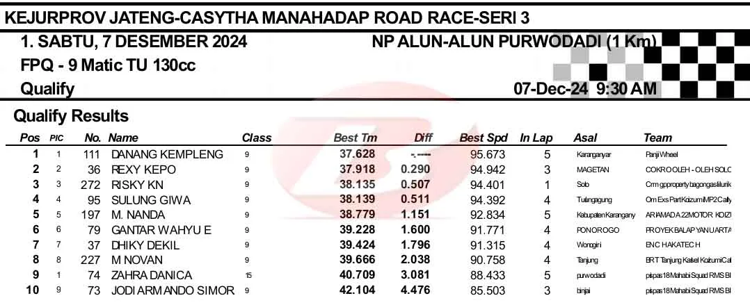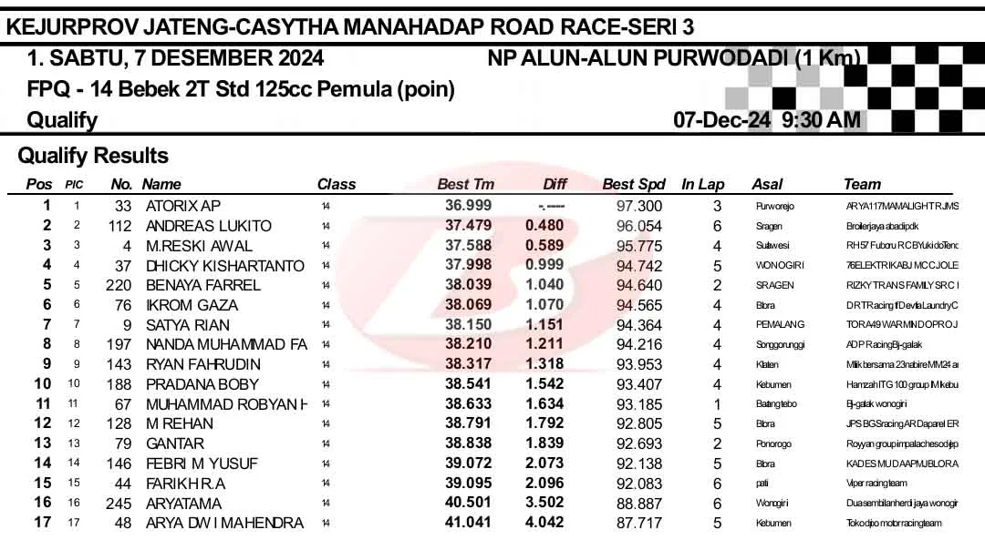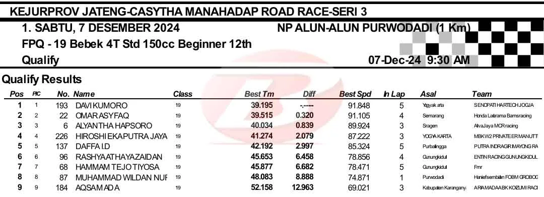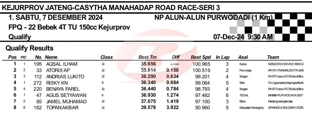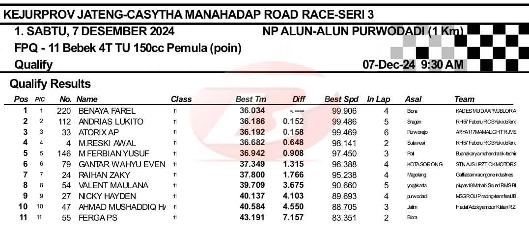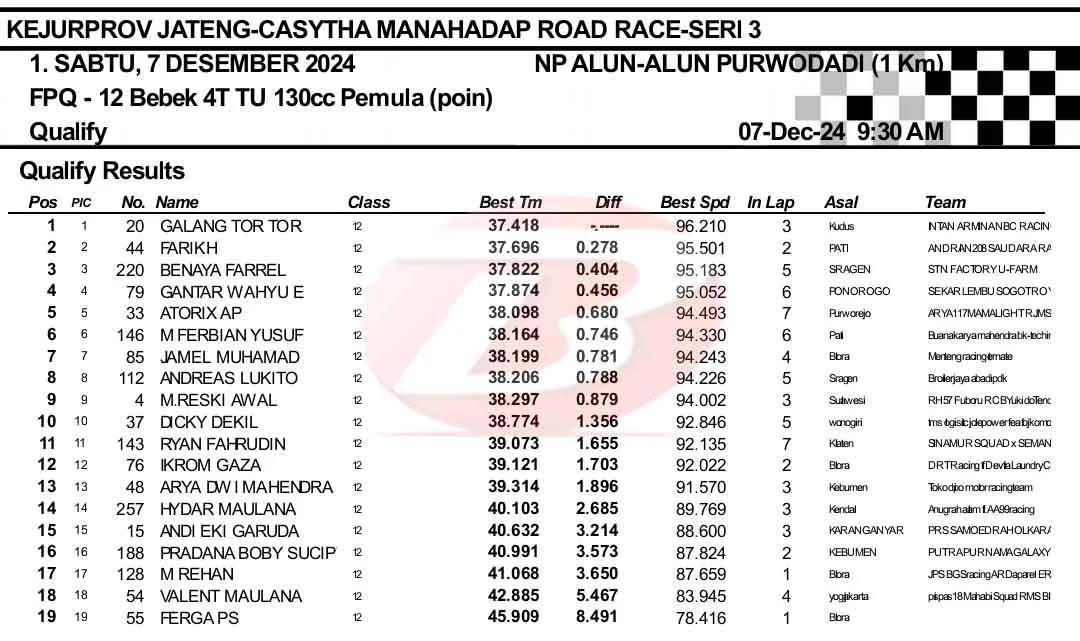 BalapMotor.Net – Berikut merupakan hasil sesi kualifikasi Kejurprov Jateng Casytha Manahadap Road Race Championship 2024 putaran ketiga yang berlangsung di sirkuit NP. Alun-alun Purwodadi, Jawa Tengah pada Sabtu 7 Desember 2024. (***)