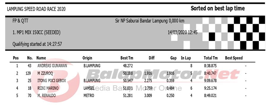 BalapMotor.Net Berikut kami paparkan hasil QTT Kejuaraan Lampung Speed Road Race 2020 yang berlangsung di sirkuit NP. Saburai, Bandar Lampung pada Sabtu 14 Maret 2020. | Budy