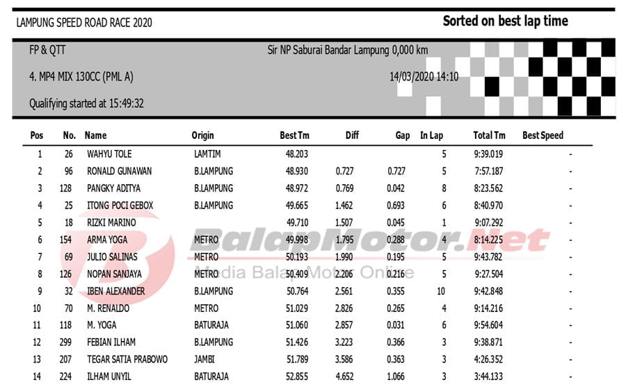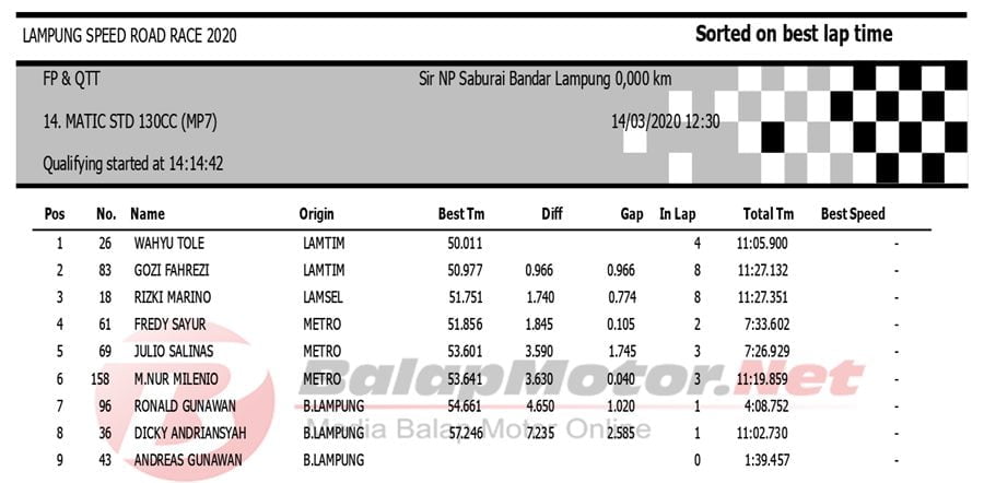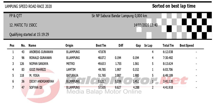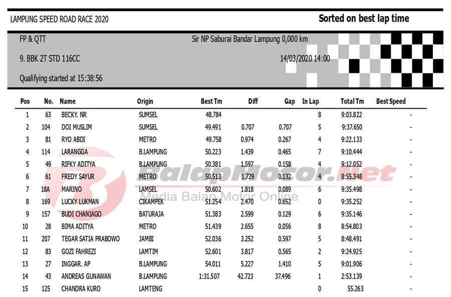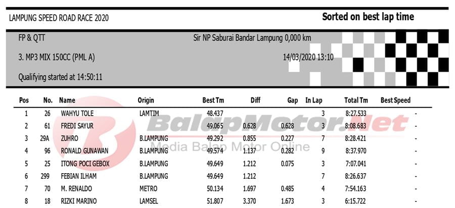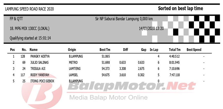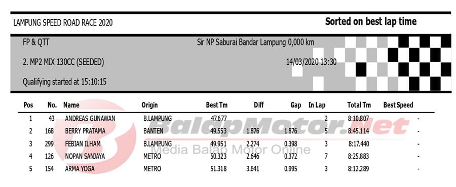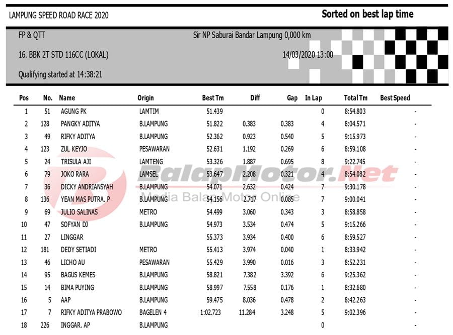 BalapMotor.Net Berikut kami paparkan hasil QTT Kejuaraan Lampung Speed Road Race 2020 yang berlangsung di sirkuit NP. Saburai, Bandar Lampung pada Sabtu 14 Maret 2020. | Budy