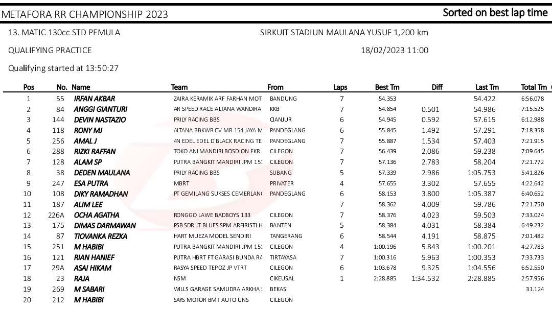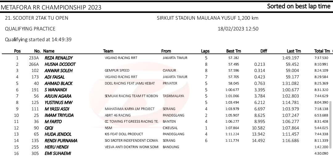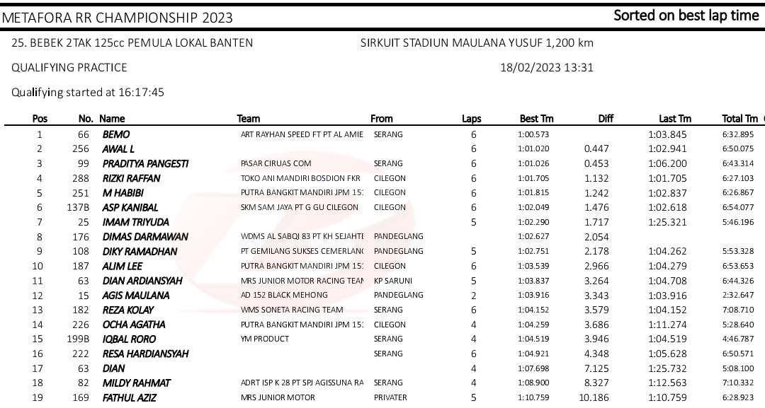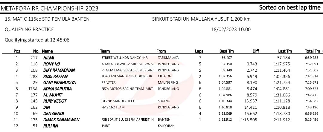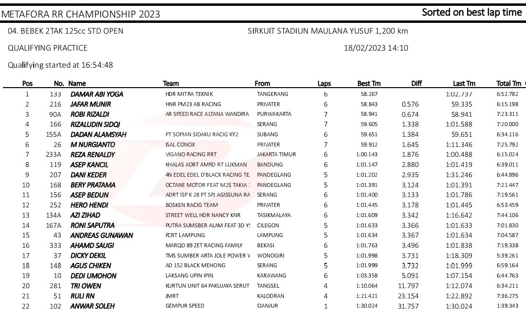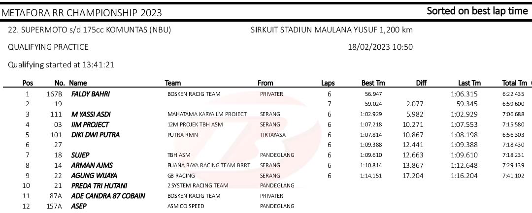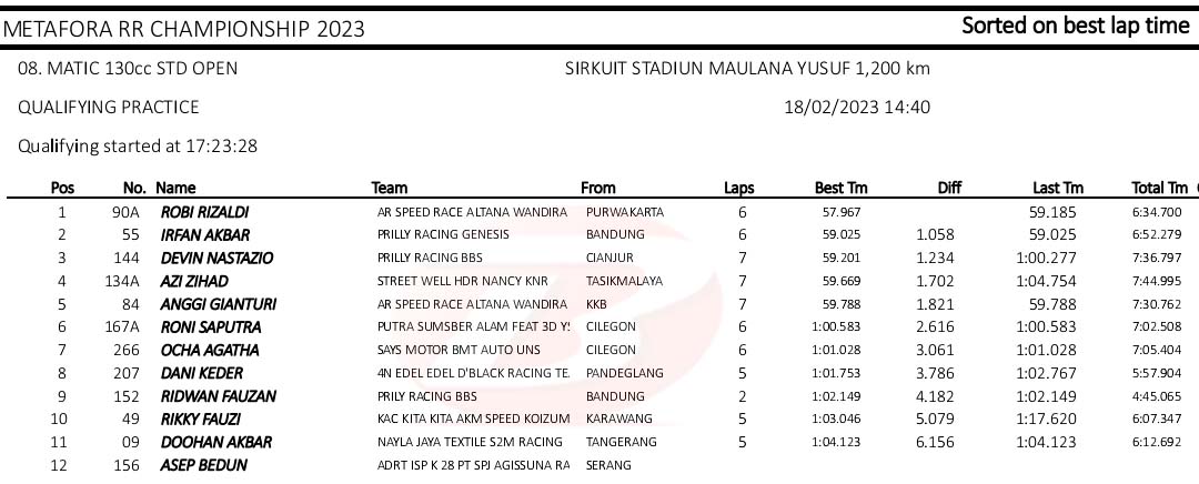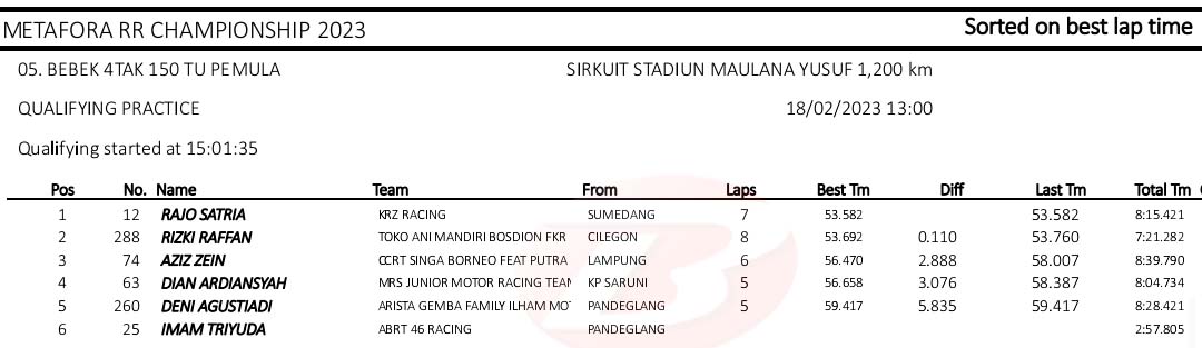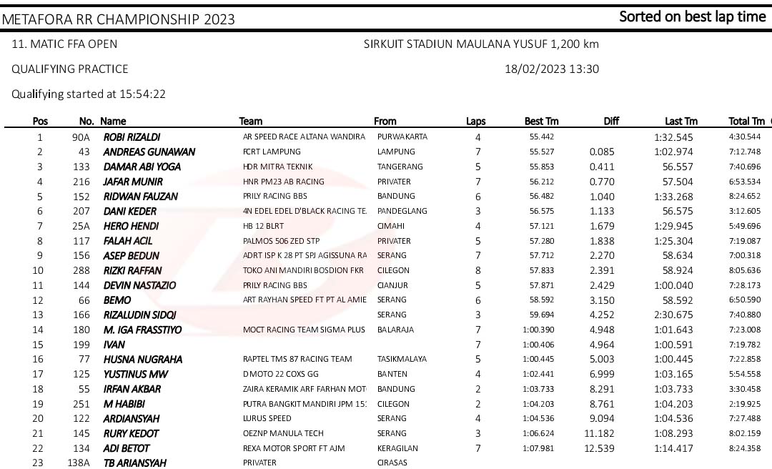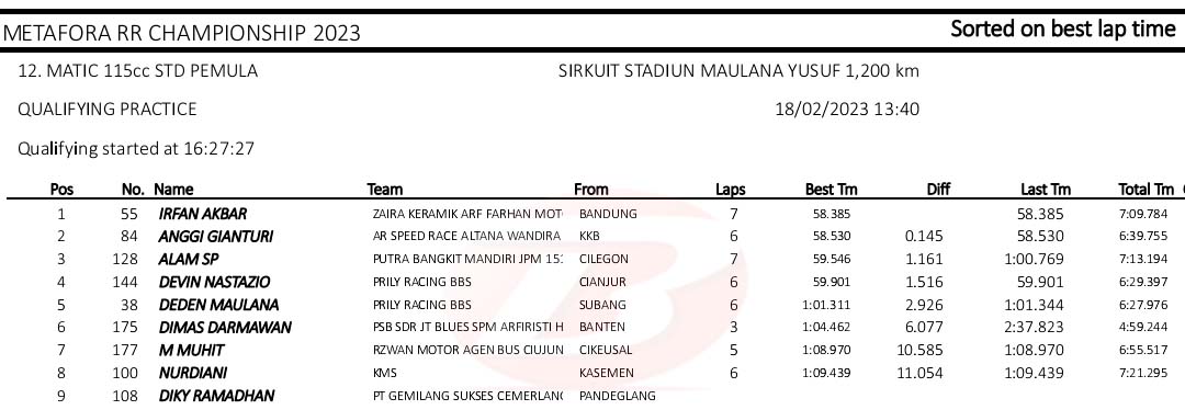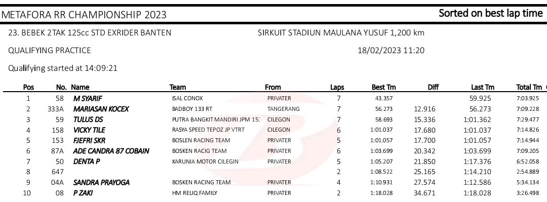 BalapMotor.Net – Berikut merupakan hasil kualifikasi kejuaraan balap motor Metafora Road Race Championship 2023 yang berlangsung di sirkuit NP. Stadion Maulana Yusuf, Serang, Banten pada Sabtu 18 Februari 2023. (*)