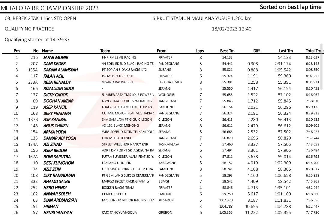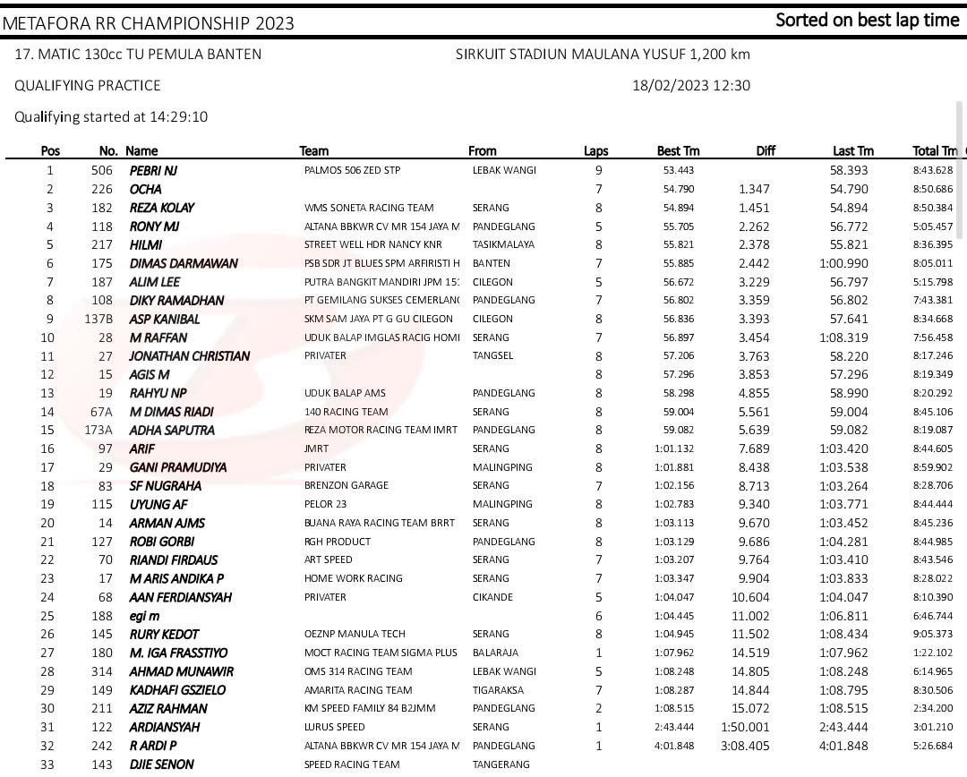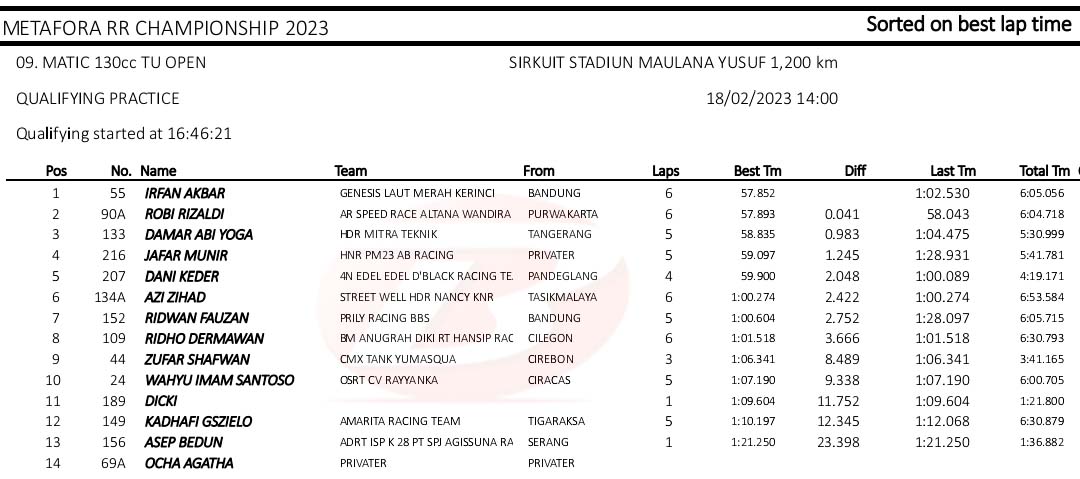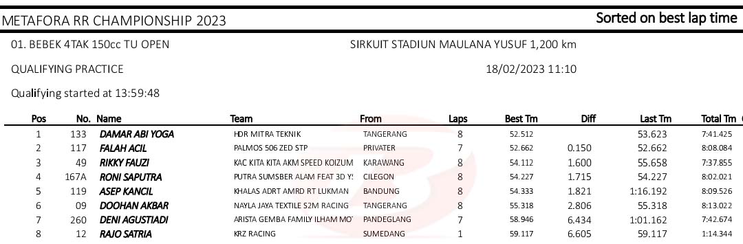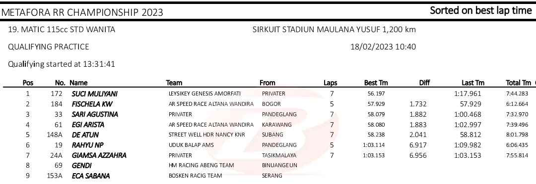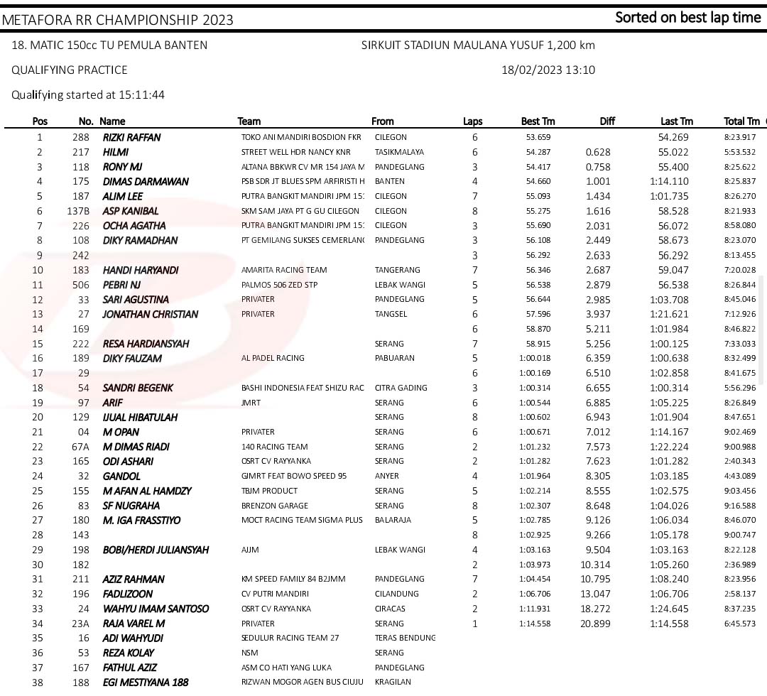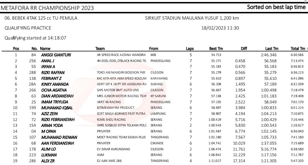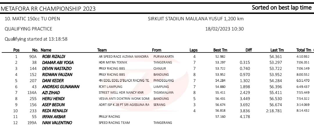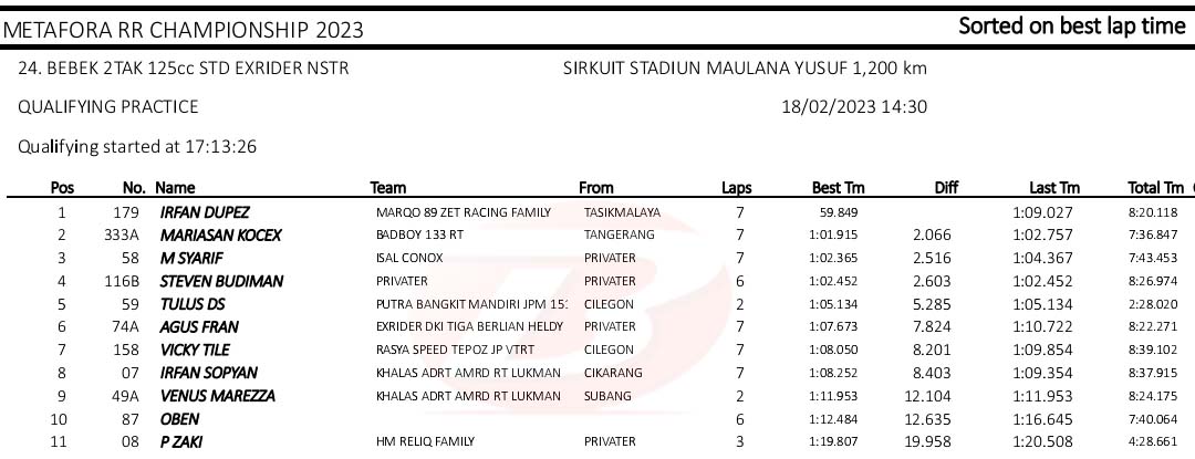 BalapMotor.Net – Berikut merupakan hasil kualifikasi kejuaraan balap motor Metafora Road Race Championship 2023 yang berlangsung di sirkuit NP. Stadion Maulana Yusuf, Serang, Banten pada Sabtu 18 Februari 2023. (*)