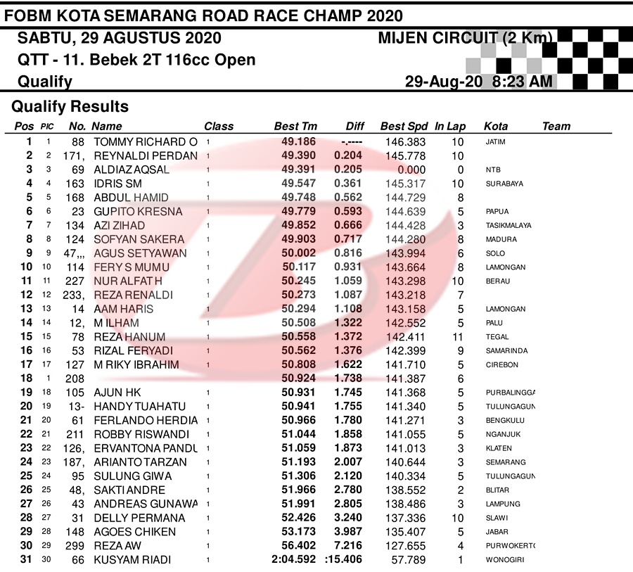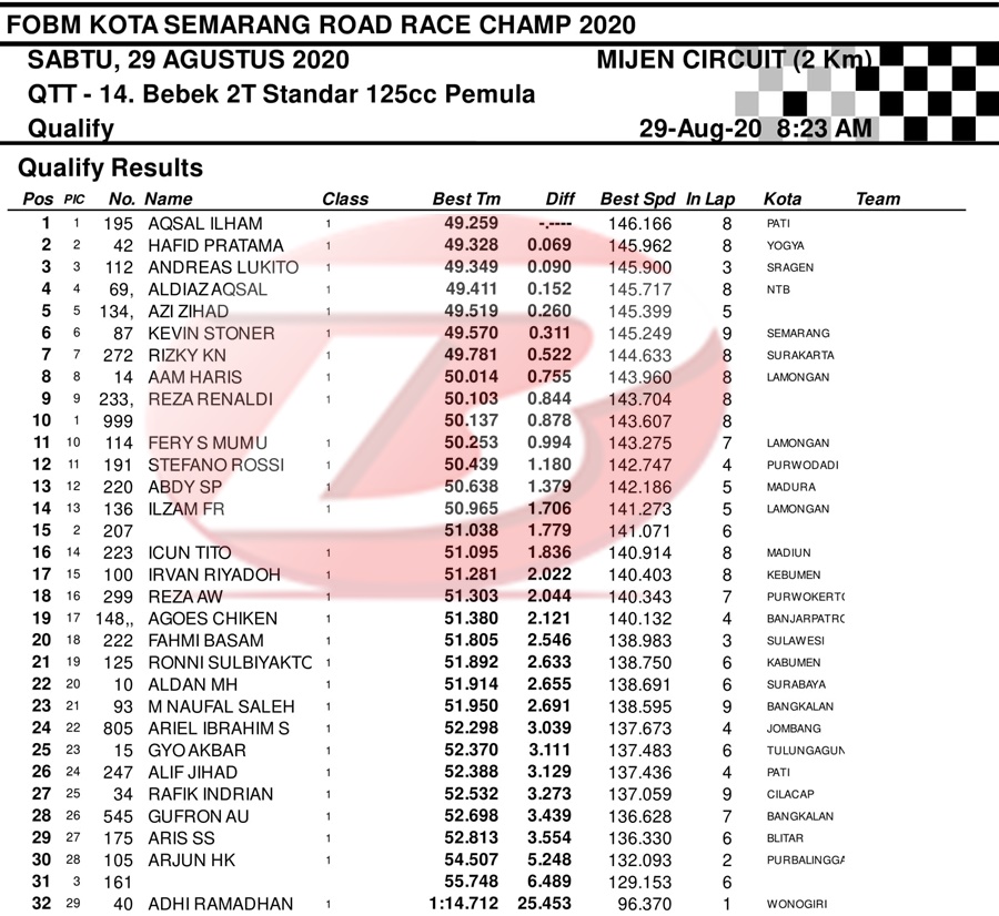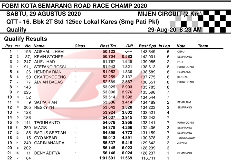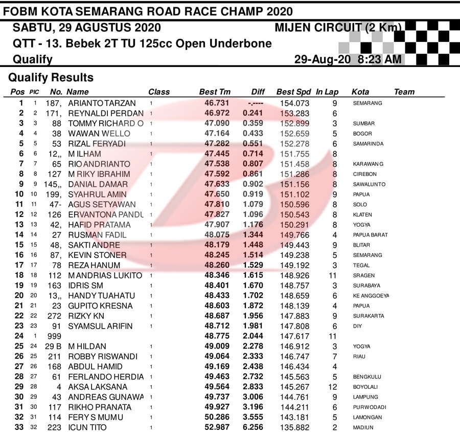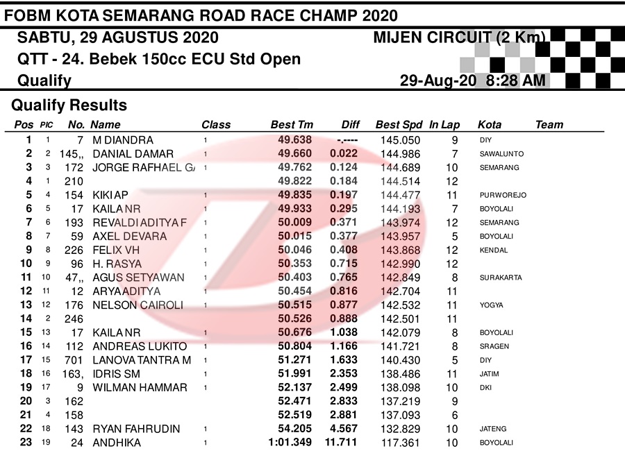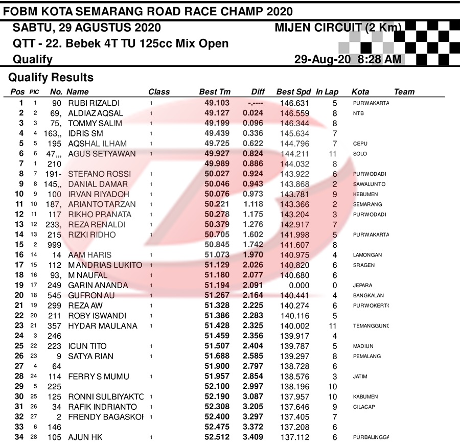 BalapMotor.Net – Berikut merupakan hasil dari jalannya QTT kejuaraan balap motor bertajuk FOBM Kota Semarang Road Race Championship 2020 yang berlangsung di sirkuit Mijen, Semarang, Jawa Tengah pada Sabtu 29 Agustus 2020.