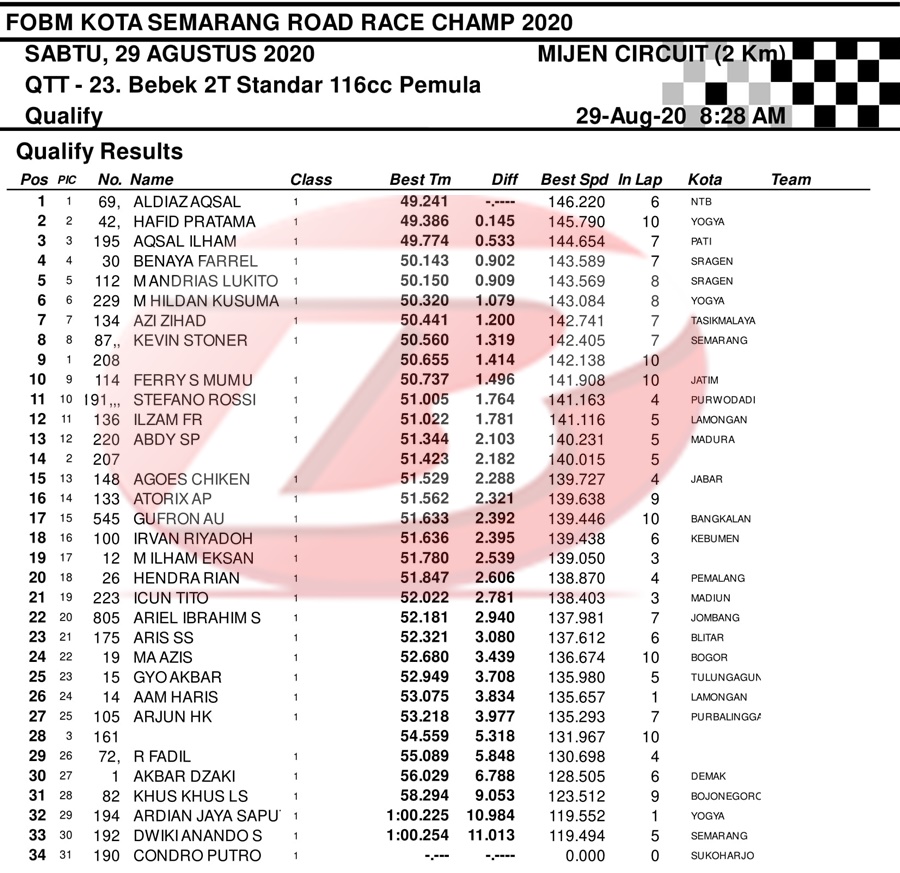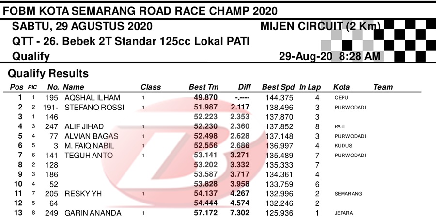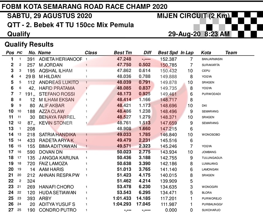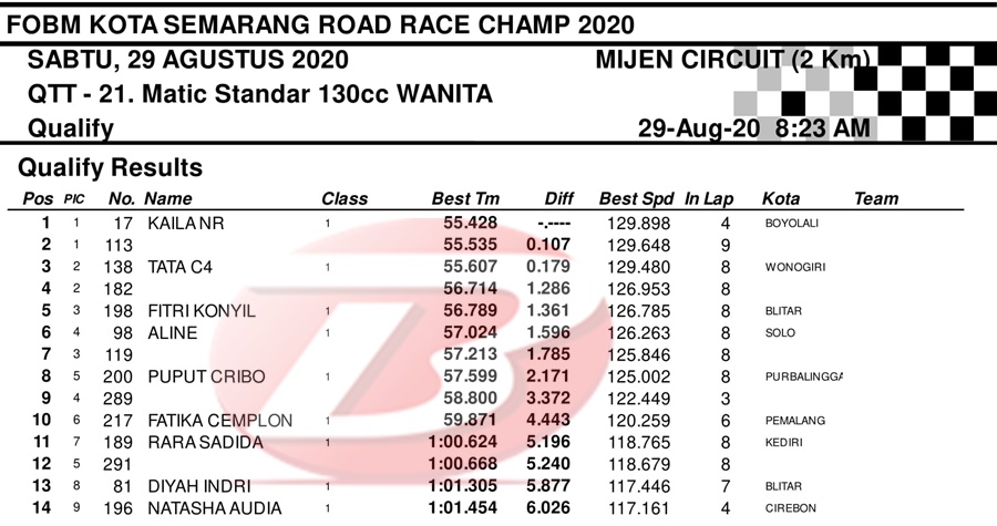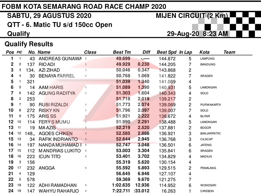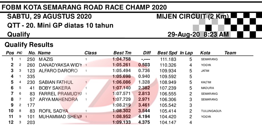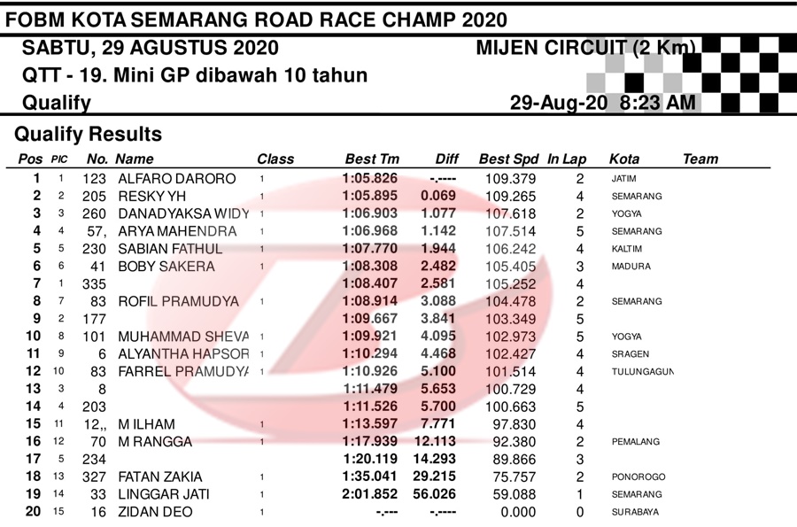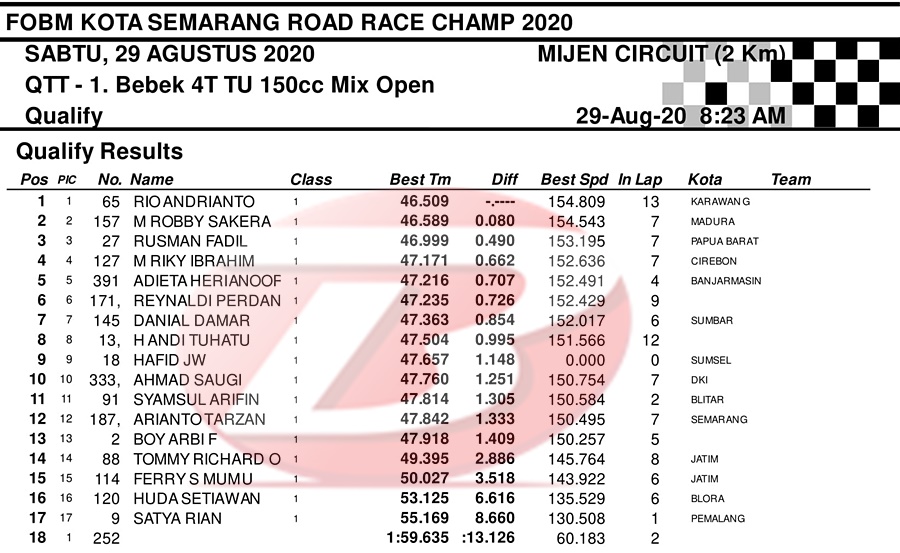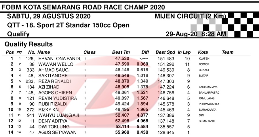 BalapMotor.Net – Berikut merupakan hasil dari jalannya QTT kejuaraan balap motor bertajuk FOBM Kota Semarang Road Race Championship 2020 yang berlangsung di sirkuit Mijen, Semarang, Jawa Tengah pada Sabtu 29 Agustus 2020.
