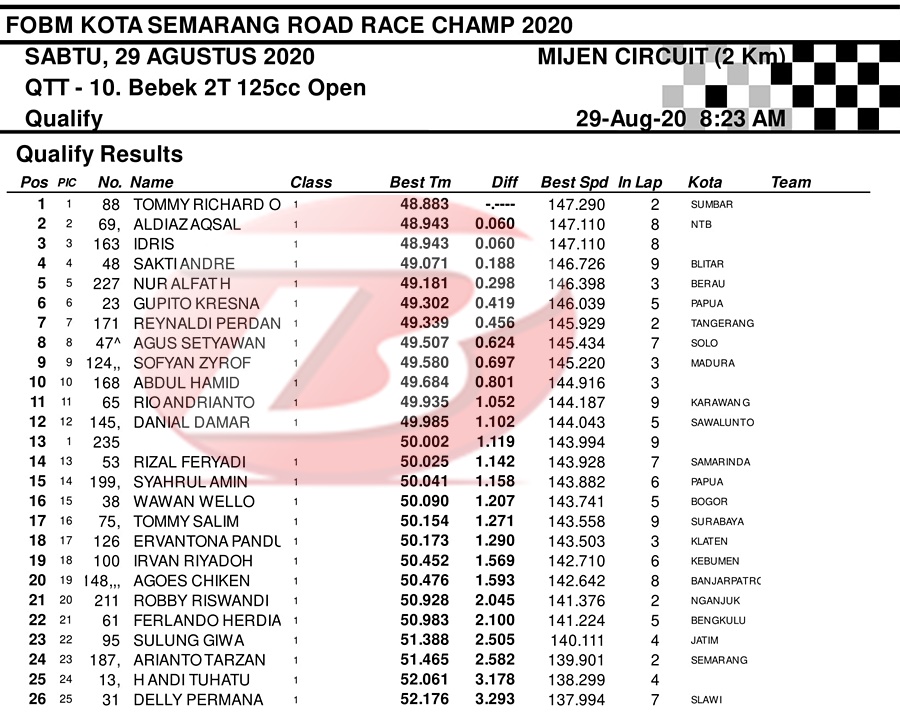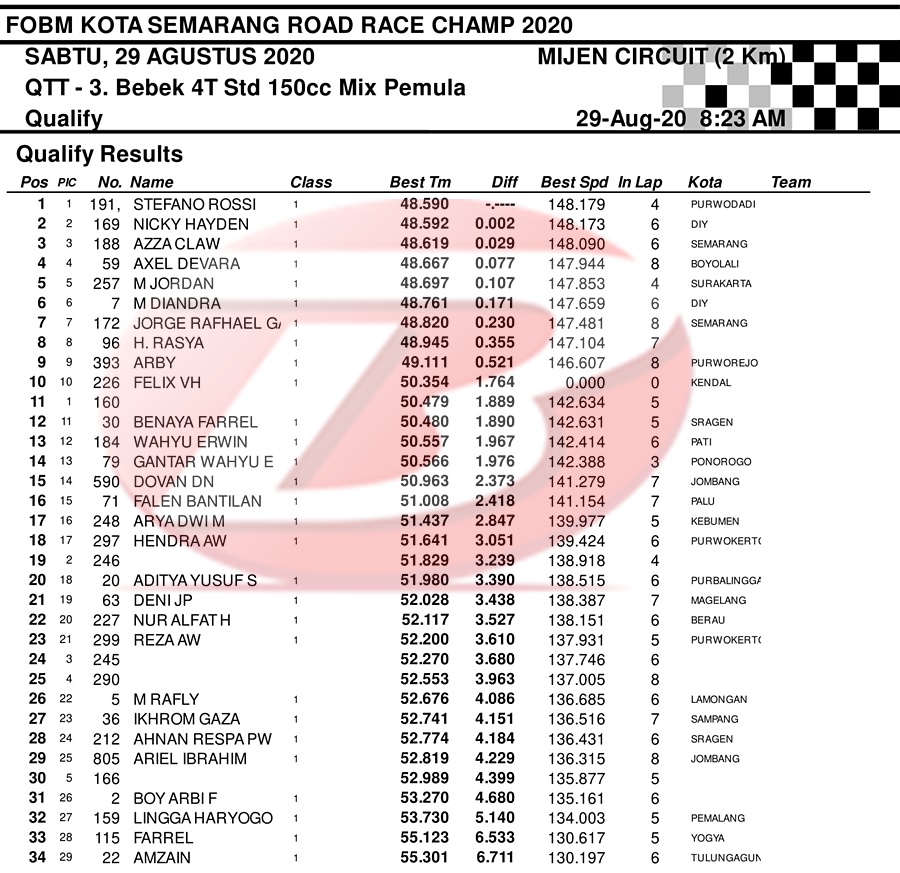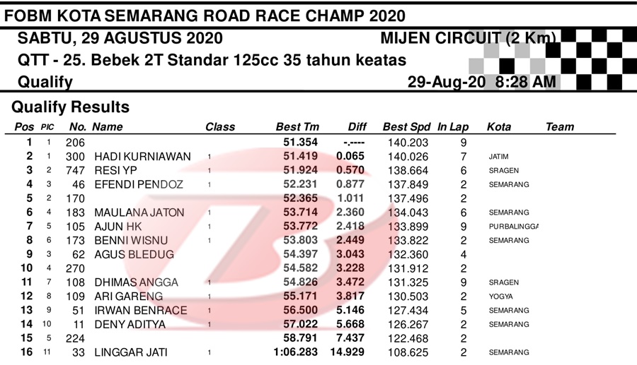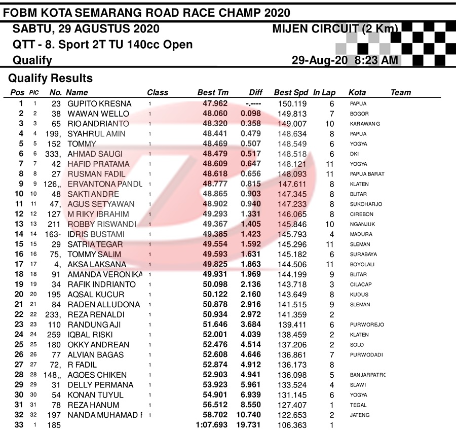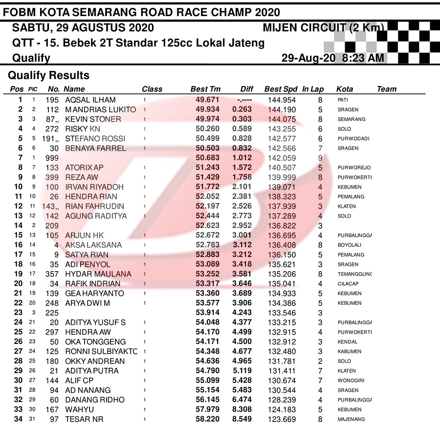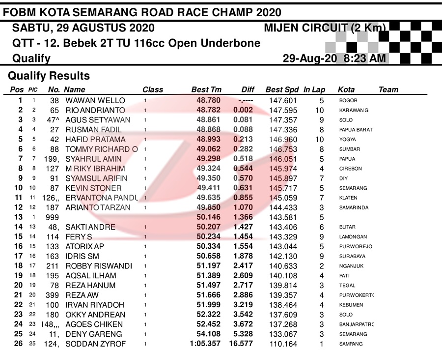BalapMotor.Net – Berikut merupakan hasil dari jalannya QTT kejuaraan balap motor bertajuk FOBM Kota Semarang Road Race Championship 2020 yang berlangsung di sirkuit Mijen, Semarang, Jawa Tengah pada Sabtu 29 Agustus 2020.