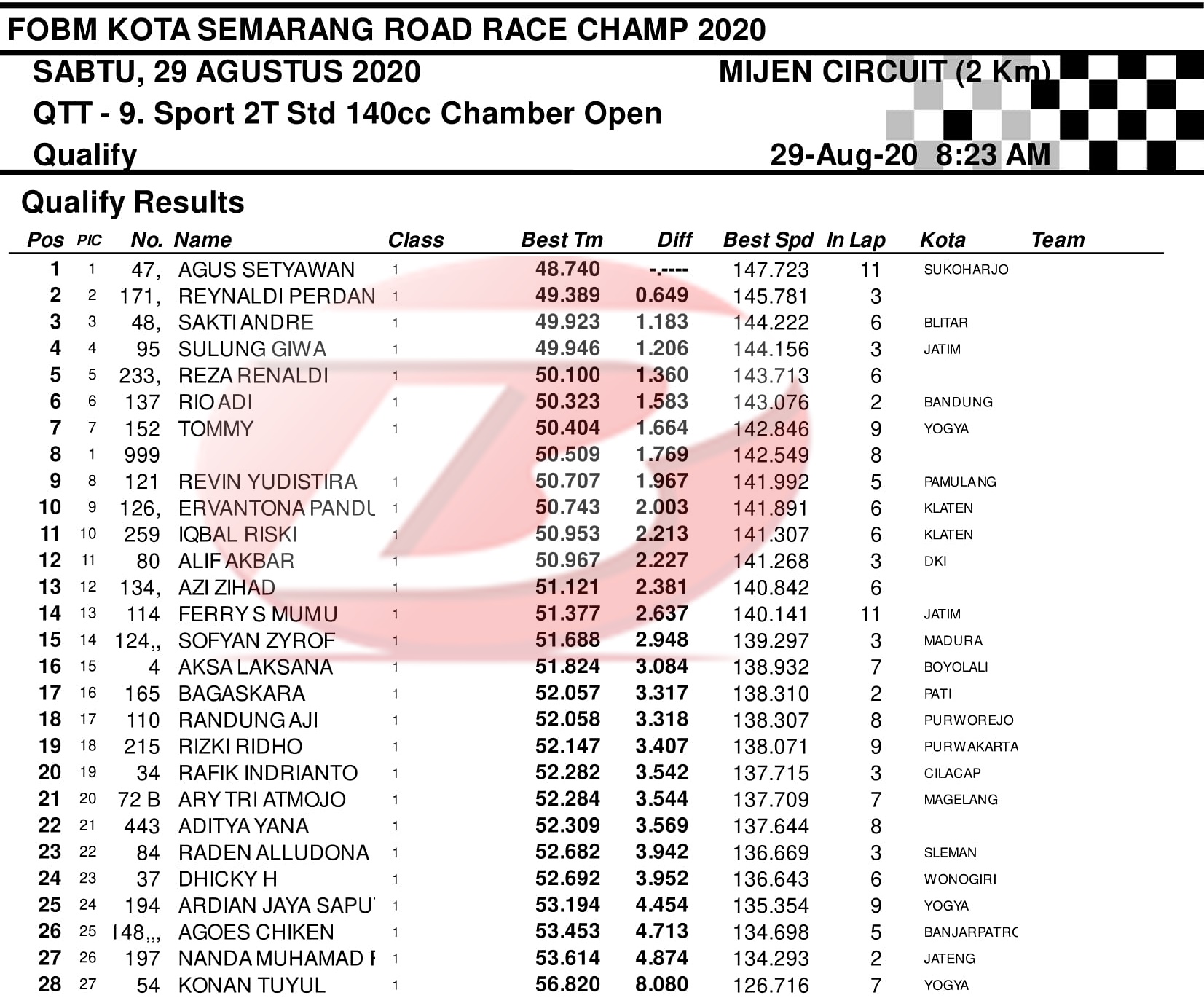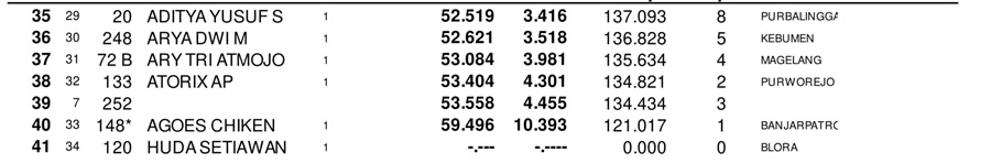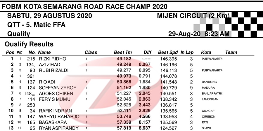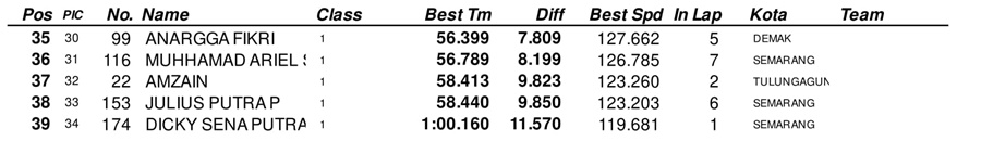 Event balap racikan Indiel Racing Organizer ini diserbu ratusan peserta dari penjuru Indonesia. Persaingan sengit pun sudah terjadi sejak QTT pagi hingga sore hari tadi. Nah, berikut daftar pembalap tercepat disetiap kelasnya.