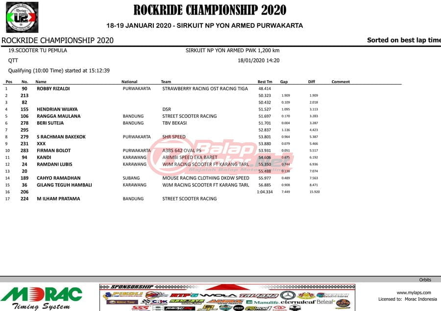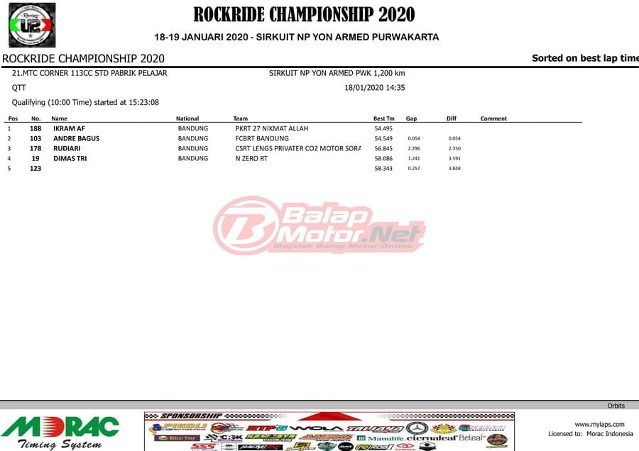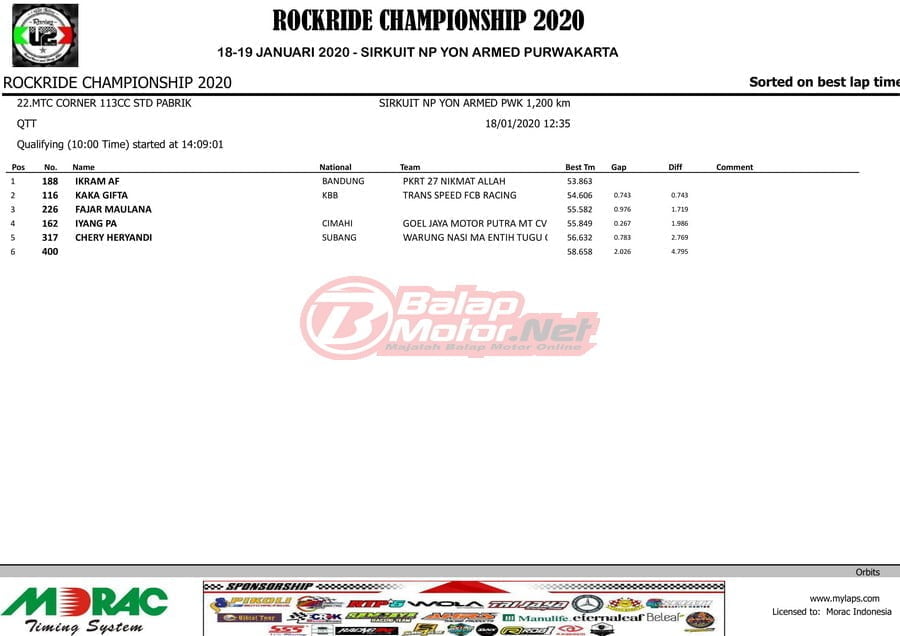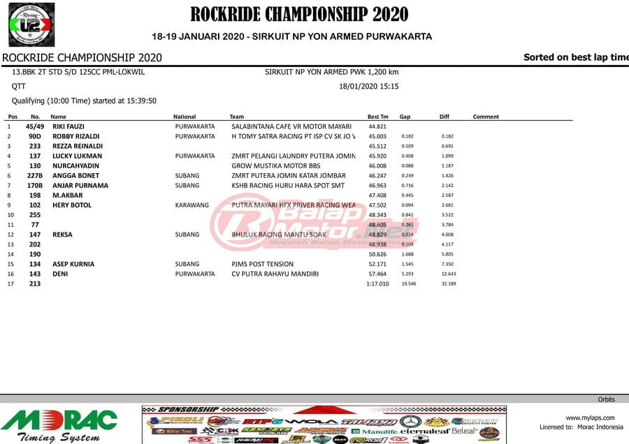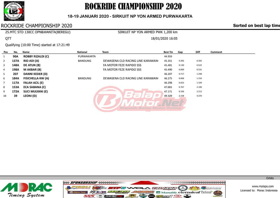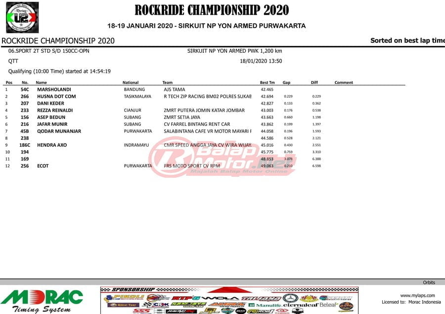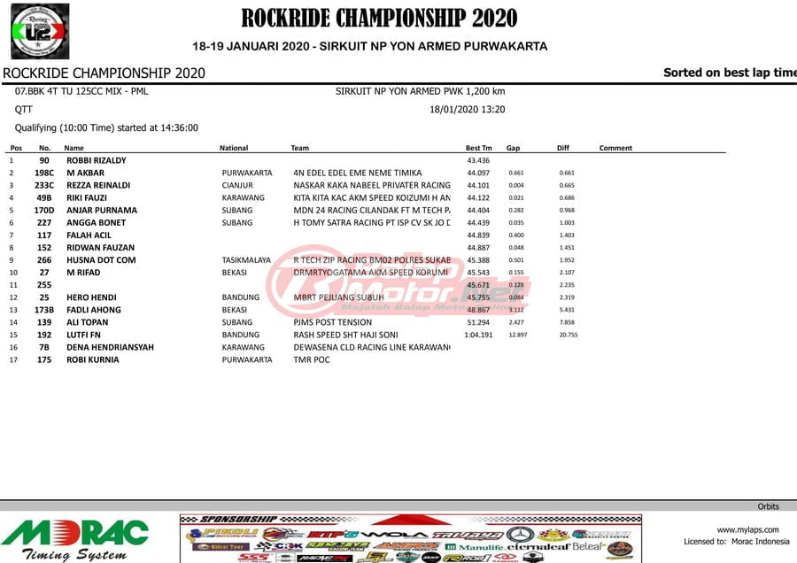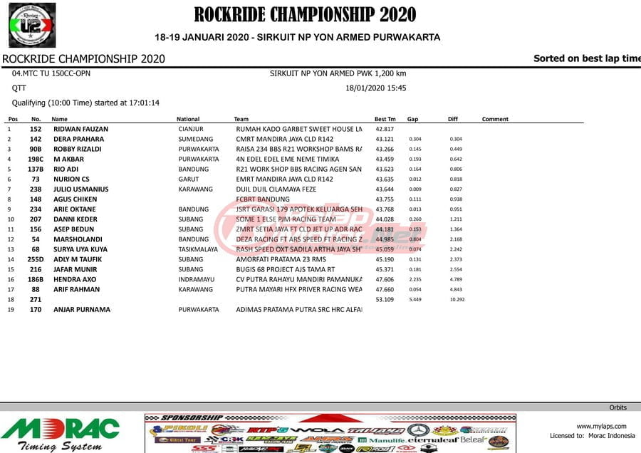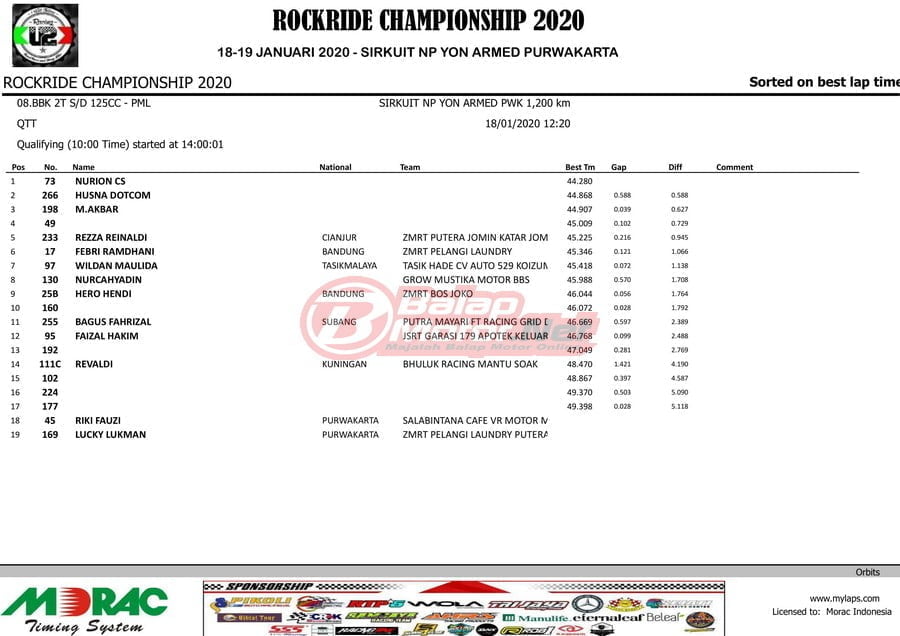 BalapMotor.Net – Berikut merupakan hasil dari sesi Kualifikasi (QTT) pada gelaran RockRide Championship 2020 yang berlangsung di sirkuit NP Yon Armed Purwakarta pada 18 Januari 2020. | Tim