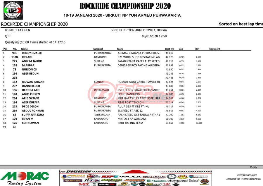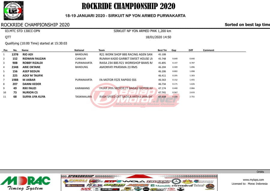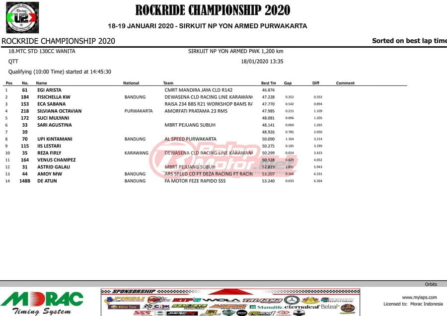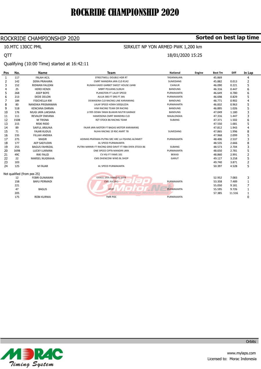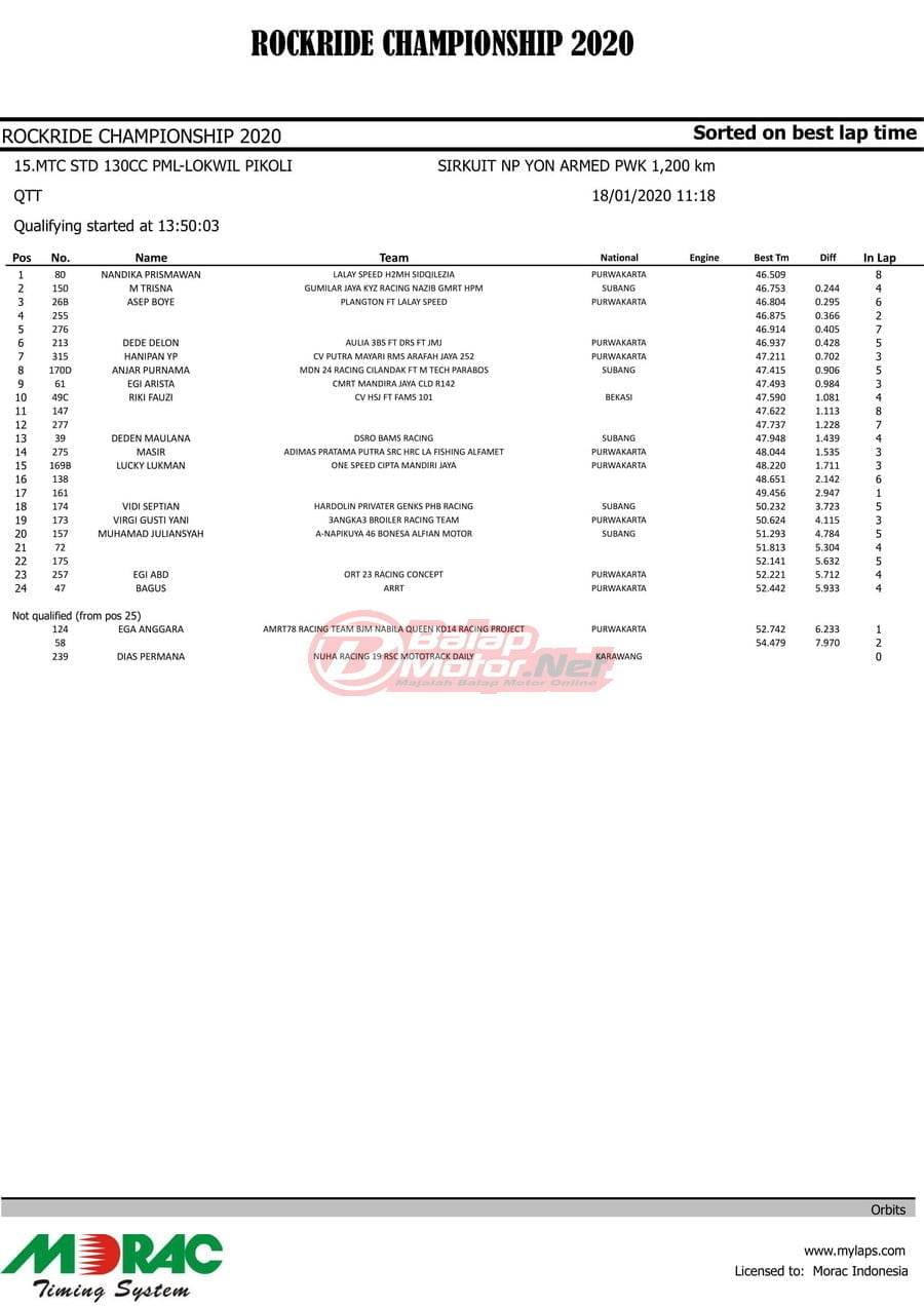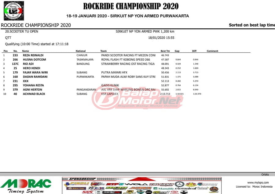 BalapMotor.Net – Berikut merupakan hasil dari sesi Kualifikasi (QTT) pada gelaran RockRide Championship 2020 yang berlangsung di sirkuit NP Yon Armed Purwakarta pada 18 Januari 2020. | Tim