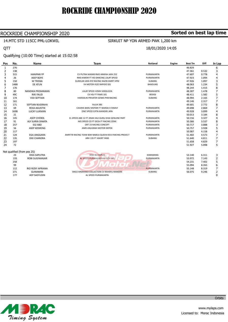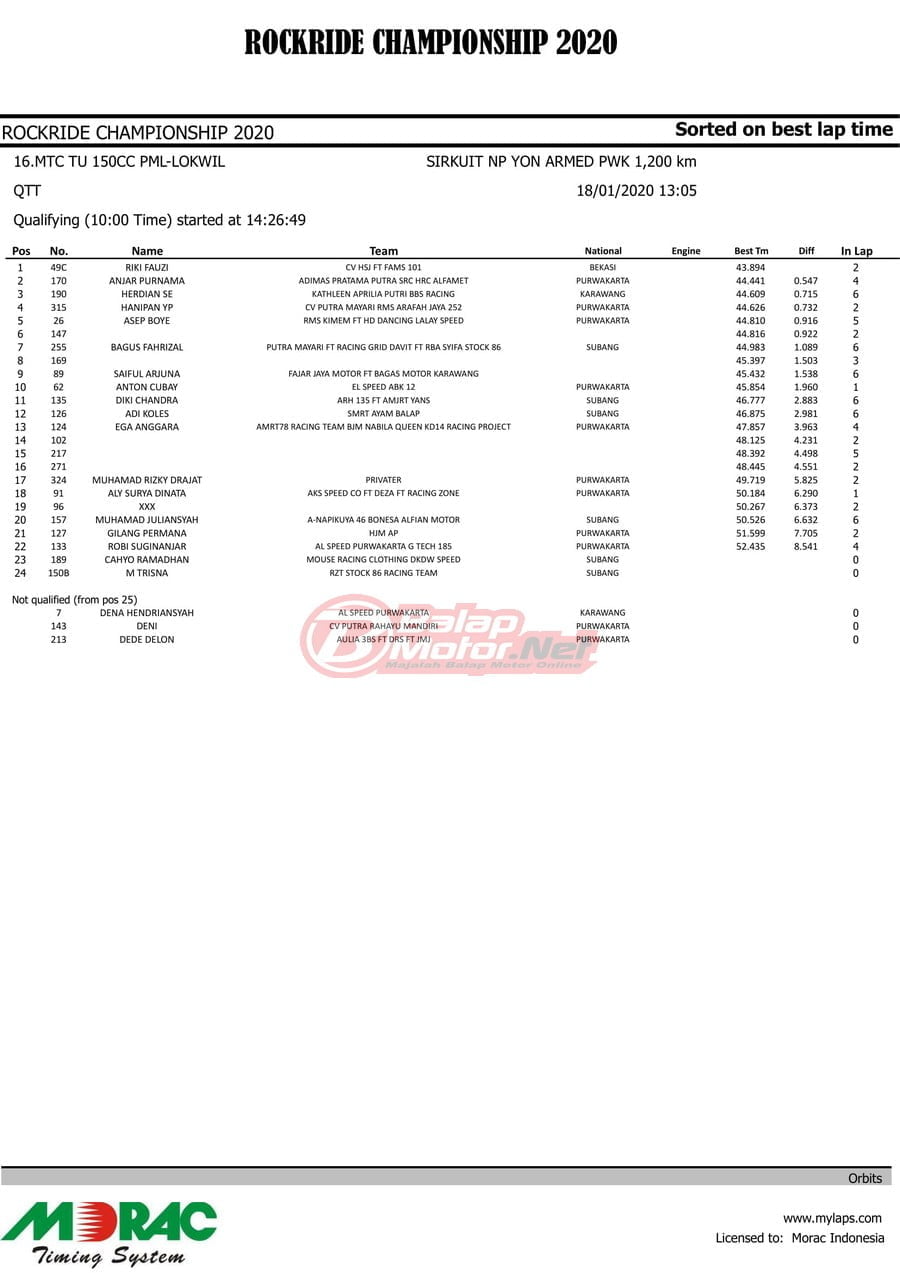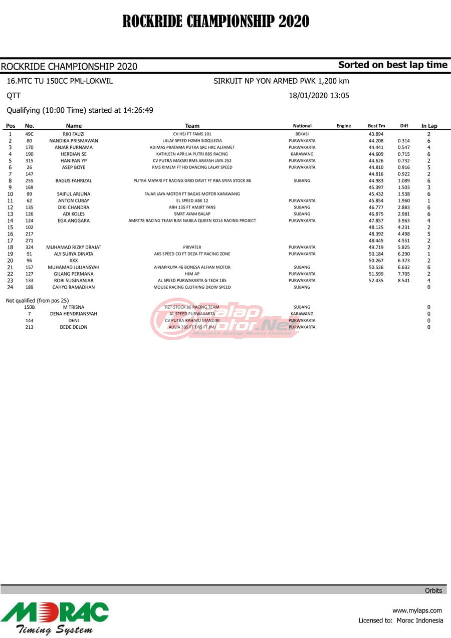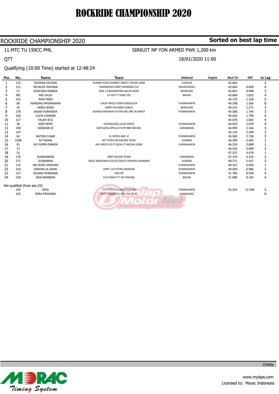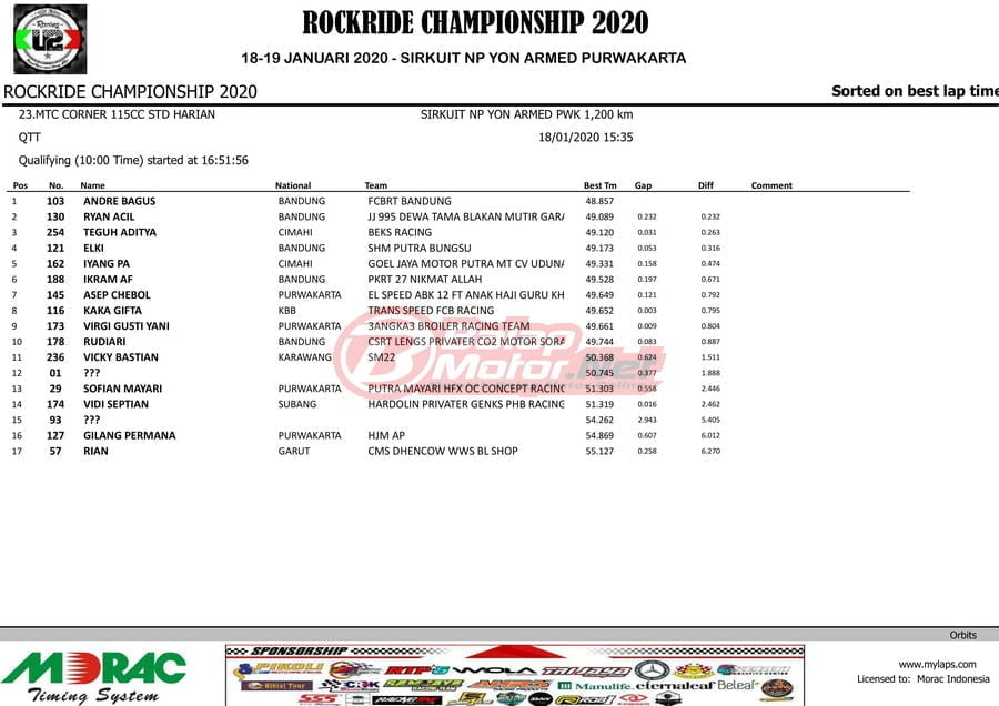 BalapMotor.Net – Berikut merupakan hasil dari sesi Kualifikasi (QTT) pada gelaran RockRide Championship 2020 yang berlangsung di sirkuit NP Yon Armed Purwakarta pada 18 Januari 2020. | Tim