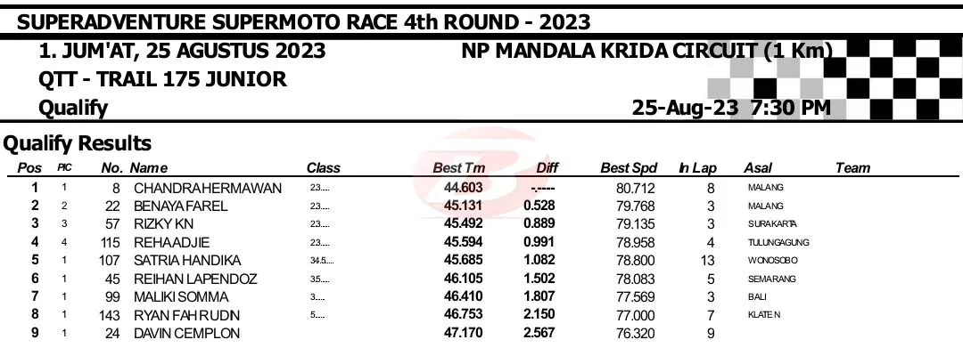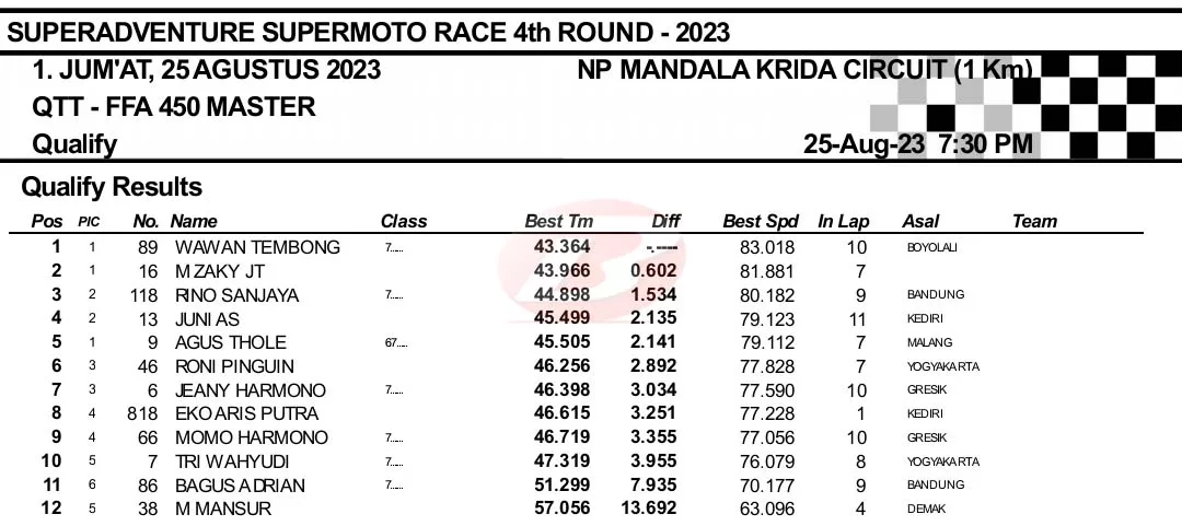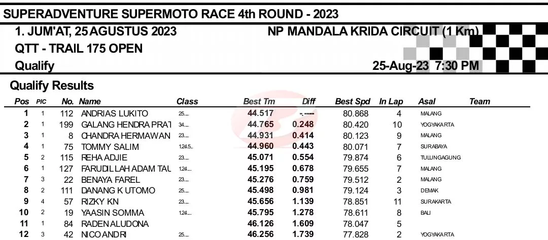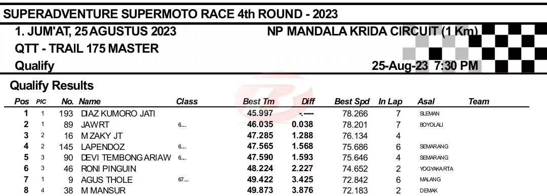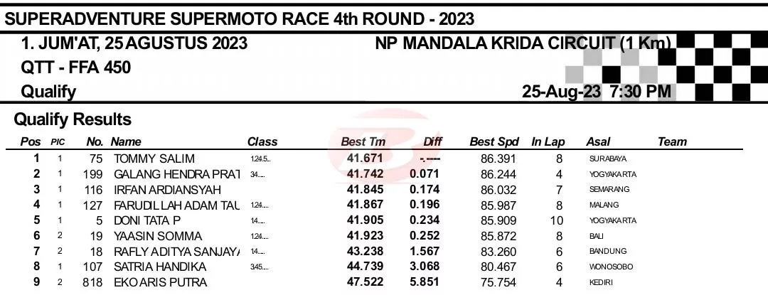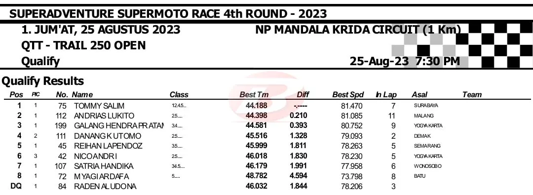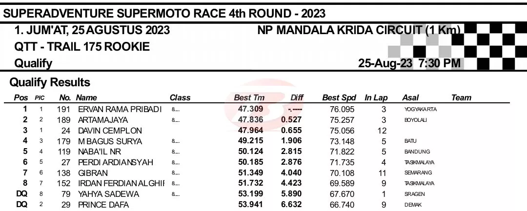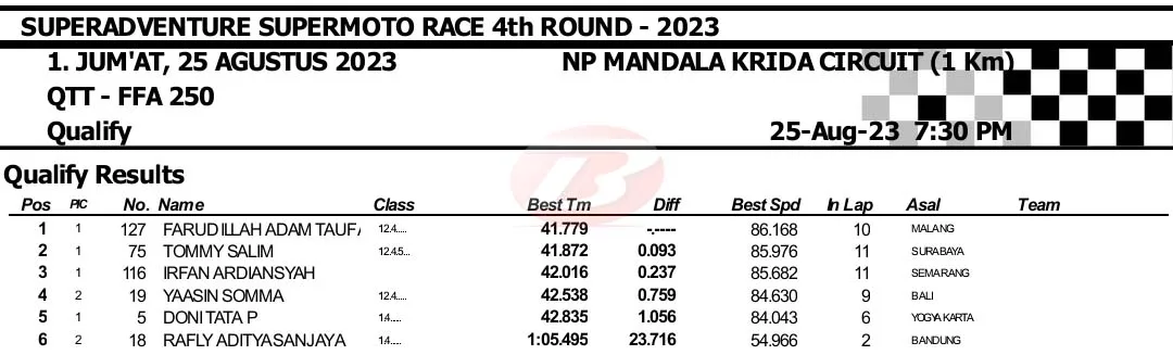 BalapMotor.Net – Berikut merupakan hasil kualifikasi Superadventure Supermoto Race putaran keempat yang berlangsung di sirkuit NP. Stadion Mandala Krida, Yogyakarta pada Jumat 25 Agustus 2023. (***)