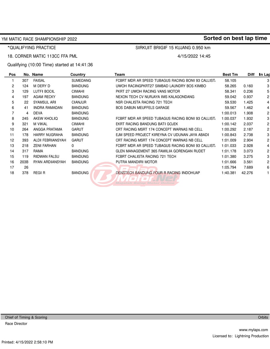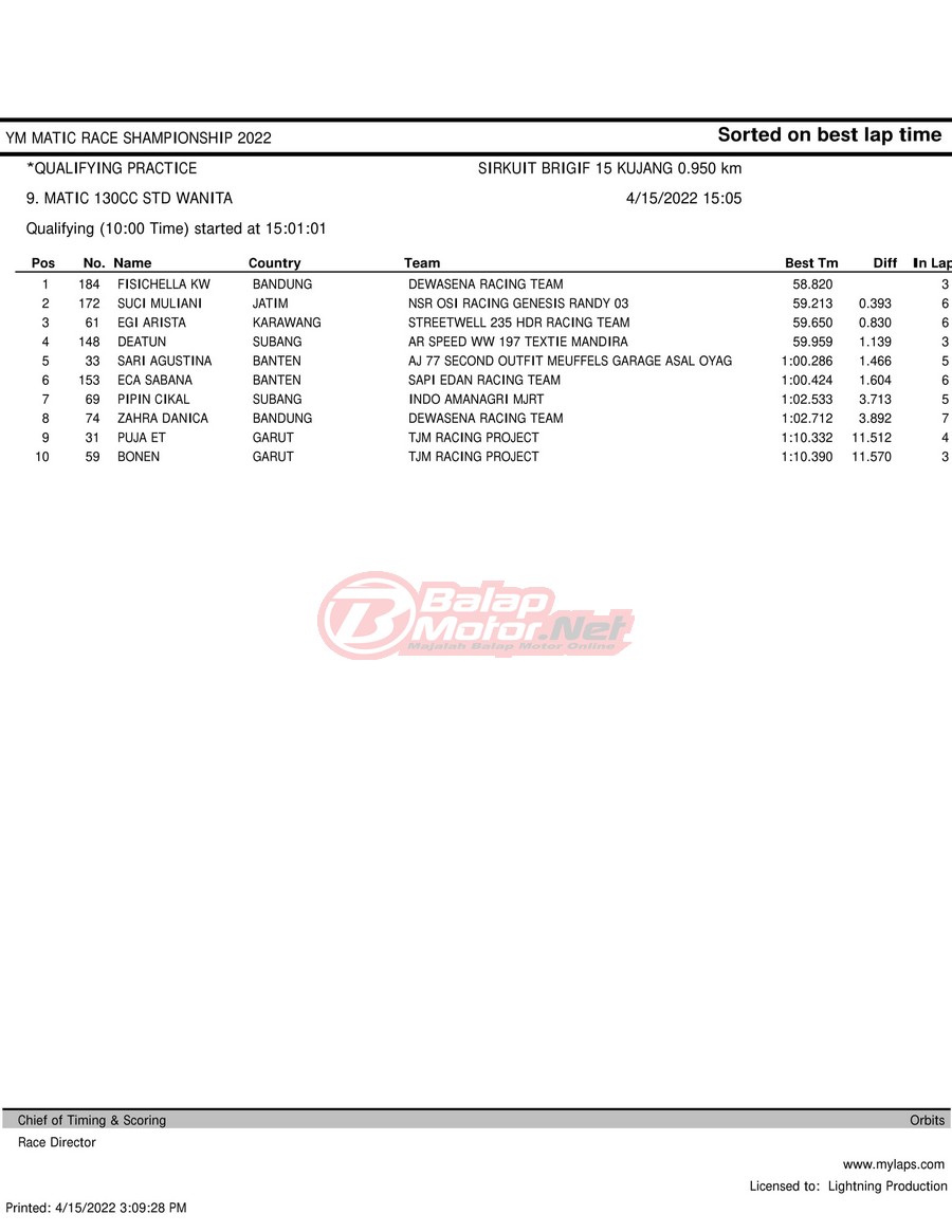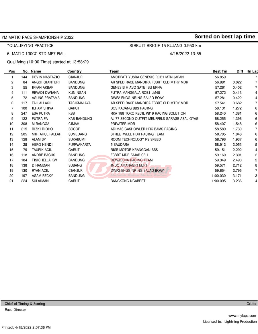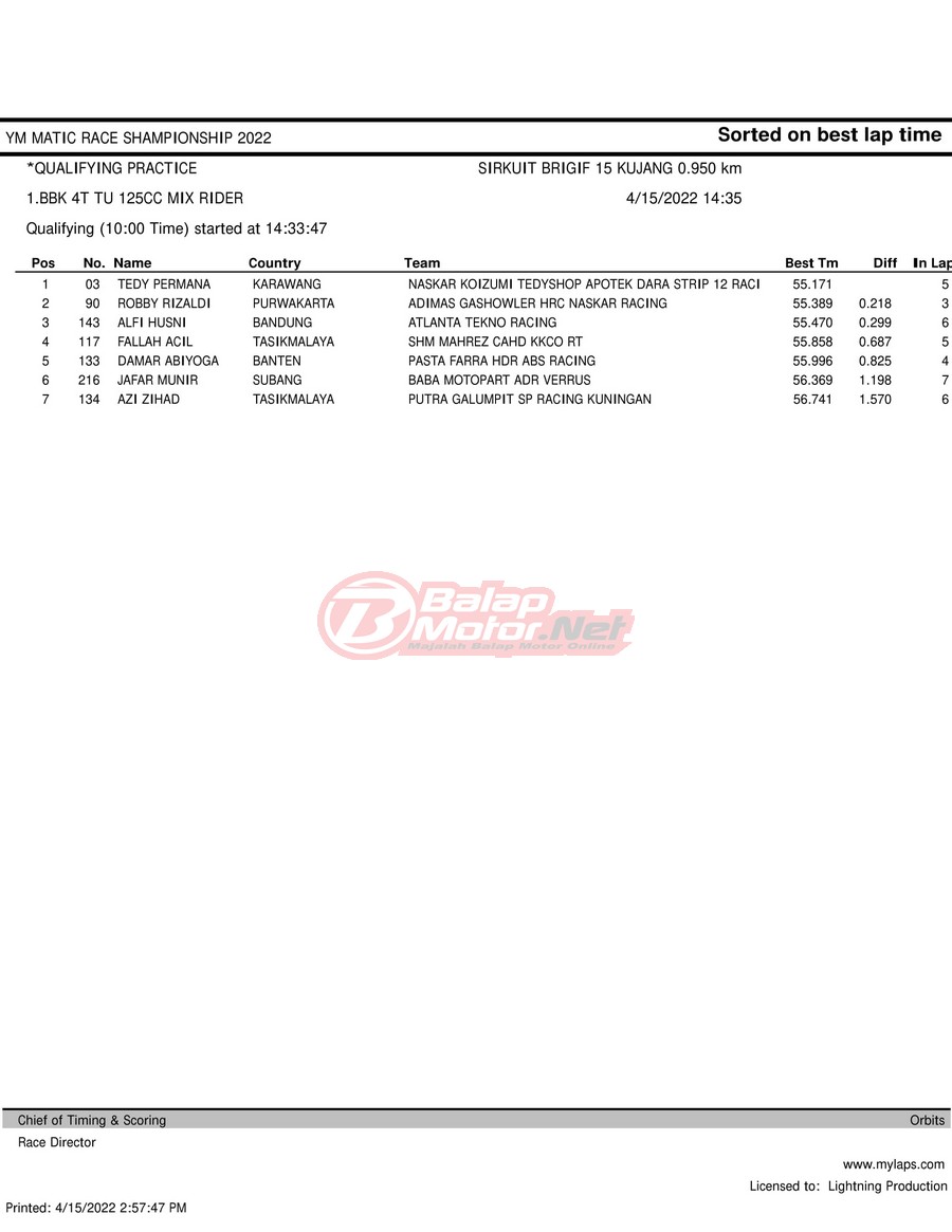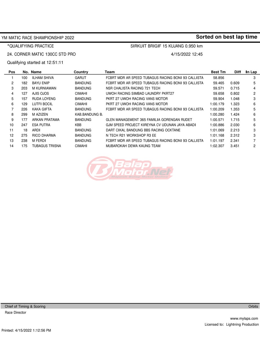 BalapMotor.Net – Berikut merupakan hasil kualifikasi (QTT) dari gelaran YM Matic Race Championship 2022 yang berlangsung di sirkuit NP Brigif 15 Kujang II Cimahi, Jawa Barat pada hari Jumat 15 April 2022.