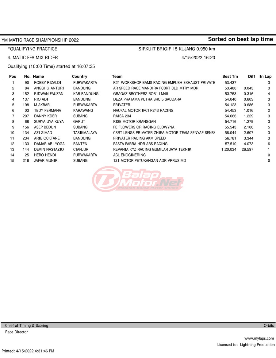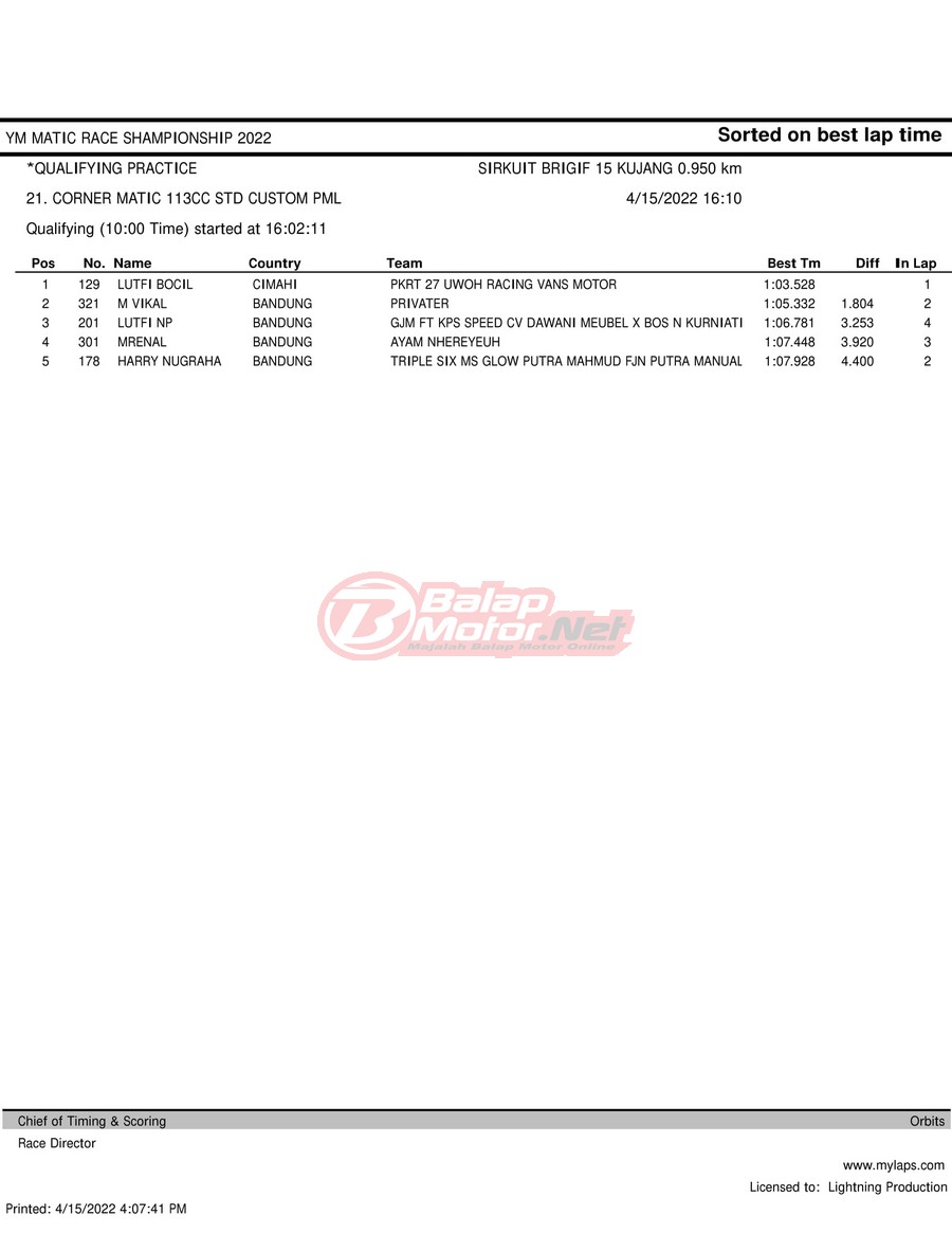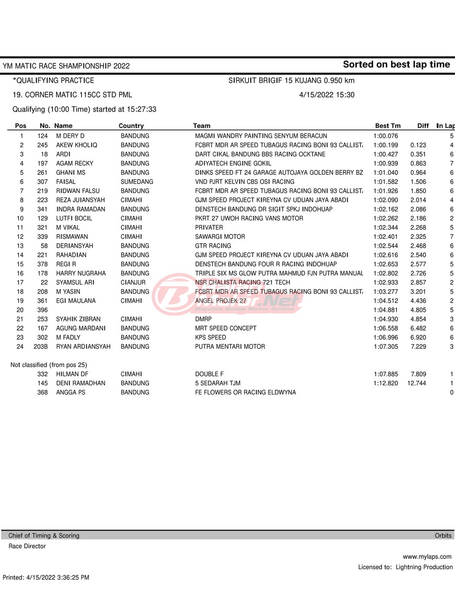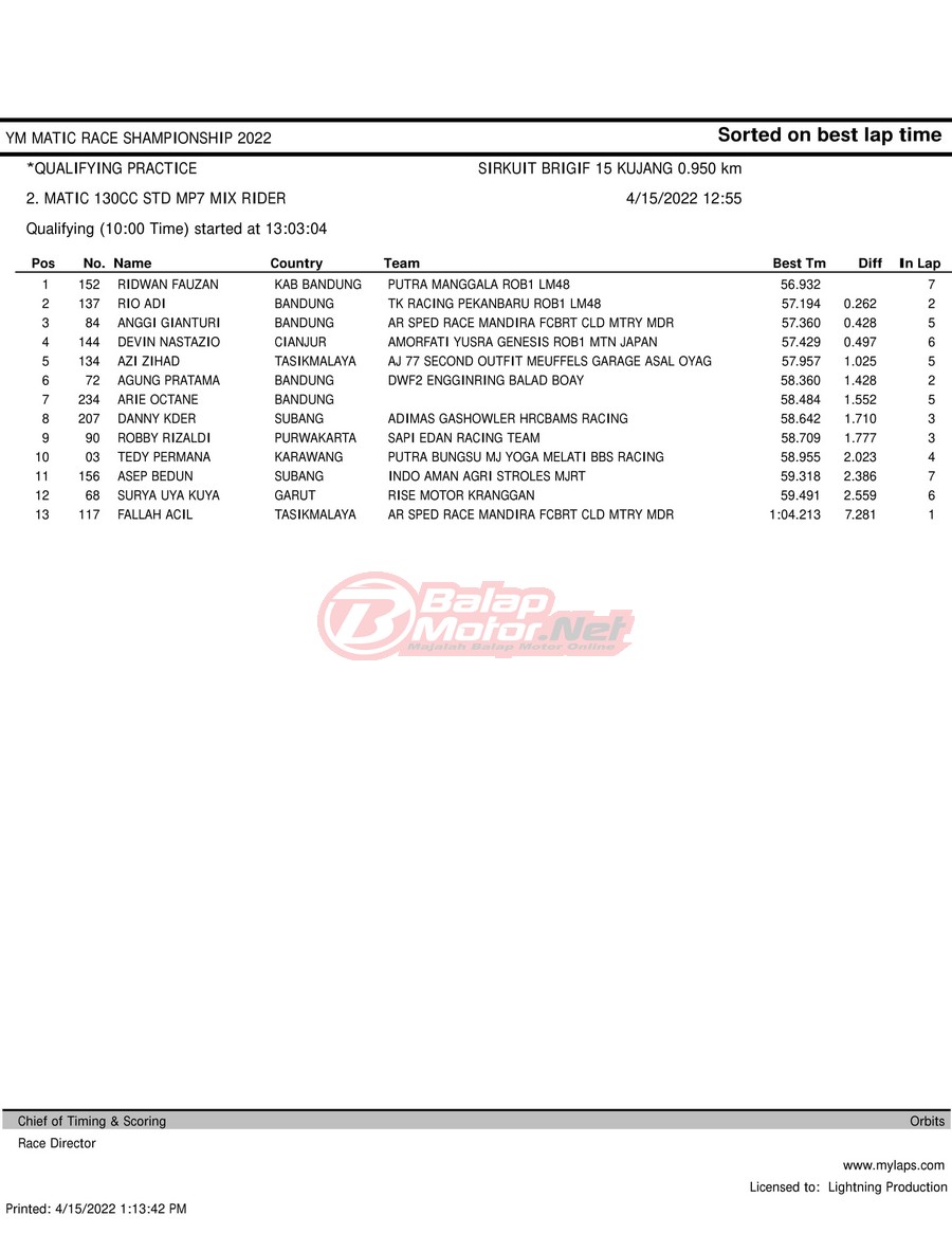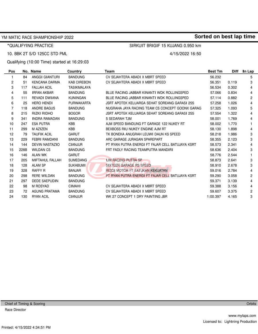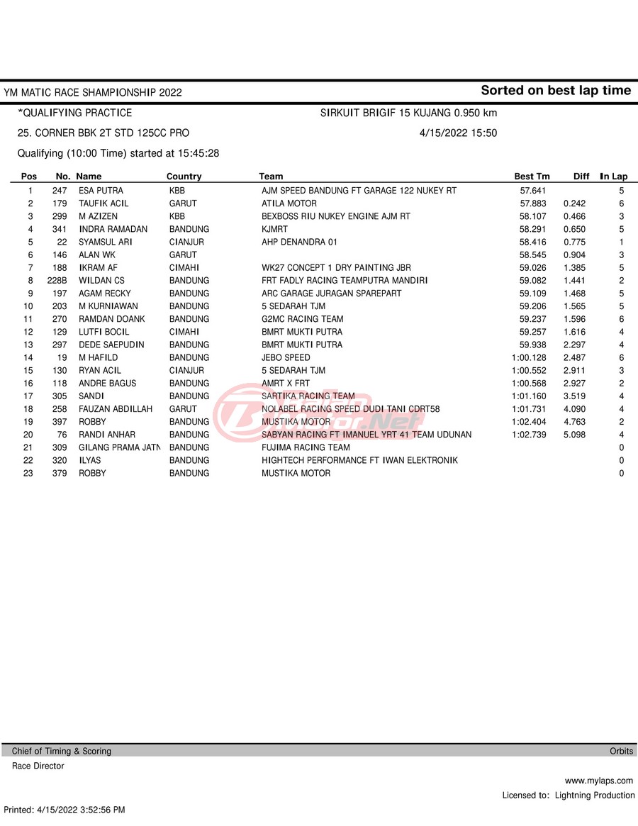 BalapMotor.Net – Berikut merupakan hasil kualifikasi (QTT) dari gelaran YM Matic Race Championship 2022 yang berlangsung di sirkuit NP Brigif 15 Kujang II Cimahi, Jawa Barat pada hari Jumat 15 April 2022.