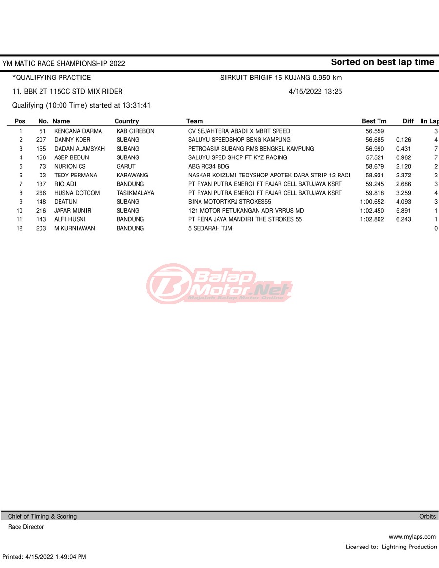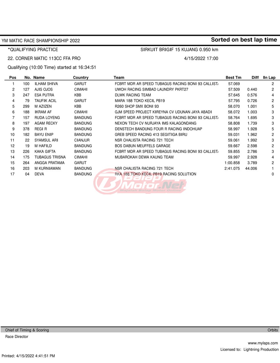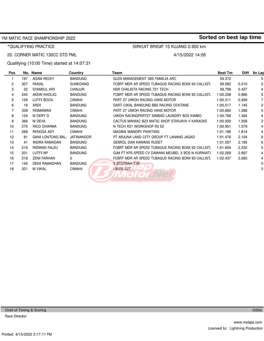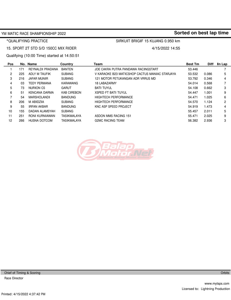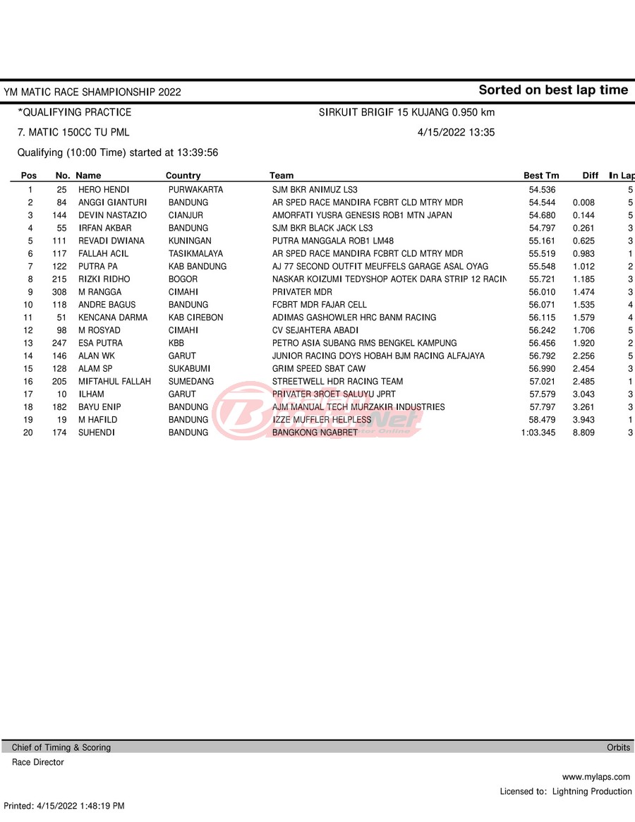 BalapMotor.Net – Berikut merupakan hasil kualifikasi (QTT) dari gelaran YM Matic Race Championship 2022 yang berlangsung di sirkuit NP Brigif 15 Kujang II Cimahi, Jawa Barat pada hari Jumat 15 April 2022.