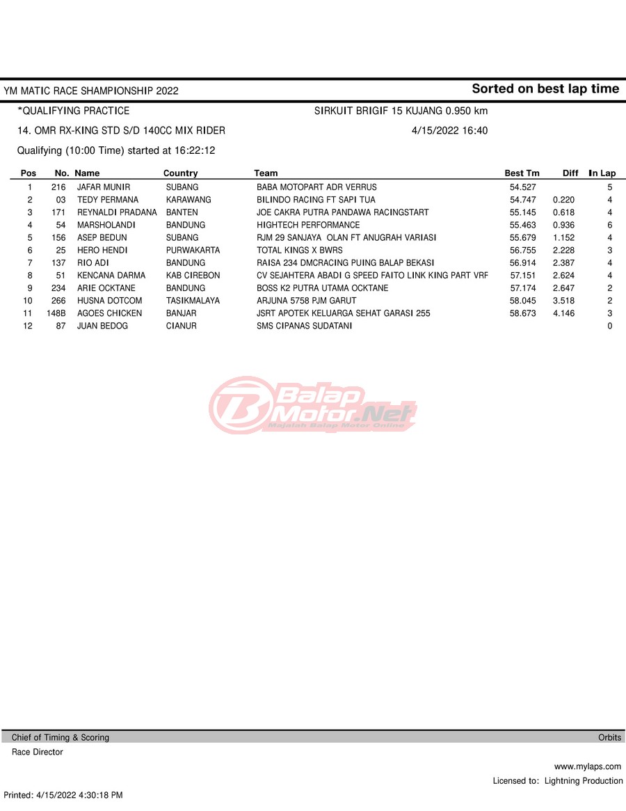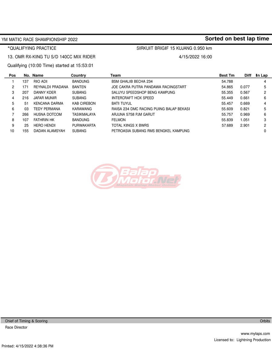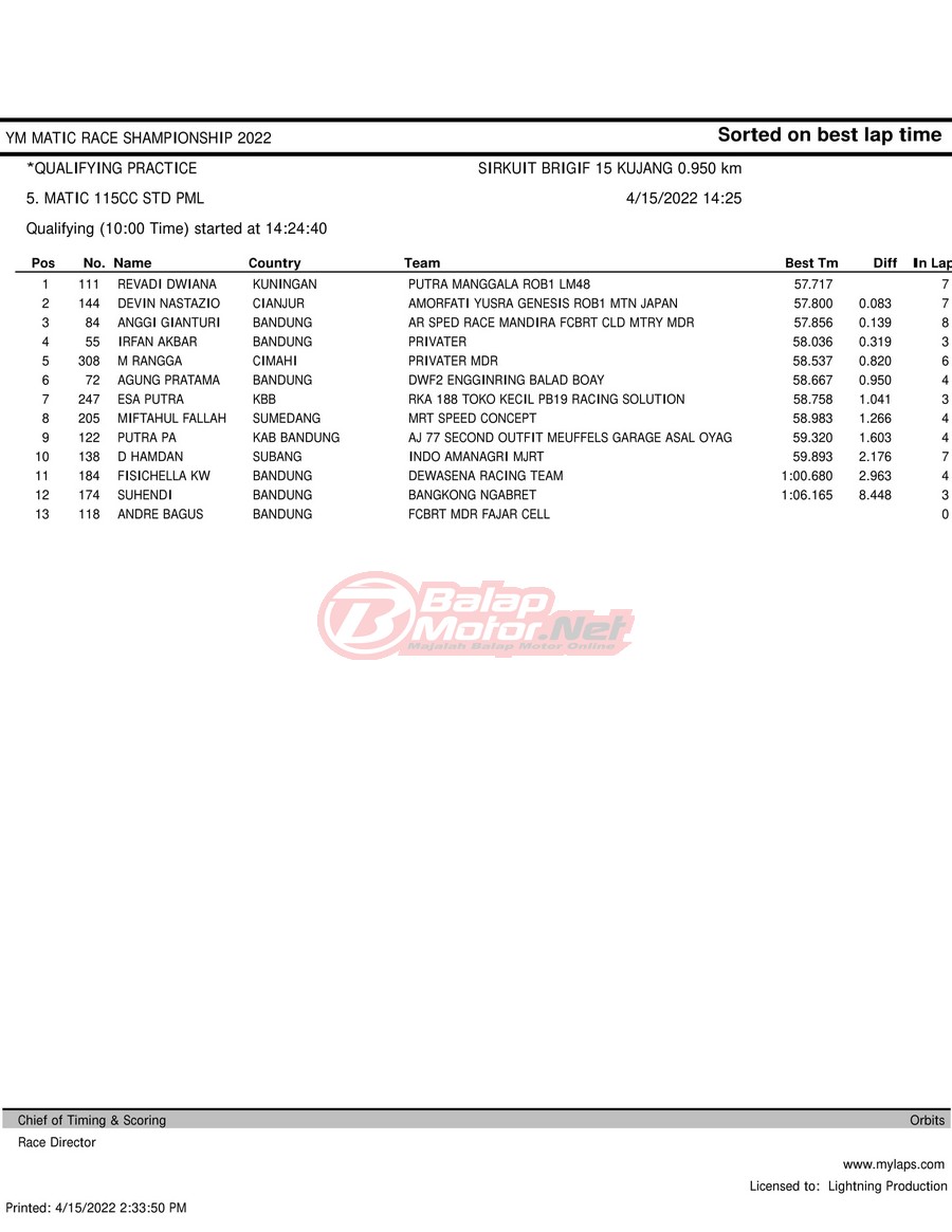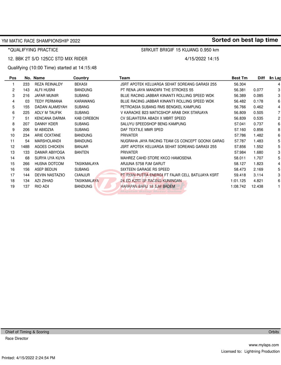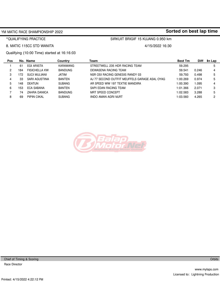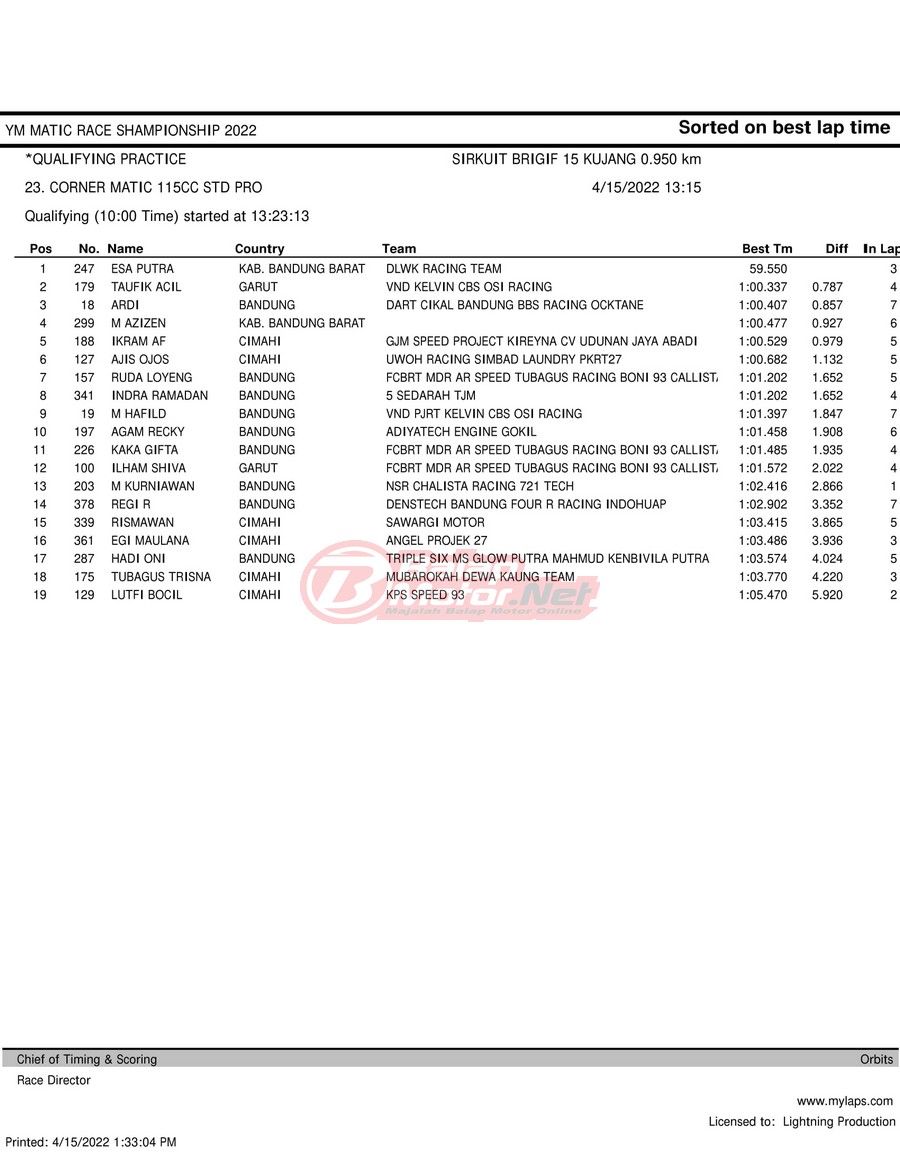 BalapMotor.Net – Berikut merupakan hasil kualifikasi (QTT) dari gelaran YM Matic Race Championship 2022 yang berlangsung di sirkuit NP Brigif 15 Kujang II Cimahi, Jawa Barat pada hari Jumat 15 April 2022.