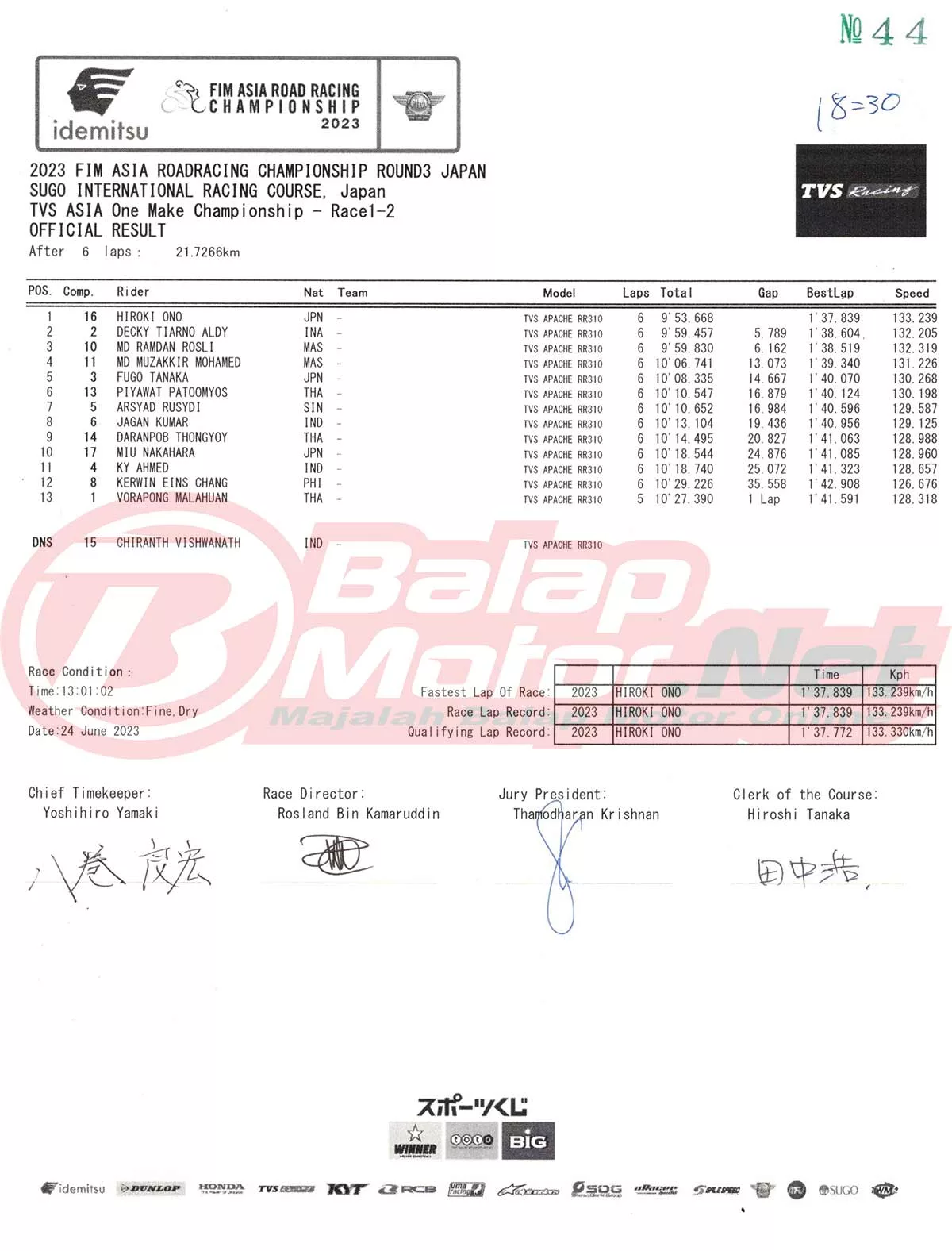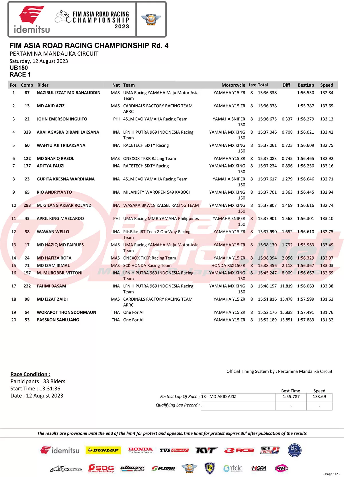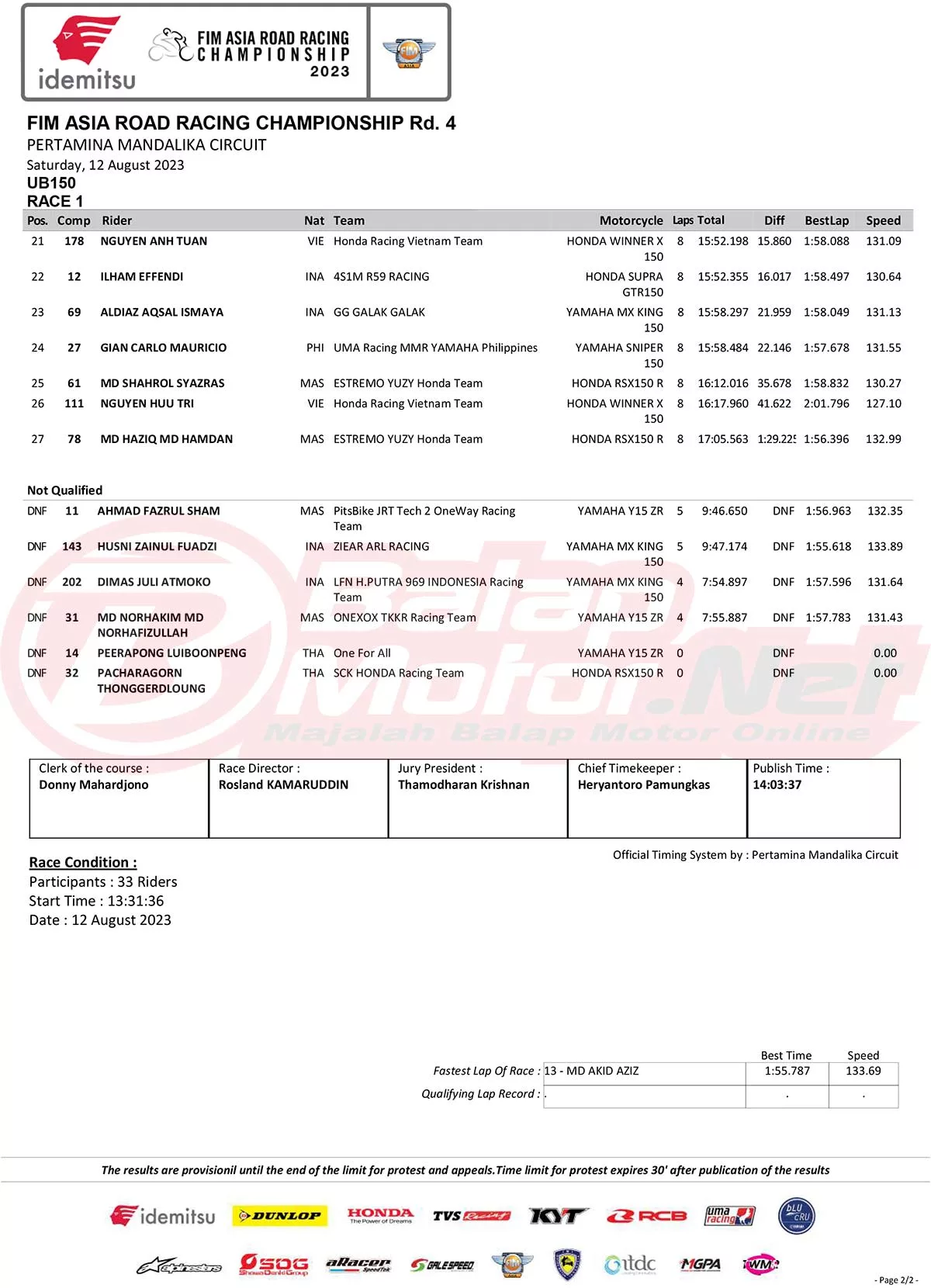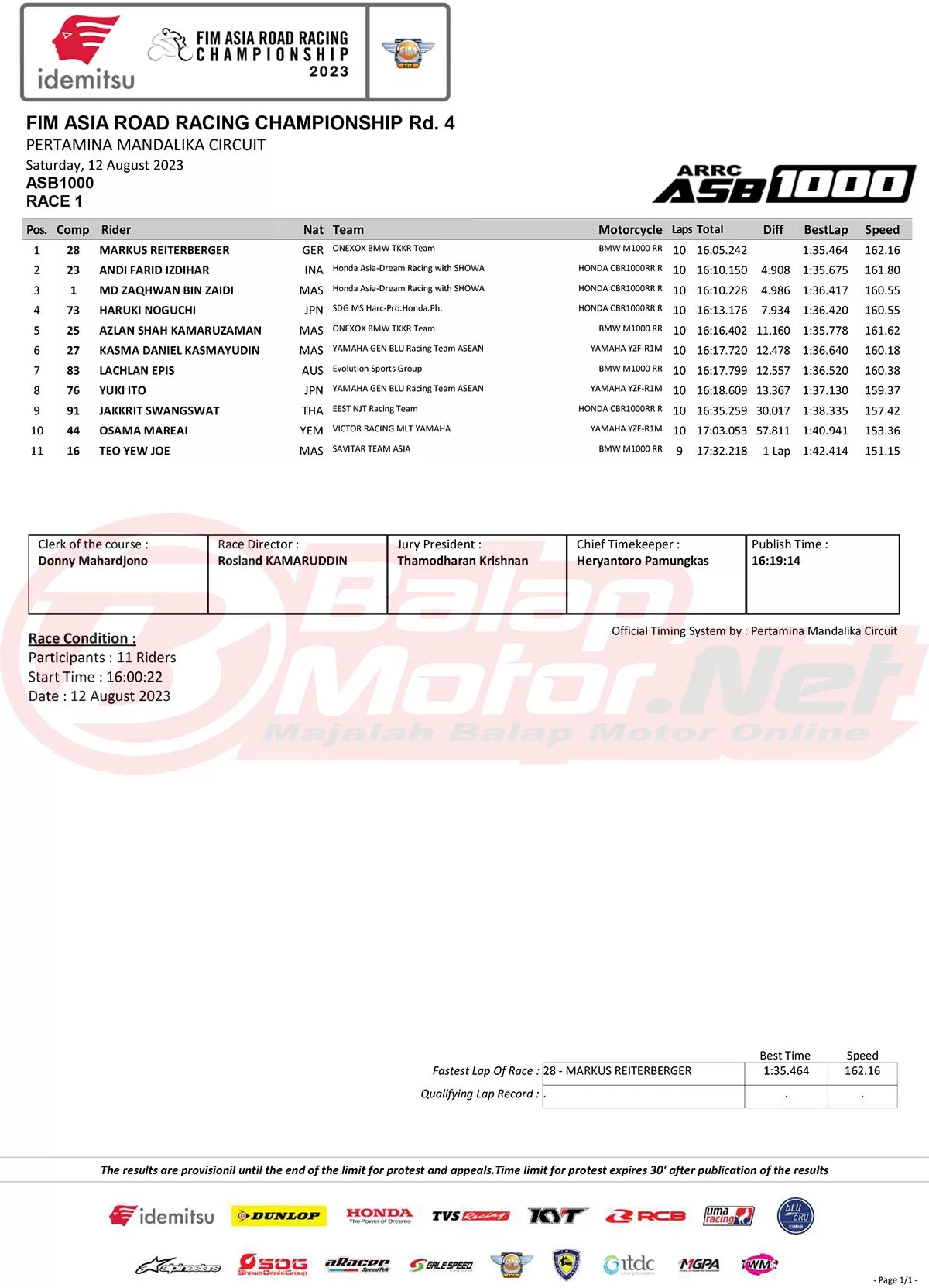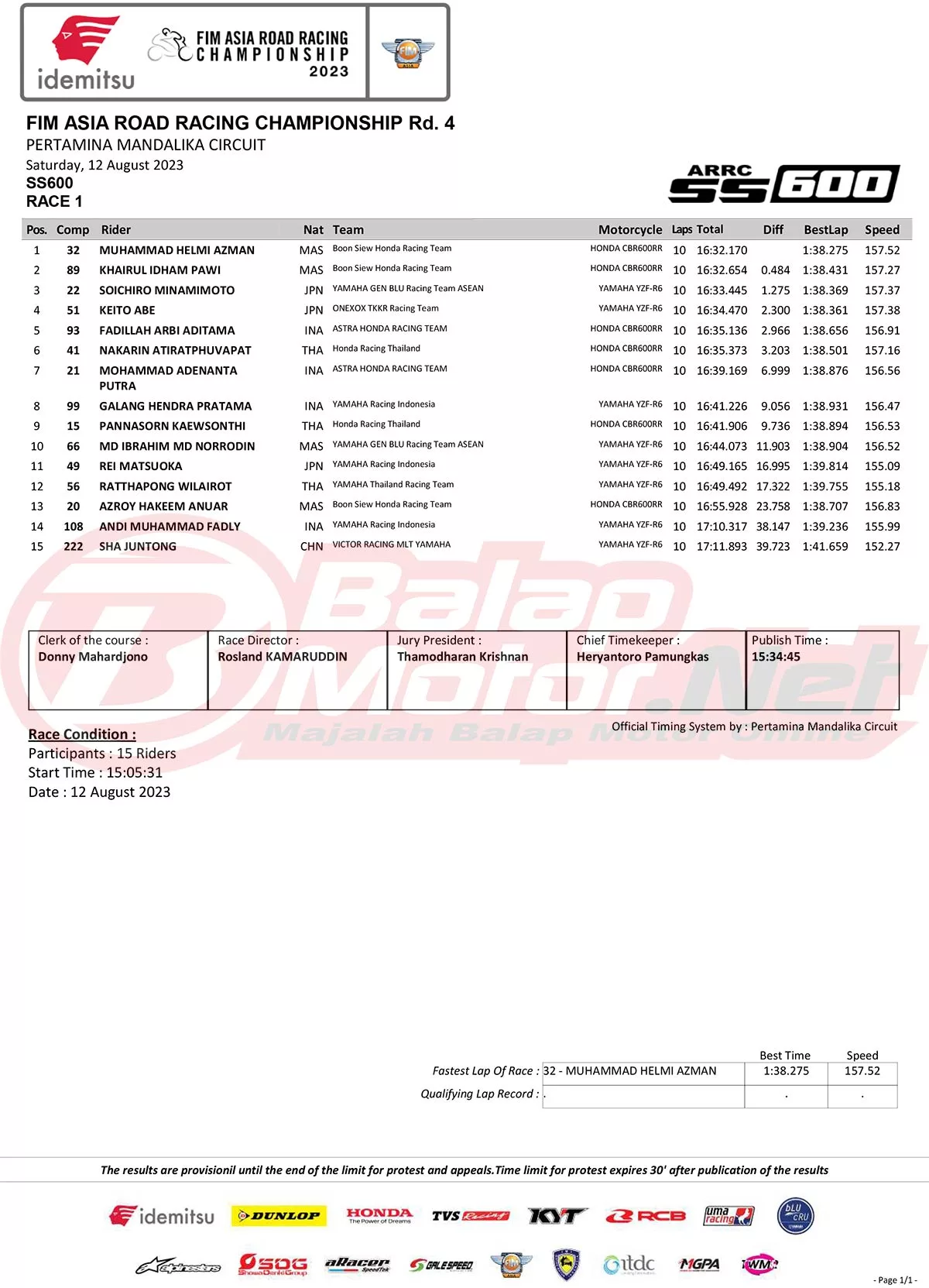 Hasil Race 1 Asia Road Racing Championship (ARRC) Mandalika 2023Penulis Didit Luvo - 12/08/2023 BalapMotor.Net – Berikut merupakan hasil race 1 dari gelaran FIM Asia Road Racing Championship (FIM ARRC) ronde 4 2023 yang digelar di Pertamina Mandalika Circuit, Lombok-NTB pada hari Sabtu 12 Agustus 2023. (**)