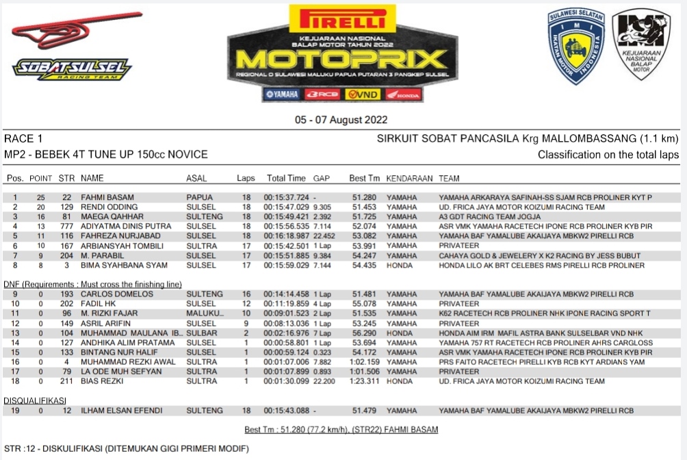 Hasil Race 1 Kejurnas Motoprix Pangkep – Sulsel 2022Penulis BalapMotor.net - 06/08/2022 BalapMotor.Net – Berikut kami paparkan hasil race 1 kejuaraan nasional balap motor Motoprix regional D putaran ketiga yang berlangsung di sirkuit Sobat Pancasila KRG Mallombassang, Pangkep, Sulawesi Selatan pada Sabtu 6 Agustus 2022. | Anto