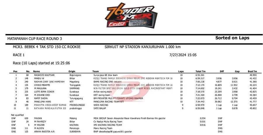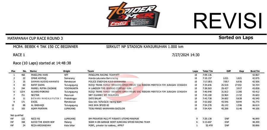 BalapMotor.Net – Berikut merupakan hasil Race 1 kejuaraan Matapanah Cup Race (MCR) Seri Ketiga yang berlangsung di sirkuit NP. Kanjuruhan, Malang, Jawa Timur pada Sabtu 27 Juli 2024. (***)