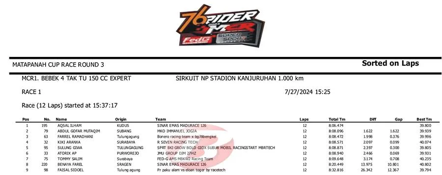 BalapMotor.Net – Berikut merupakan hasil Race 1 kejuaraan Matapanah Cup Race (MCR) Seri Ketiga yang berlangsung di sirkuit NP. Kanjuruhan, Malang, Jawa Timur pada Sabtu 27 Juli 2024. (***)