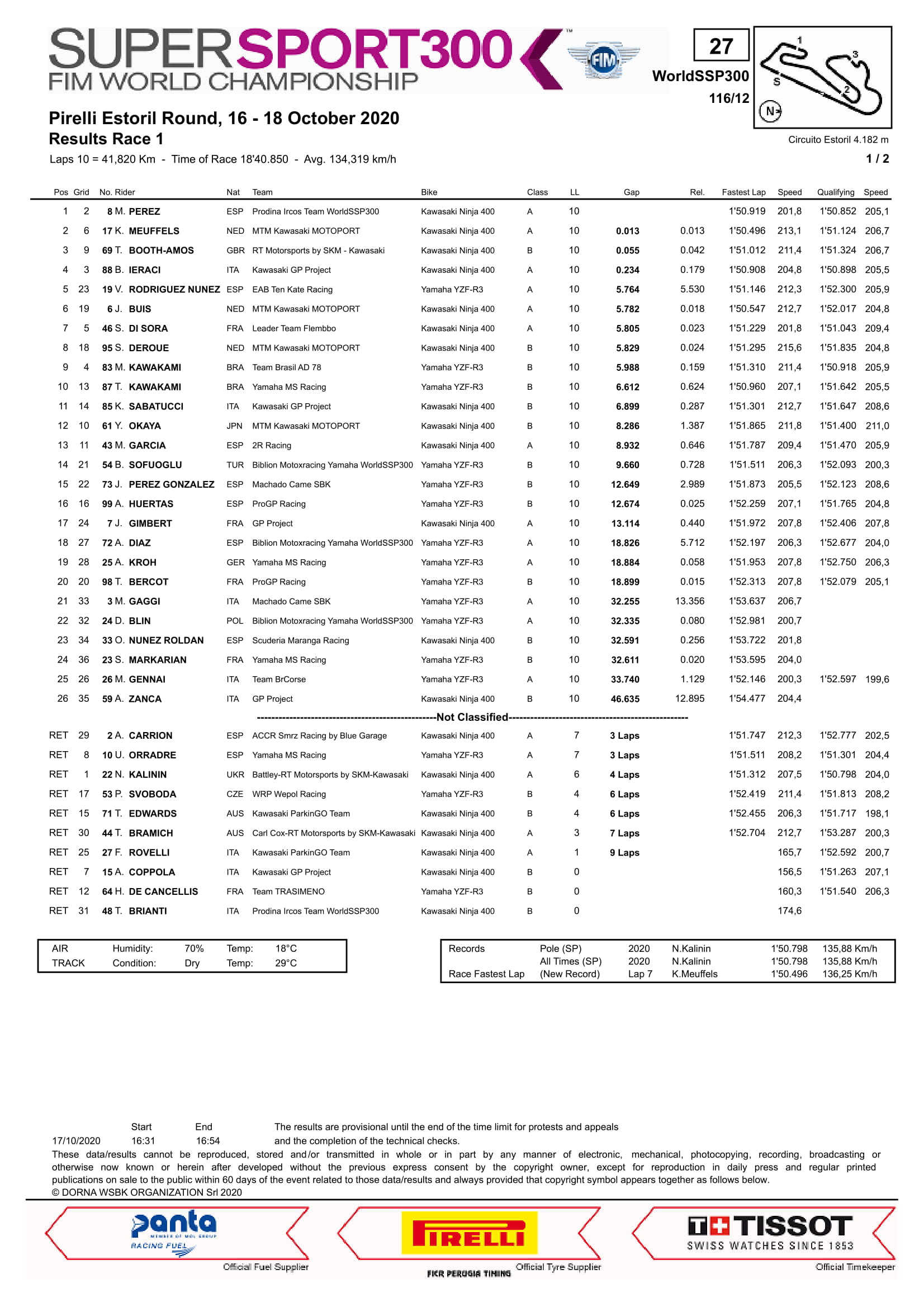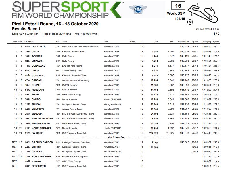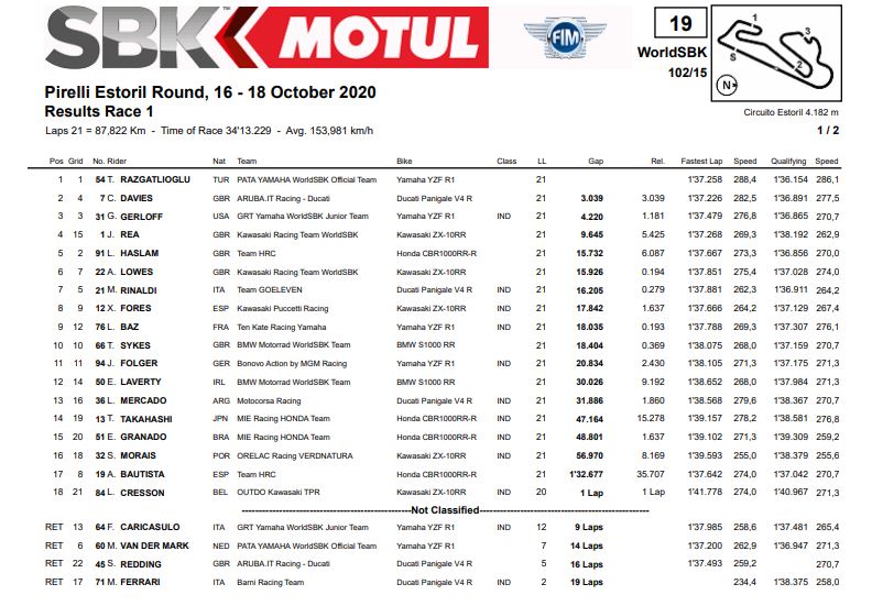 Hasil Race 1 Semua Kelas WorldSBK Estoril 2020Penulis Fajar Sulistiono - 17/10/2020Foto: WSBK BalapMotor.Net – Berikut merupakan hasil race 1 dari semua kelas pada gelaran WorldSBK Estoril 2020 yang berlangsung di sirkuit Estoril, Portugal pada hari sabtu 17 oktober 2020.