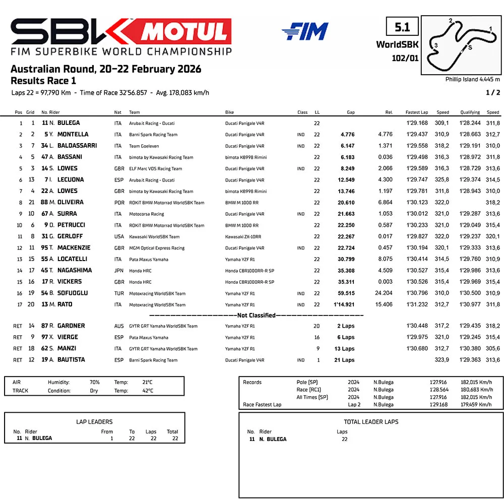BalapMotor.Net – Pembalap Nicolo Bulega dari Aruba.it Racing Ducati tampil dominan di Race 1 WorldSBK seri pembuka musim 2026 di Phillip Island, Australia. Bulega memimpin dari awal hingga akhir dan memenangi balapan dengan selisih hampir lima detik atas pesaing terdekatnya, Yari Montella, diikuti oleh Lorenzo Baldassarri yang menyelesaikan podium ketiga. Hasil ini mengantarkan Bulega memimpin klasemen sementara kejuaraan dunia Superbike.
