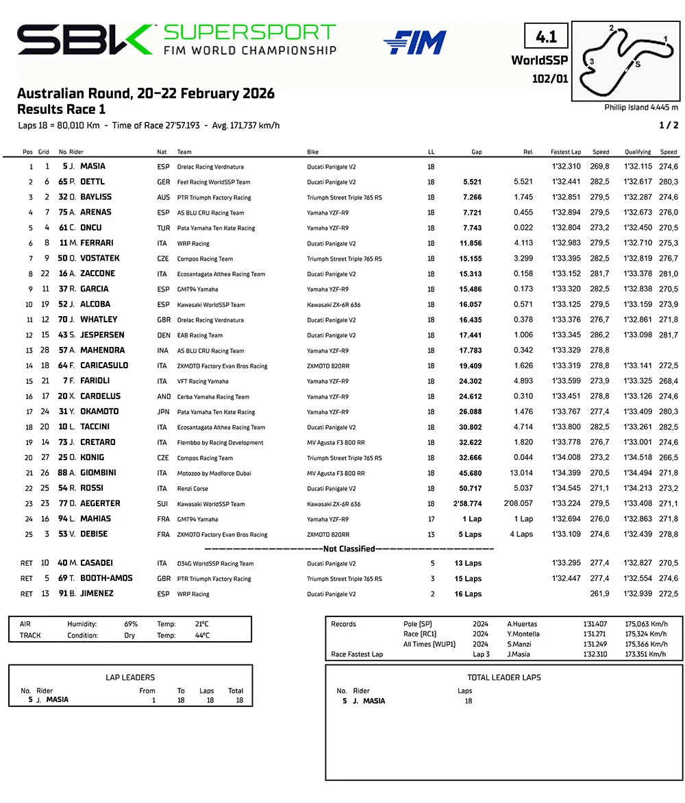 Di kelas WorldSSP (Supersport), Jaume Masia meraih kemenangan Race 1 di Phillip Island setelah 18 lap balap. Ia unggul atas Philipp Oettl dan Oli Bayliss yang melengkapi podium. Sementara itu, pembalap Indonesia Aldi Satya Mahendra — meski start dari posisi terakhir — menunjukkan performa kuat dengan finis di posisi ke-13 dan mengumpulkan 3 poin penting untuk Kejuaraan dunia Supersport.